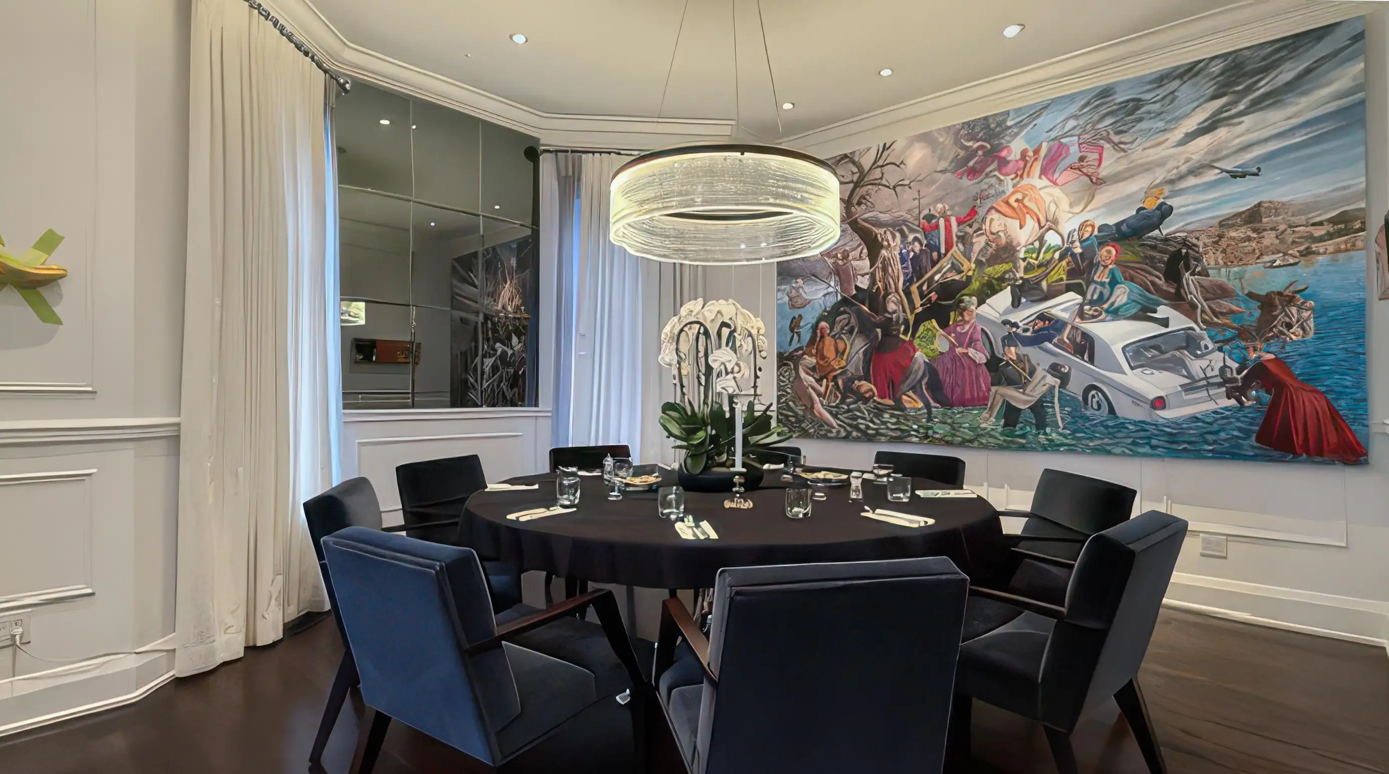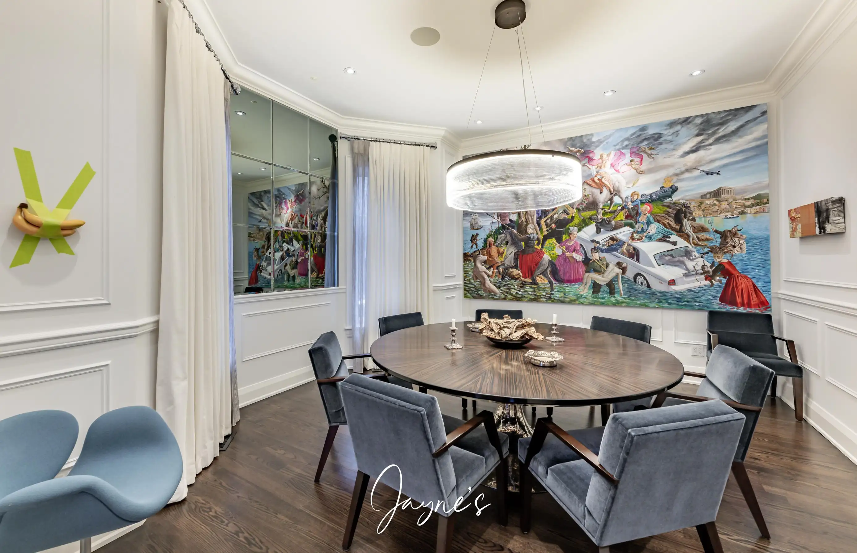Formal dining room features a round table with seating for 8.