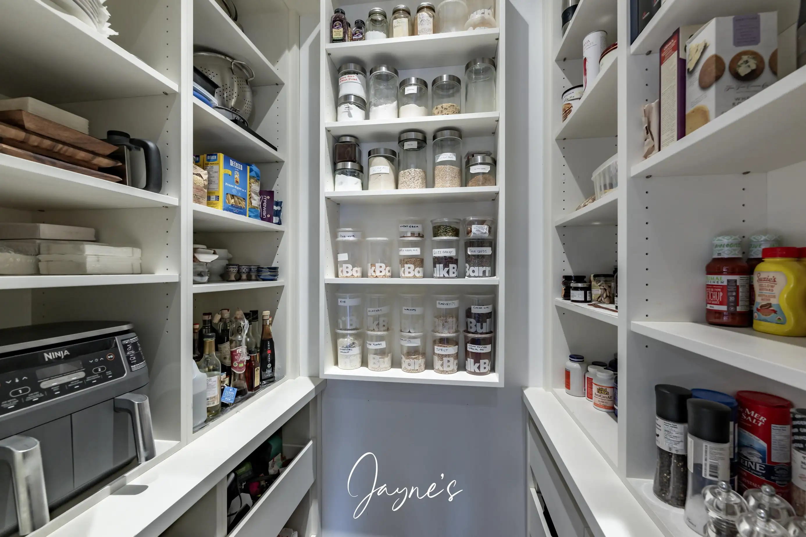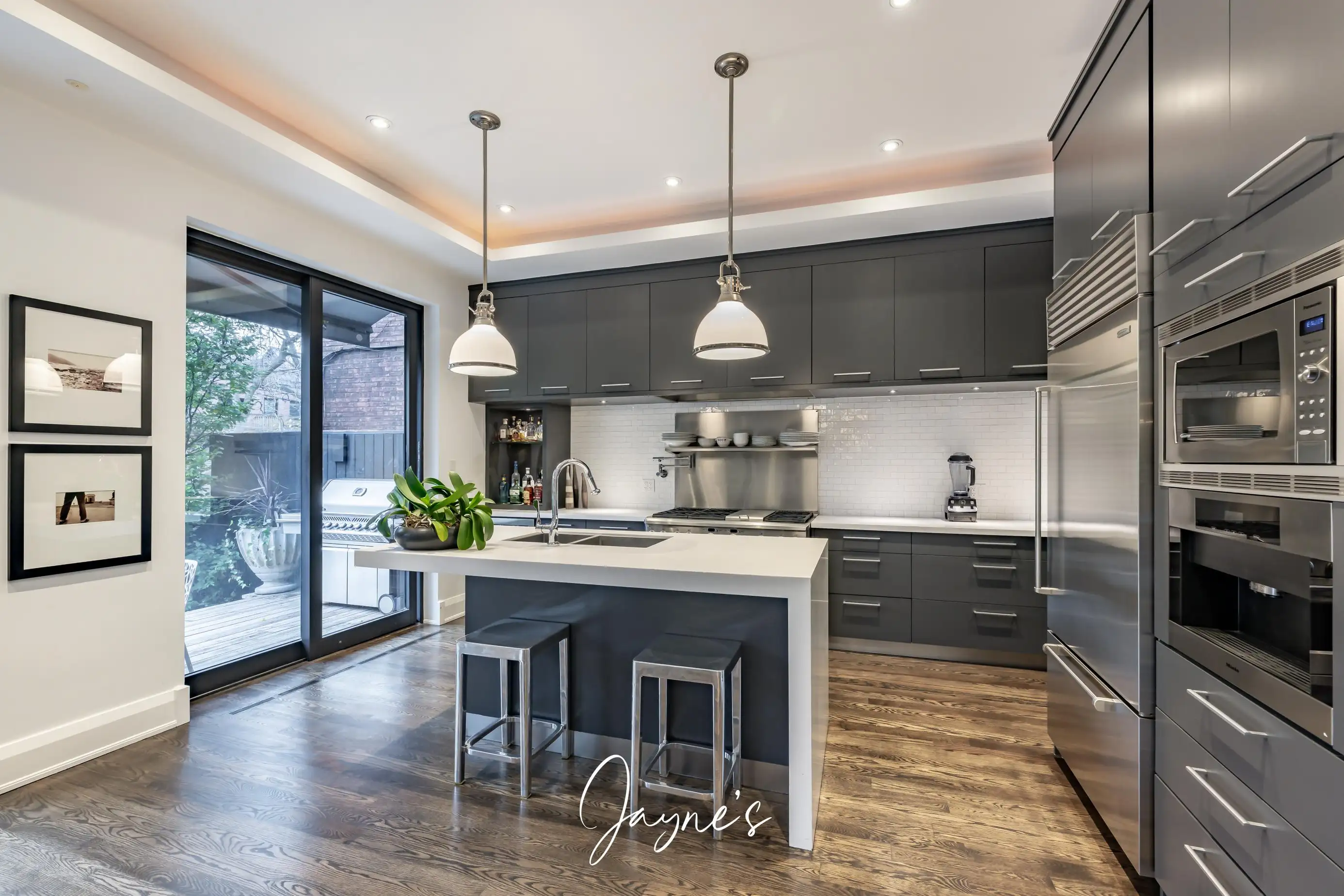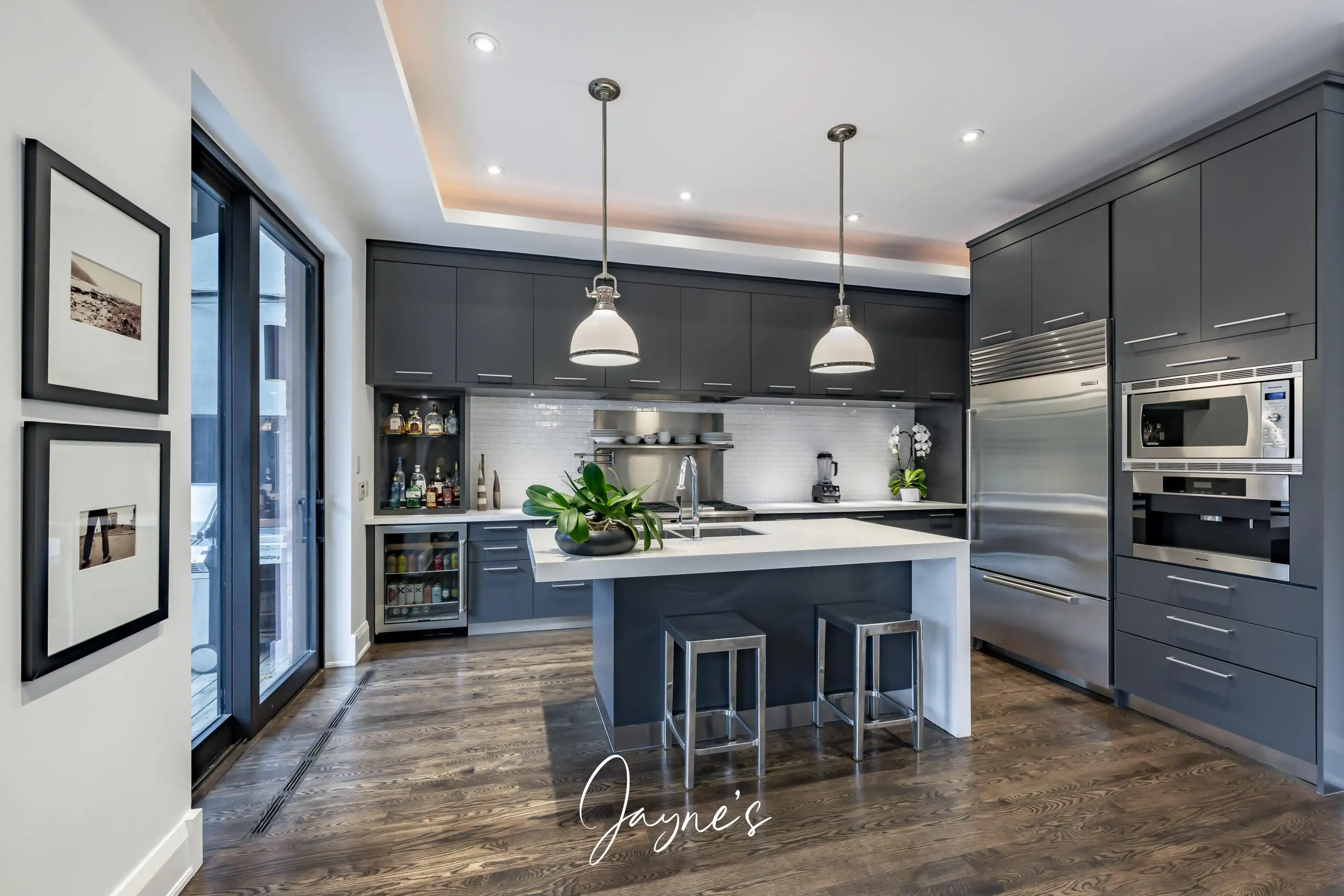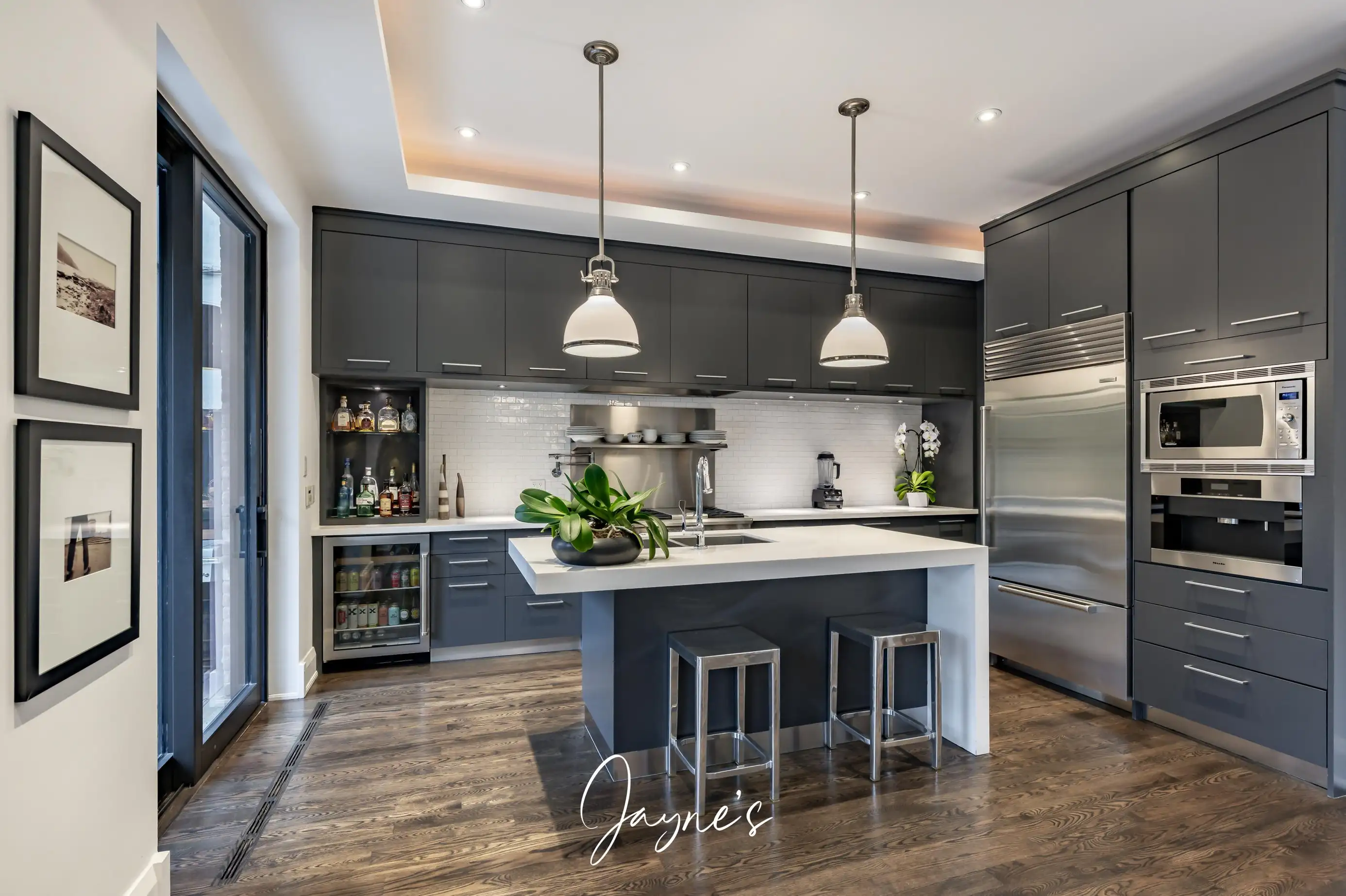 High-end appliances, island with 2 stools, pantry