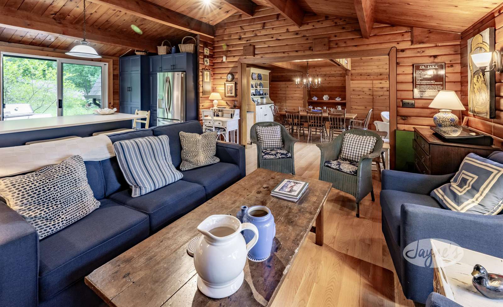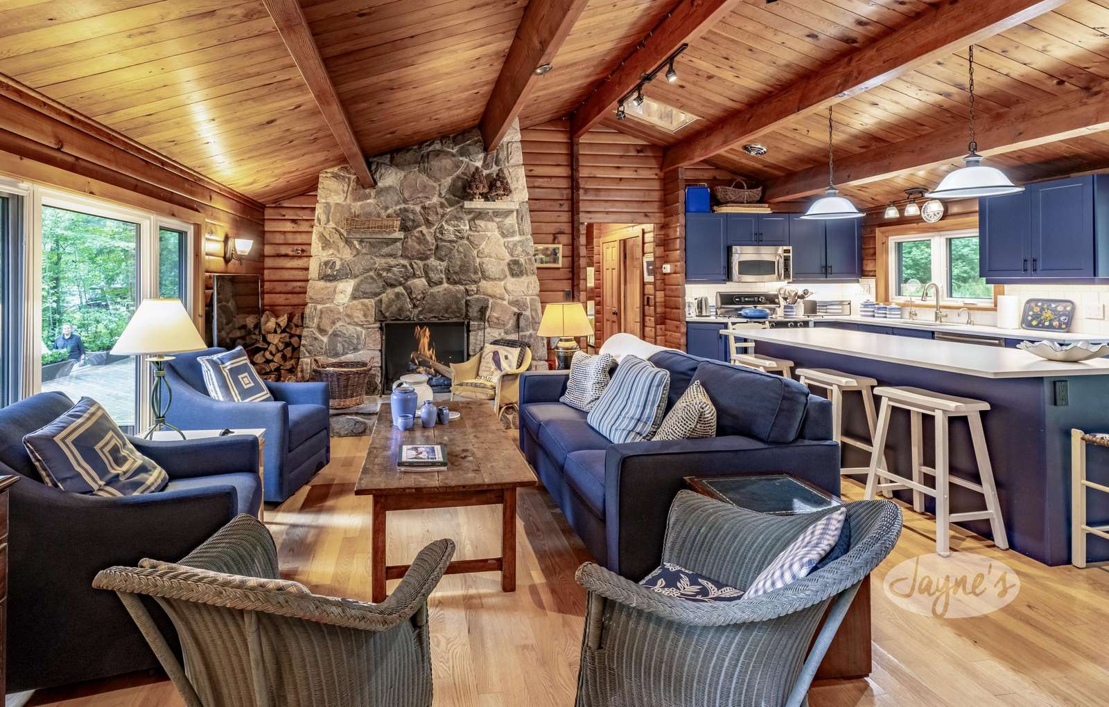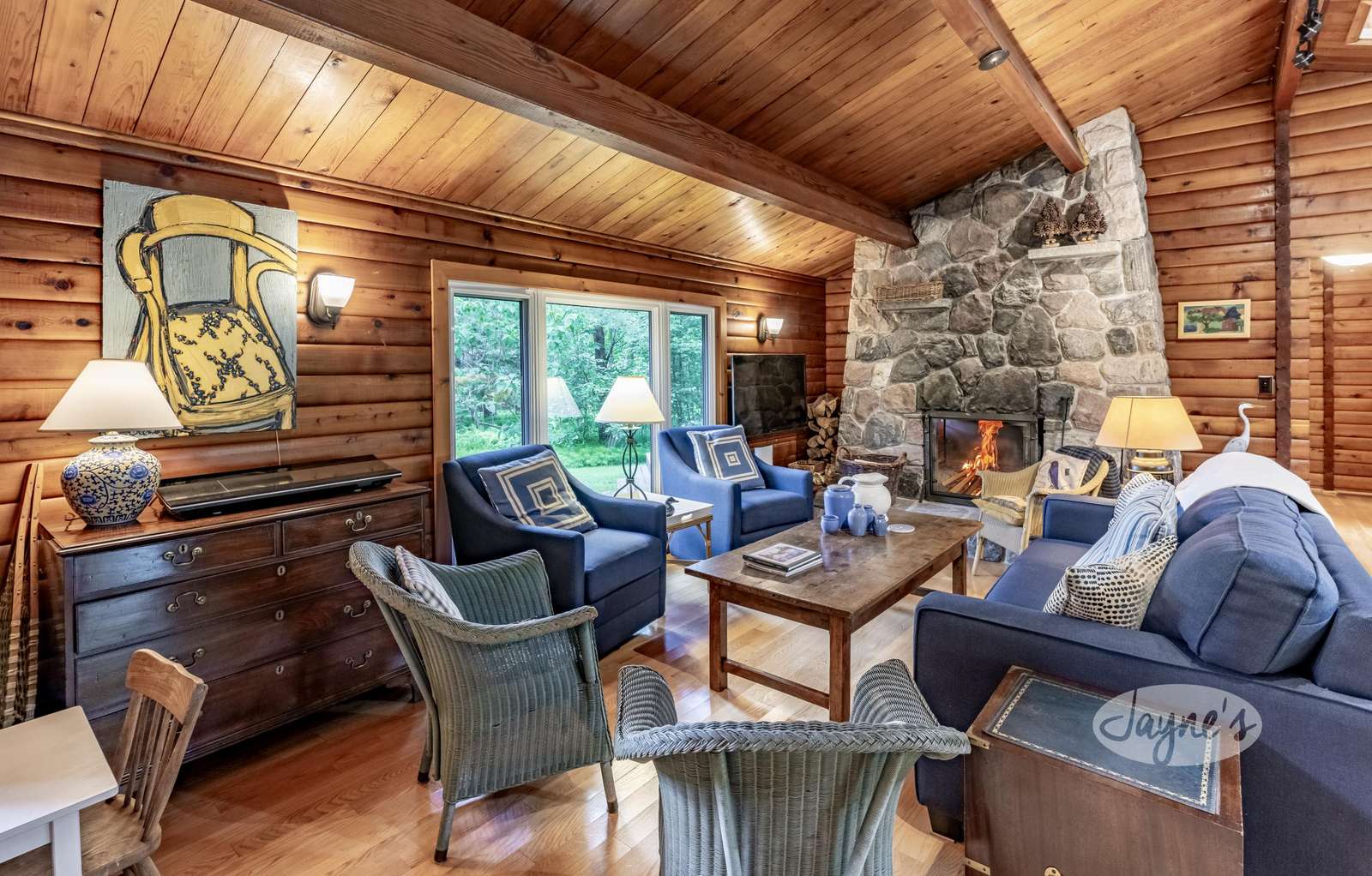 This lovely living room boasts all brand new furniture and a stone wood burning fireplace.
