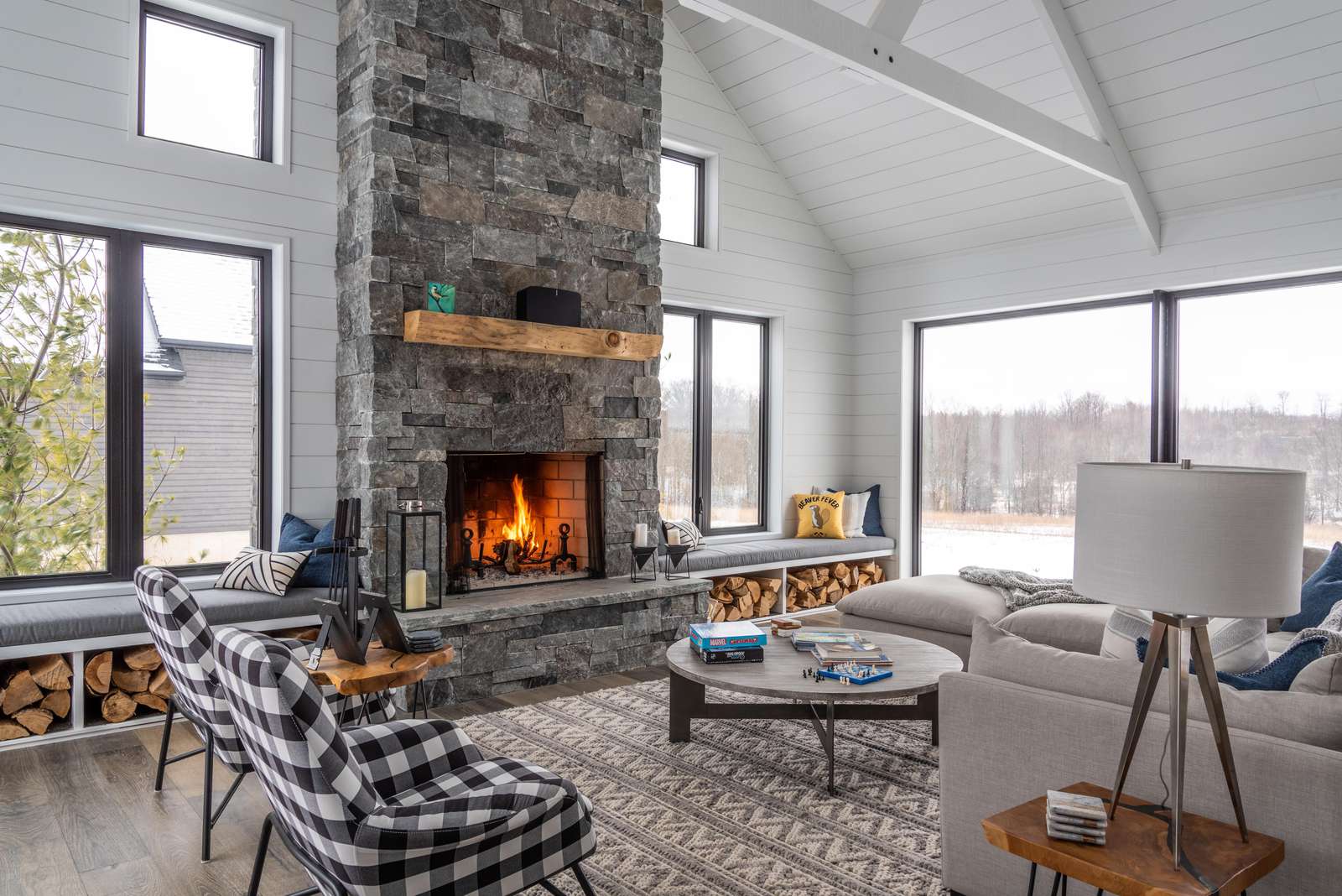 Your eye takes you up in this breathtaking great room with 18 foot ceilings. Very bright and open concept living space. Enjoy a cozy evening by the 18 foot stone wood-burning fireplace.