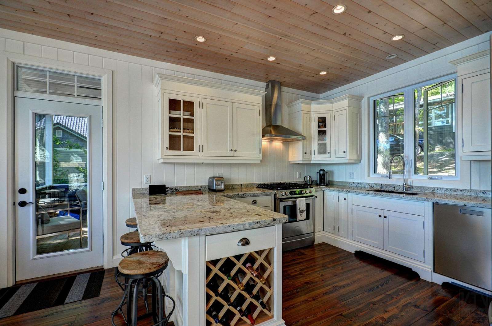 Stainless steel appliances with granite countertops, gas stove, built-in wine rack, and Nespresso machine