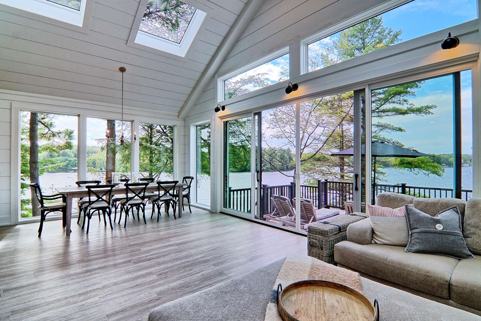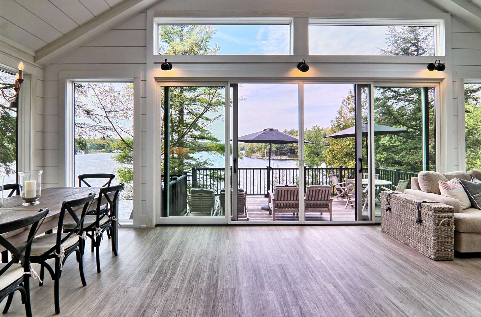 Adjoining the dining room, the living room features floor-to-ceiling windows providing an abundance of natural light. A walkout to the back deck is featured along this wall. Another L-shaped sofa surrounds a flatscreen TV.
