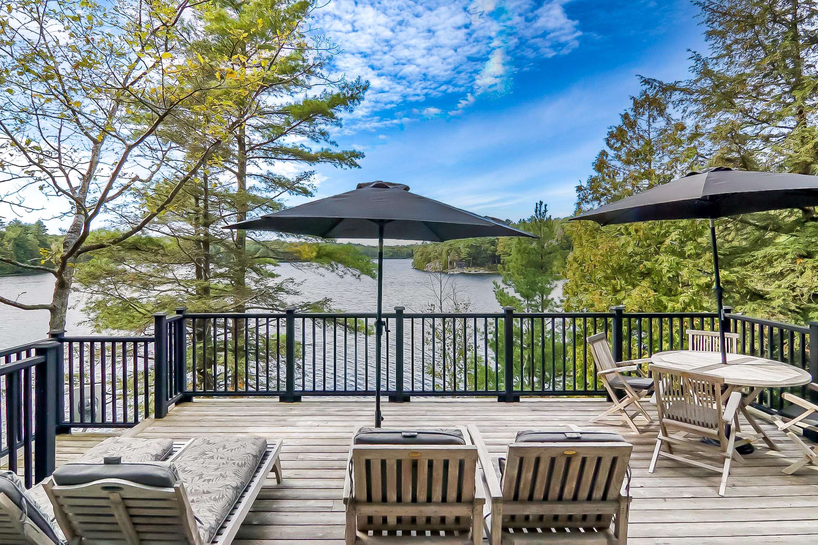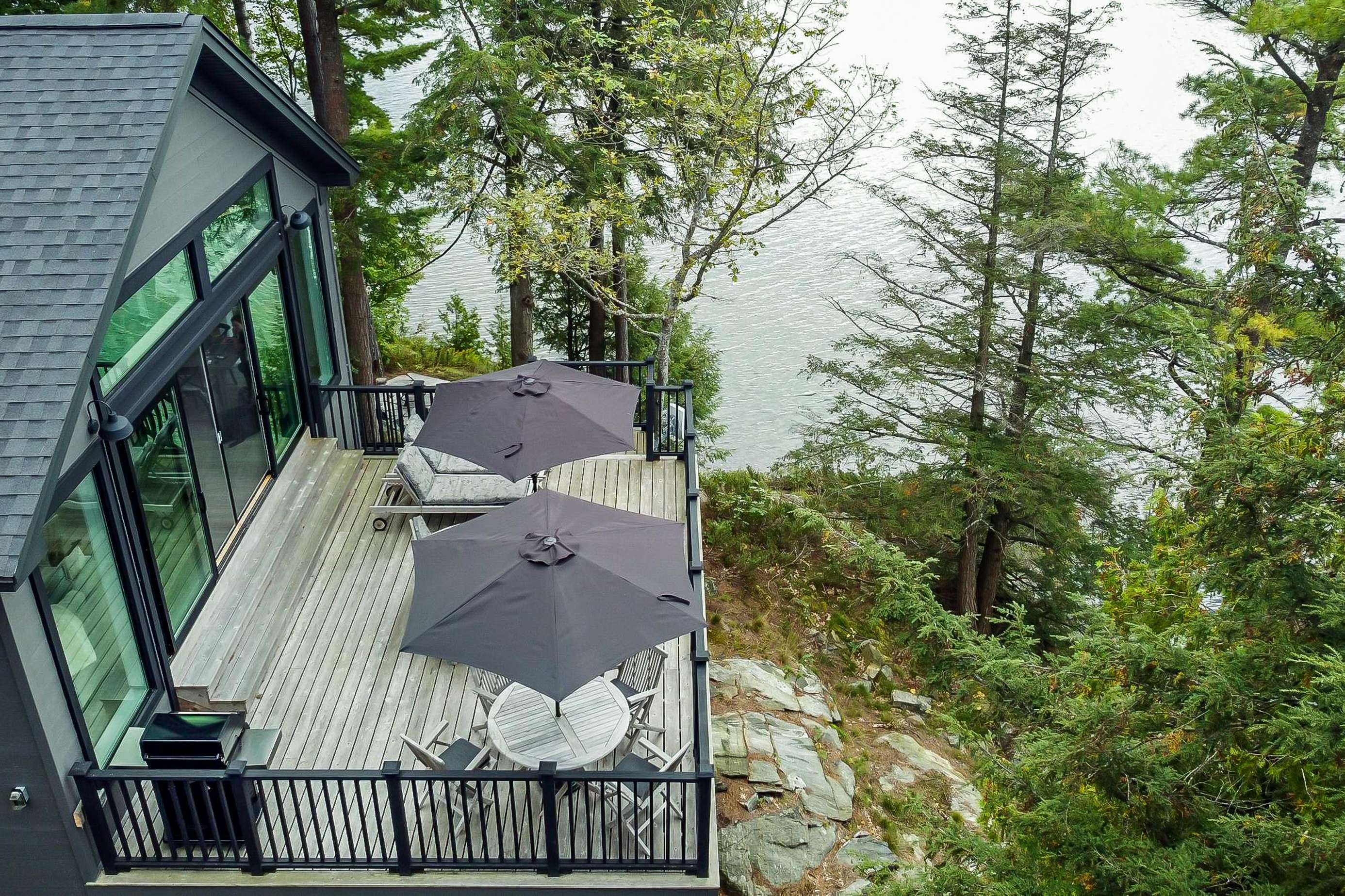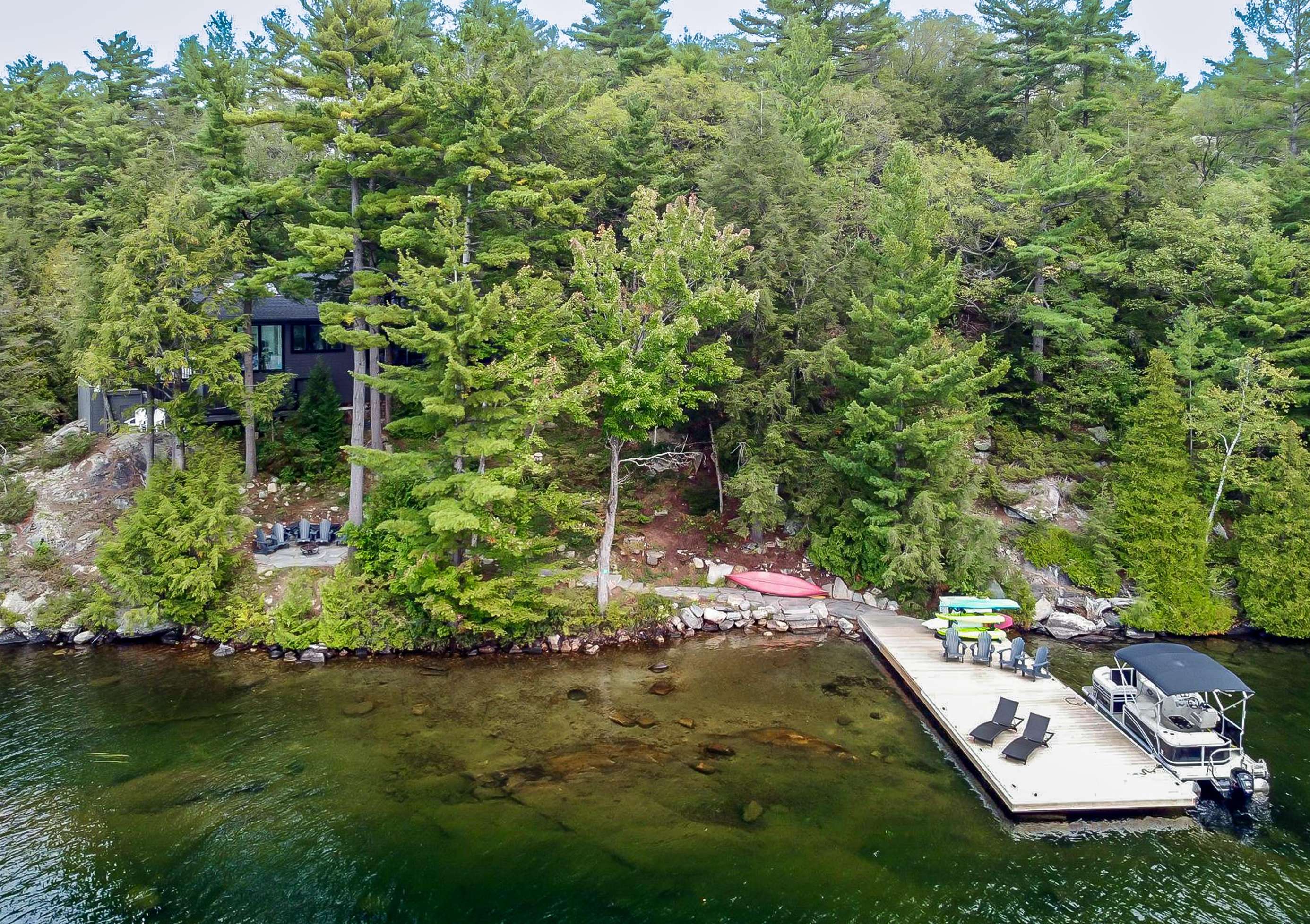 BELLA VISTA ON LAKE JOE - Disembark off your boat to a beautiful new dock equipped with 2 loungers, Muskoka chairs and outdoor toys! As you climb the beautifully landscaped stairs towards the cottage, you will pass a fire pit area with 5 Muskoka chairs overlooking the stunning lake. Continue on up to the front entrance or veer left which will bring you to the back deck featuring 2 more additional loungers under an umbrella, outdoor dining for 4 under an umbrella and a Weber BBQ. Soak in the views under the all-day-sun from all vantage points of the property!