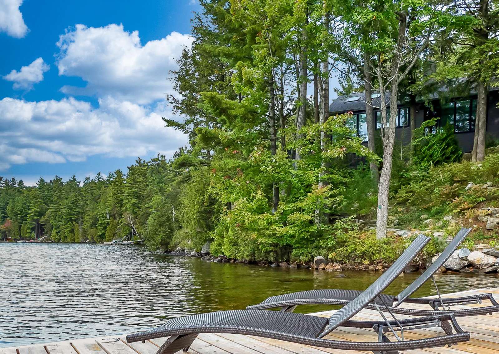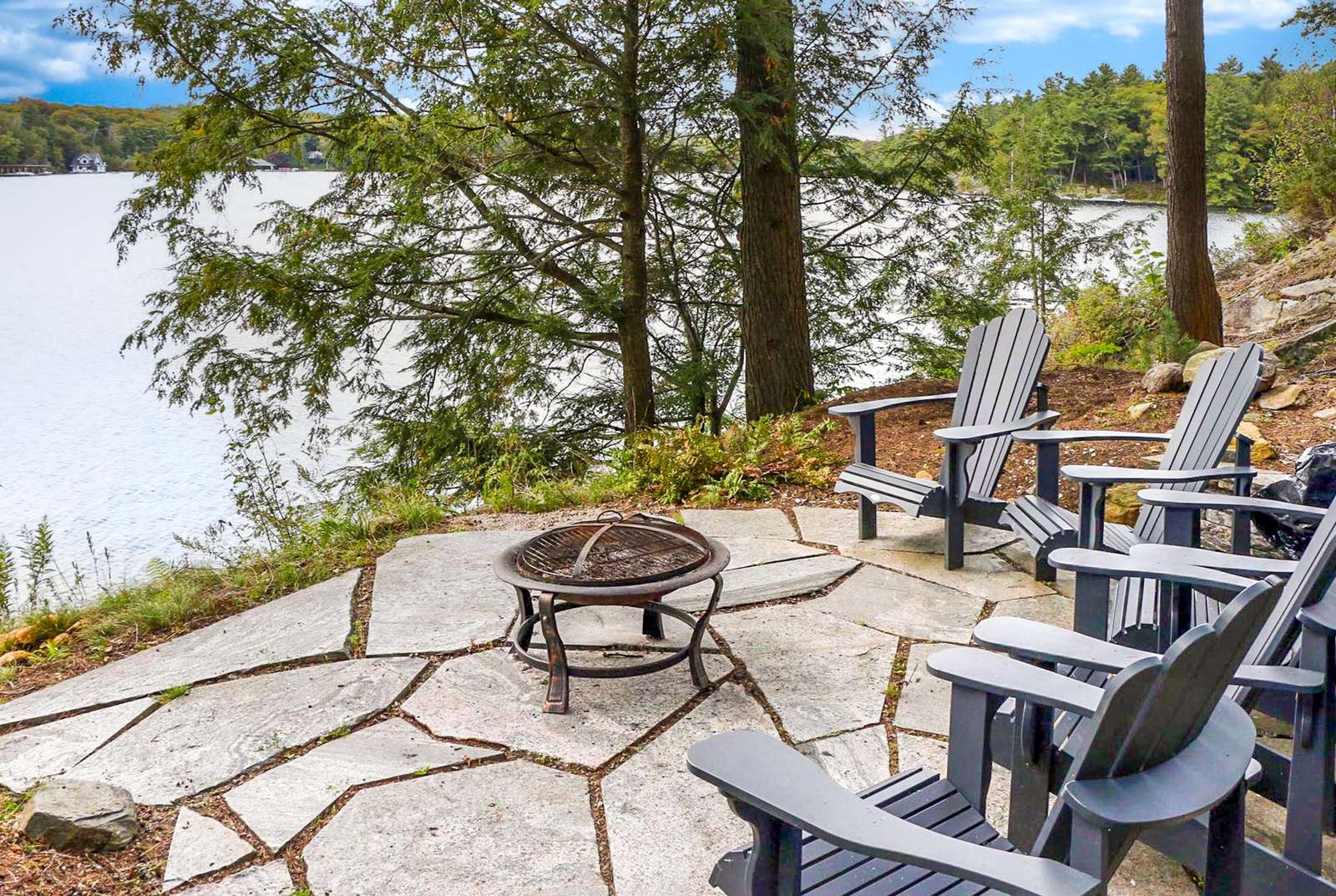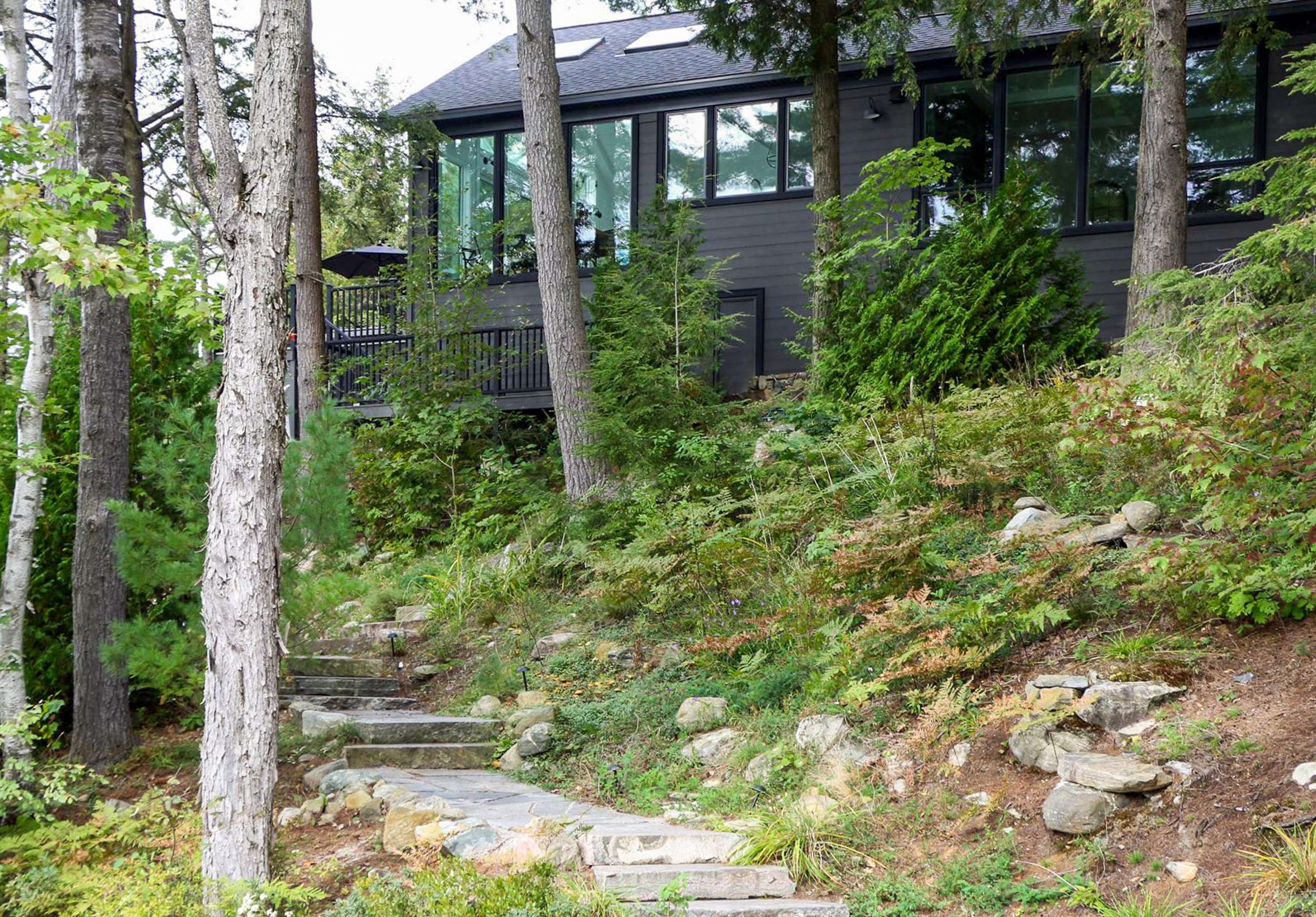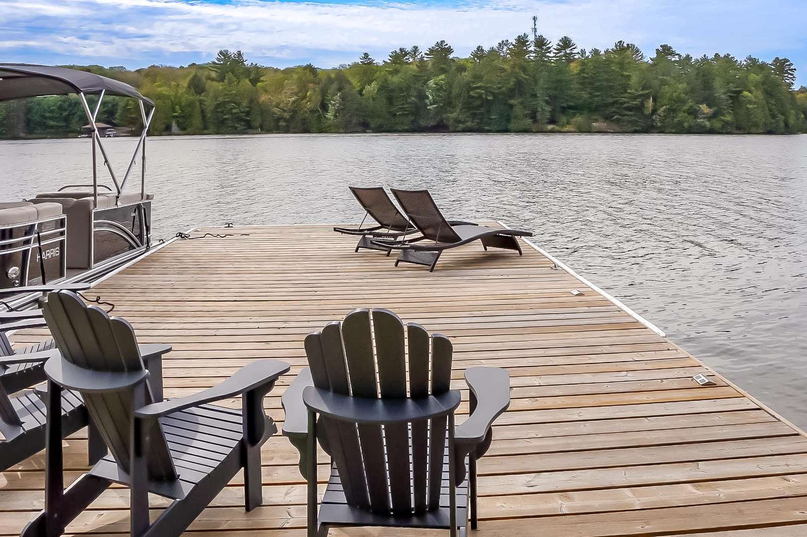BELLA VISTA ON LAKE JOE - Disembark off your boat to a beautiful new dock equipped with 2 loungers, Muskoka chairs and outdoor toys! As you climb the beautifully landscaped stairs towards the cottage, you will pass a fire pit area with 5 Muskoka chairs overlooking the stunning lake. Continue on up to the front entrance or veer left which will bring you to the back deck featuring 2 more additional loungers under an umbrella, outdoor dining for 4 under an umbrella and a Weber BBQ. Soak in the views under the all-day-sun from all vantage points of the property!