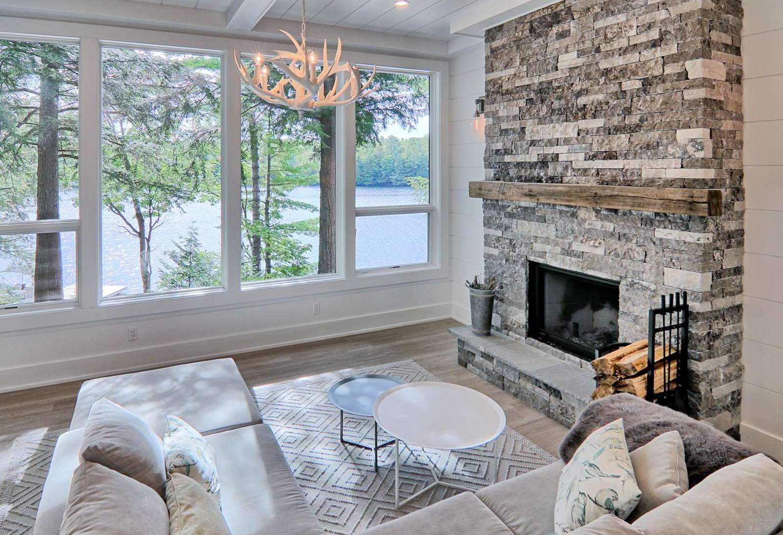 Boasts a large stone wood-burning fireplace scaling the back wall with an L-shaped sofa situated directly across. Beautiful views pour in from the oversized windows.