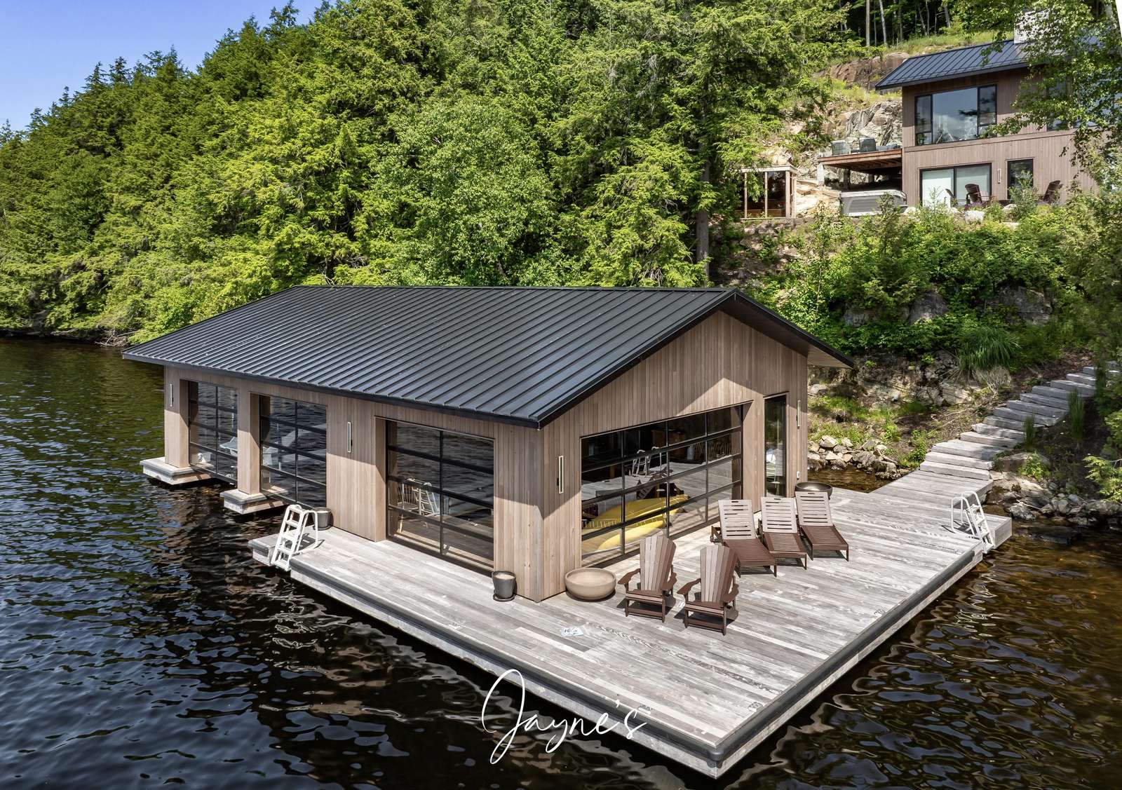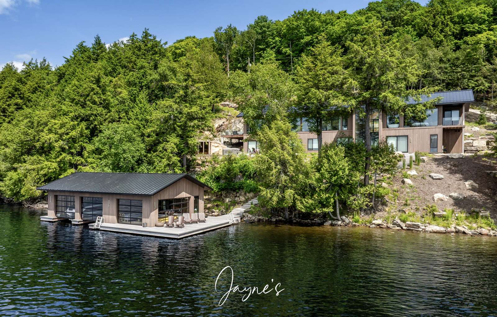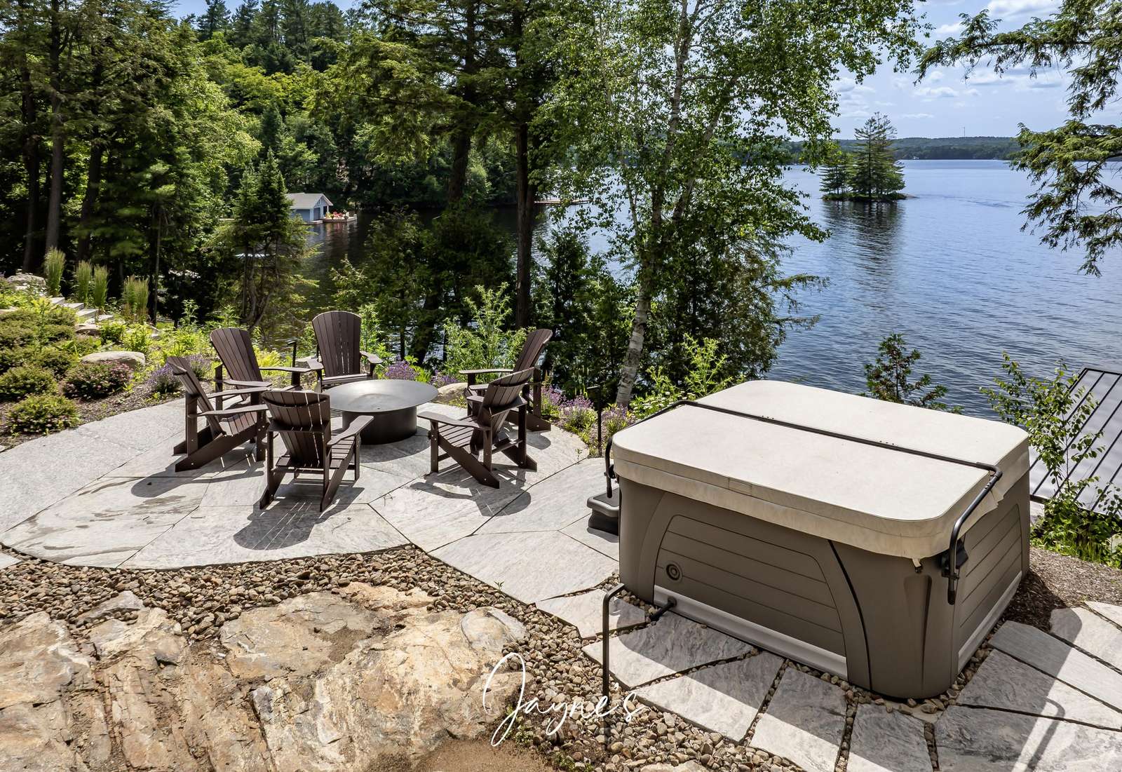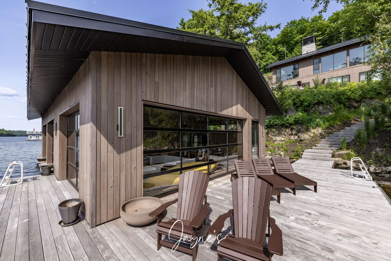 BIG AL'S SUNSET GETAWAY - Arrive to this brand new modern build set within dramatic rock cut amongst mature pines. Off the Muskoka Room, a spectacular outdoor kitchen is nestled in the rock. Featuring a BBQ, outdoor dining table and a lounge area with glass railings and stairs for easy access down to the lake. Down below, a hot tub has room for 8 beside an electric sauna and outdoor cold shower. Granite stone stairs cascade down to the waterfront where a spacious dock offers an afternoon of fun! The boathouse features 2 garage doors that reveal a seating and dining area. As sun the begins to set, lighting illuminates the entire property to mimic a moonlight effect. A fire pit adorned with Muskoka Chairs is the best spot to enjoy a s'more as stars begin to illuminate the sky!