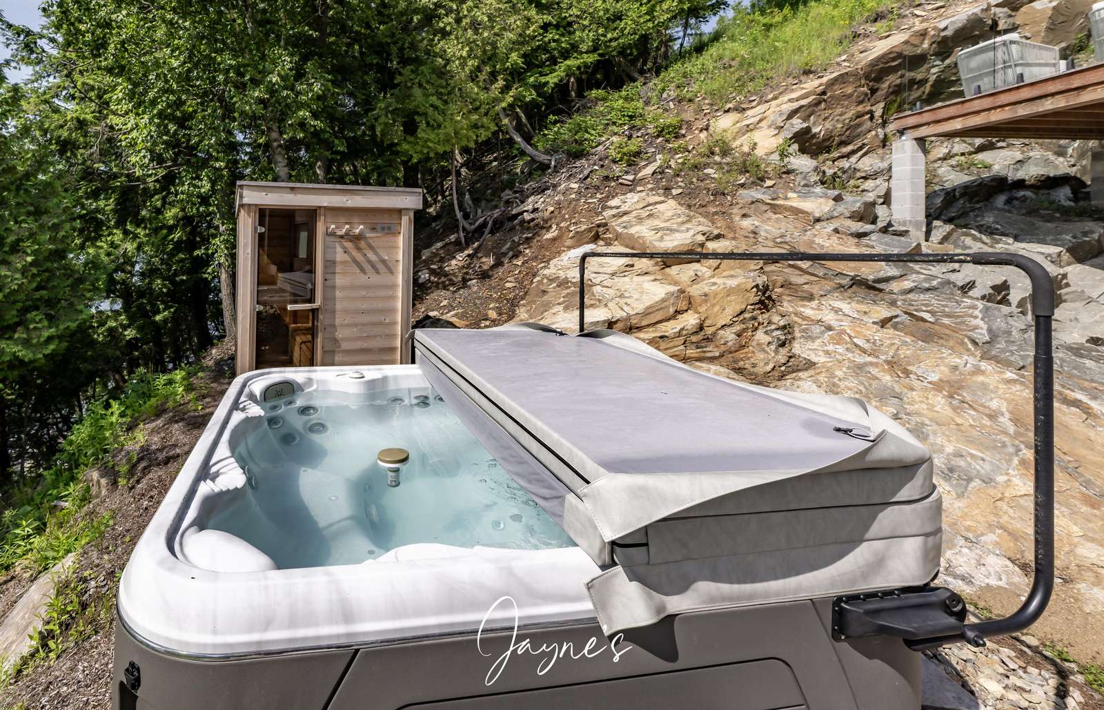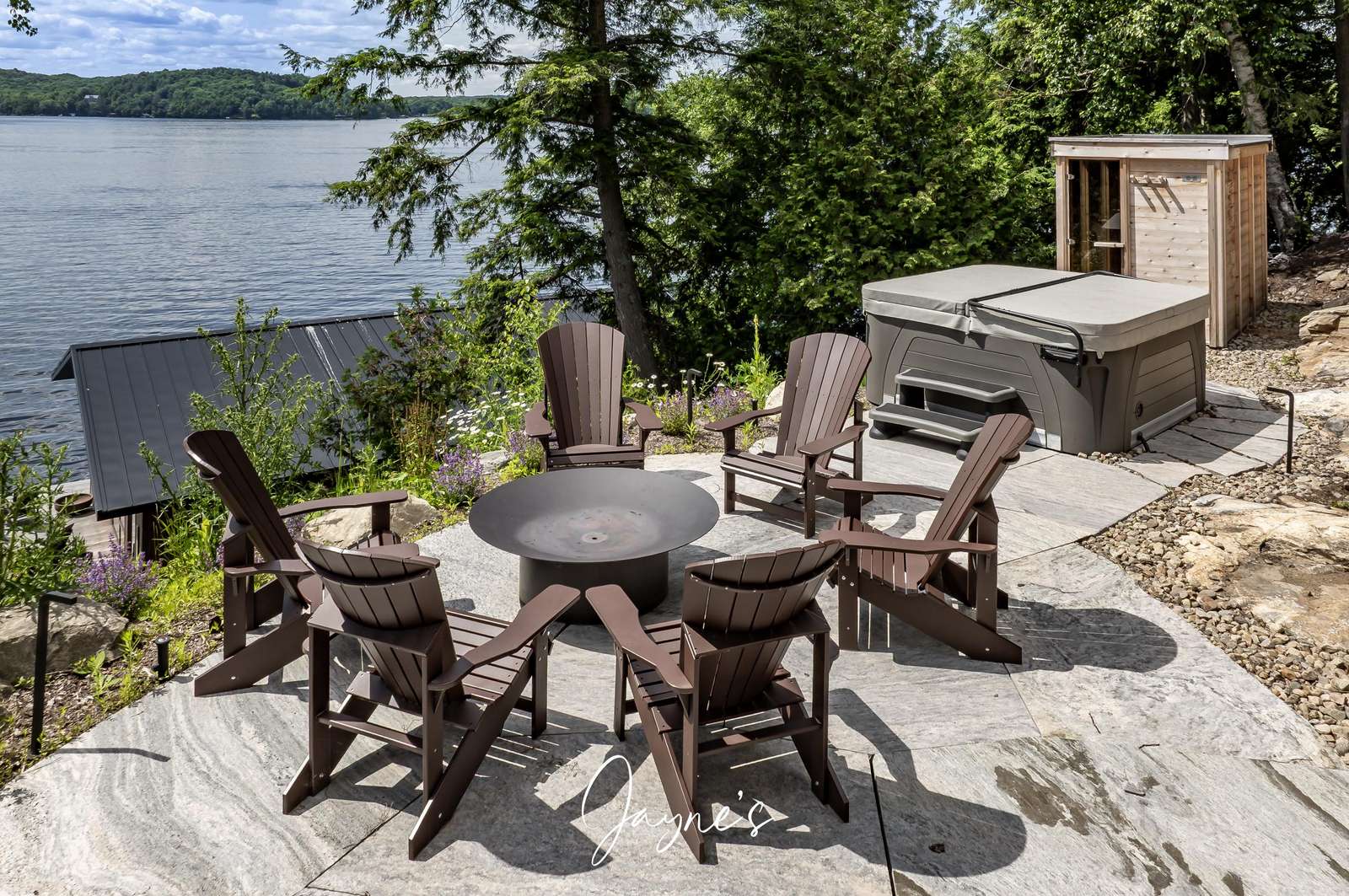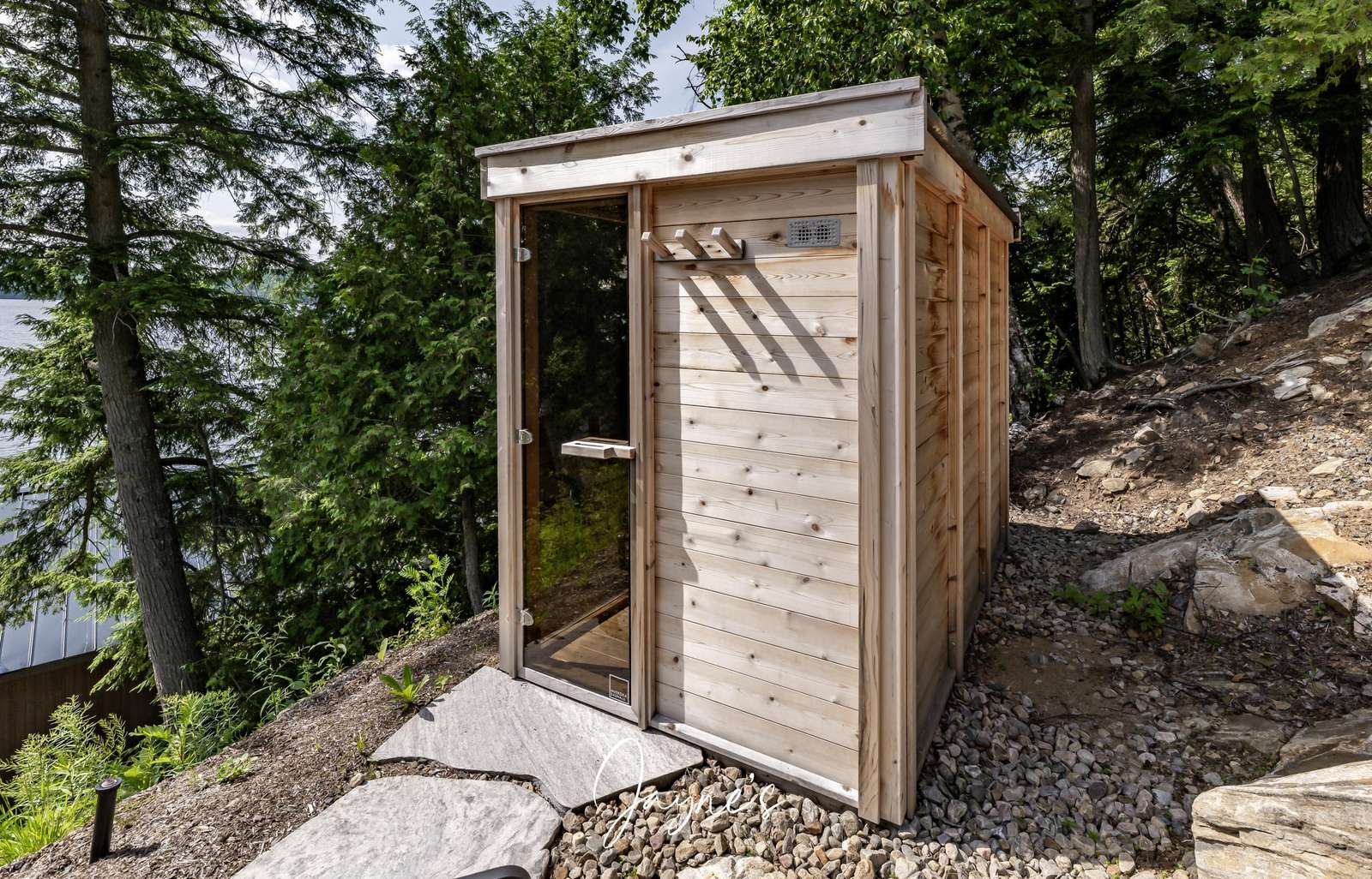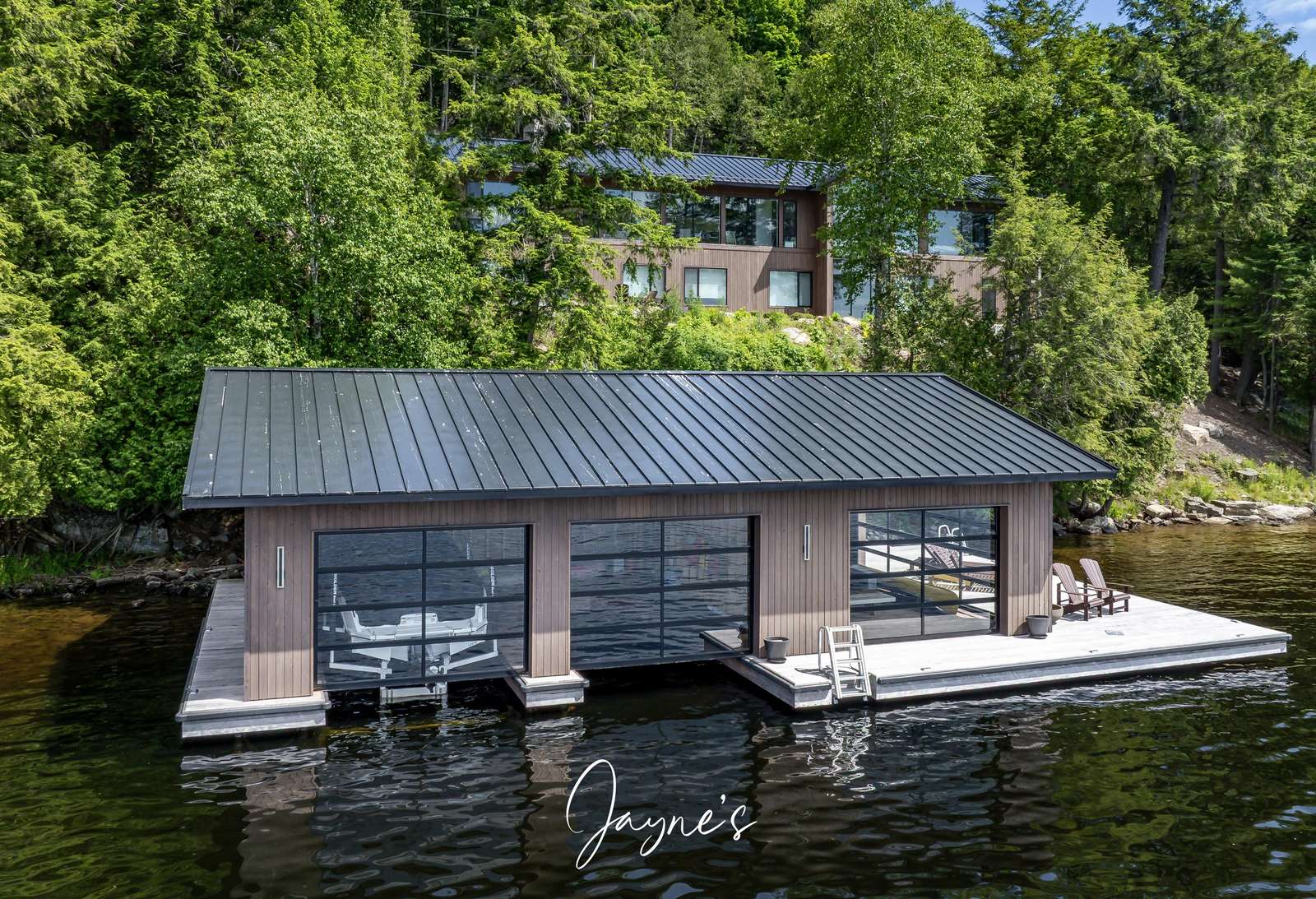 BIG AL'S SUNSET GETAWAY - Arrive to this brand new modern build set within dramatic rock cut amongst mature pines. Off the Muskoka Room, a spectacular outdoor kitchen is nestled in the rock. Featuring a BBQ, outdoor dining table and a lounge area with glass railings and stairs for easy access down to the lake. Down below, a hot tub has room for 8 beside an electric sauna and outdoor cold shower. Granite stone stairs cascade down to the waterfront where a spacious dock offers an afternoon of fun! The boathouse features 2 garage doors that reveal a seating and dining area. As sun the begins to set, lighting illuminates the entire property to mimic a moonlight effect. A fire pit adorned with Muskoka Chairs is the best spot to enjoy a s'more as stars begin to illuminate the sky!
