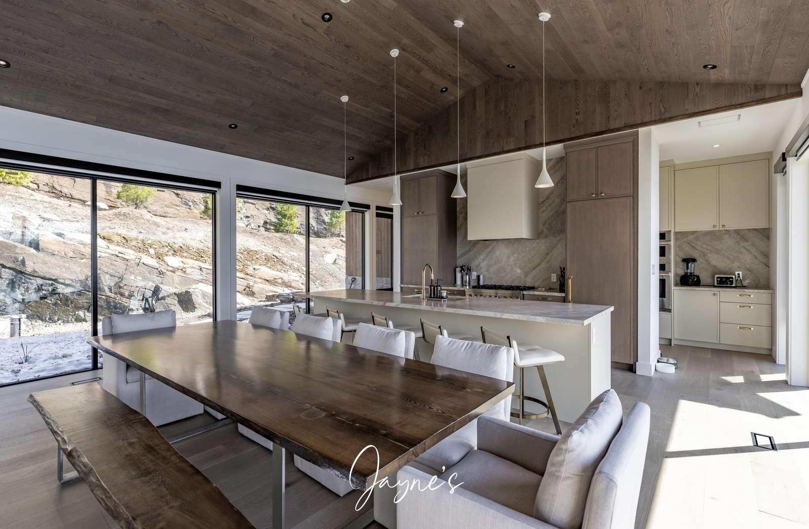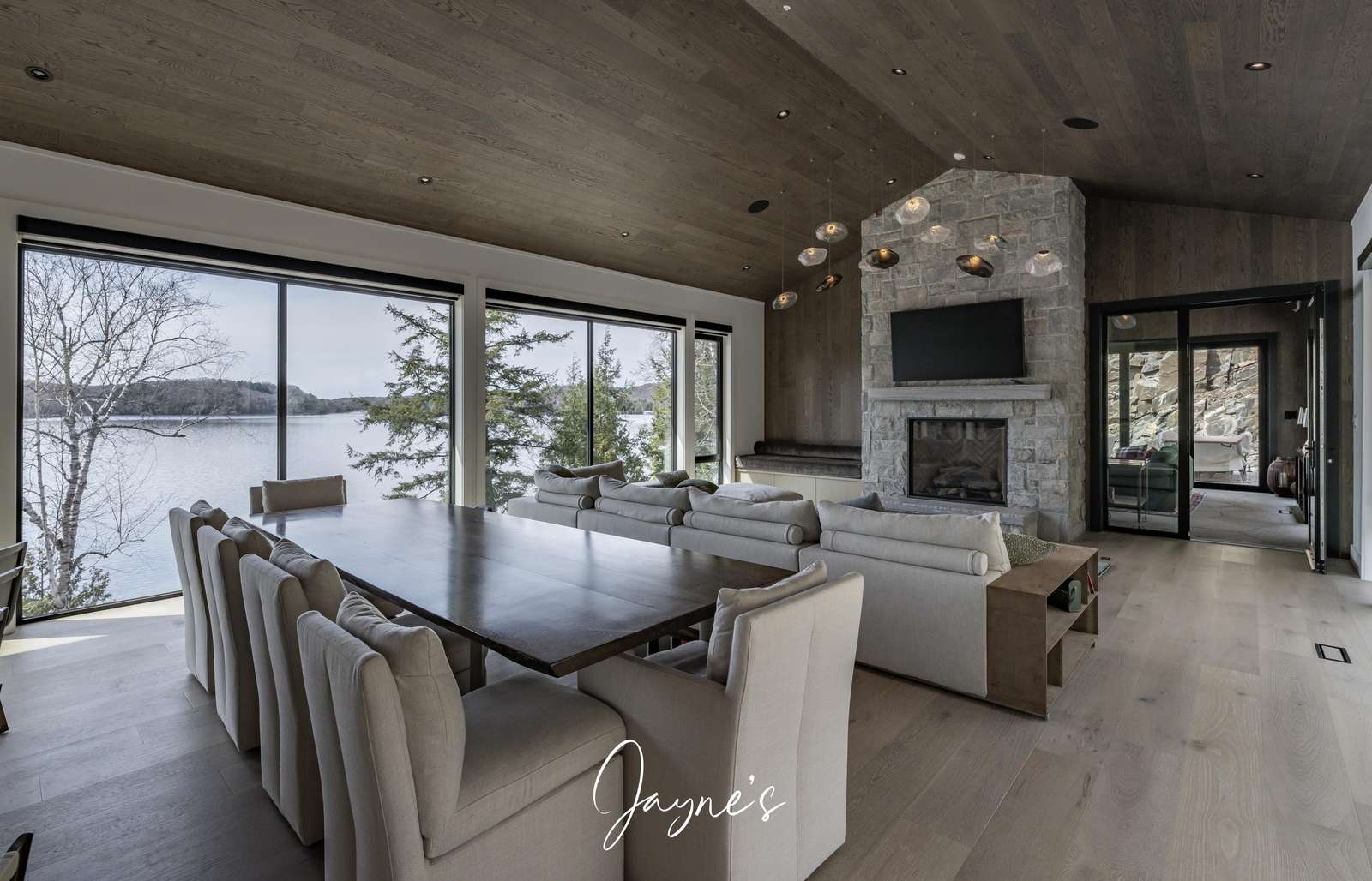 A wall of floor-to-ceiling windows span the length of the cottage - from the main entrance to the Muskoka Room. The open-concept dining room features seating for 10.