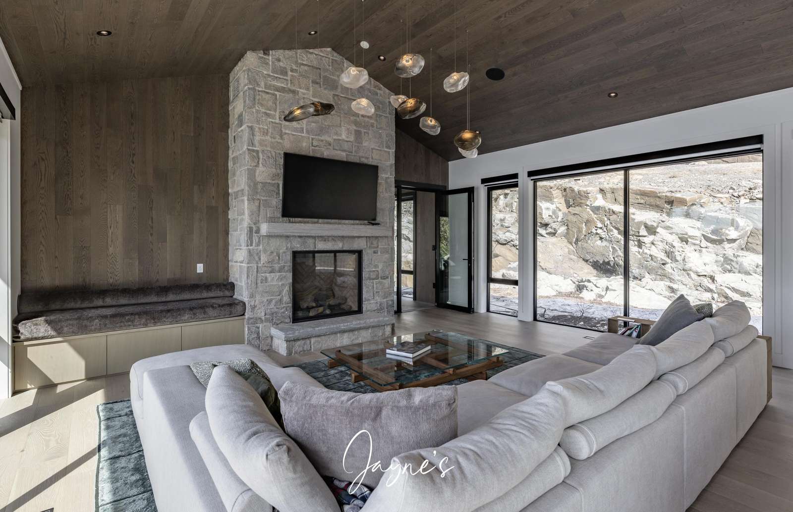 Features an extra large Italian linen sofa across from a gas fireplace and TV, beneath a beautiful Bocci light structure.