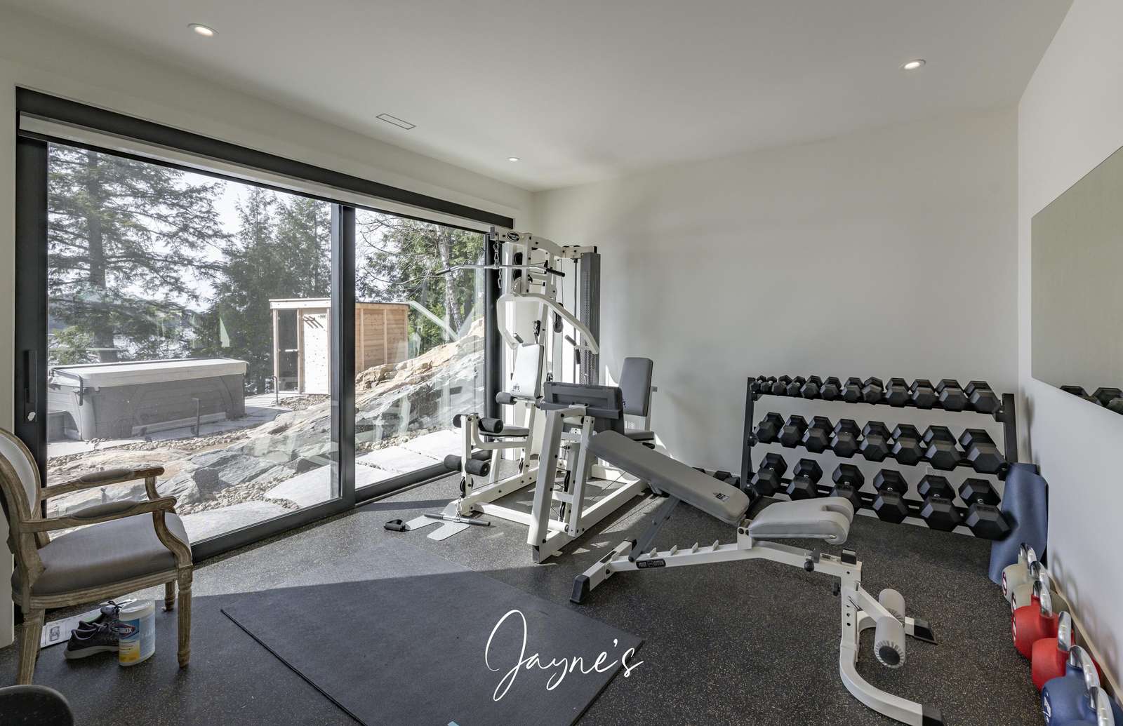 A large gym facing out towards the lake with a full set of kettle bells, weights and cable machine.