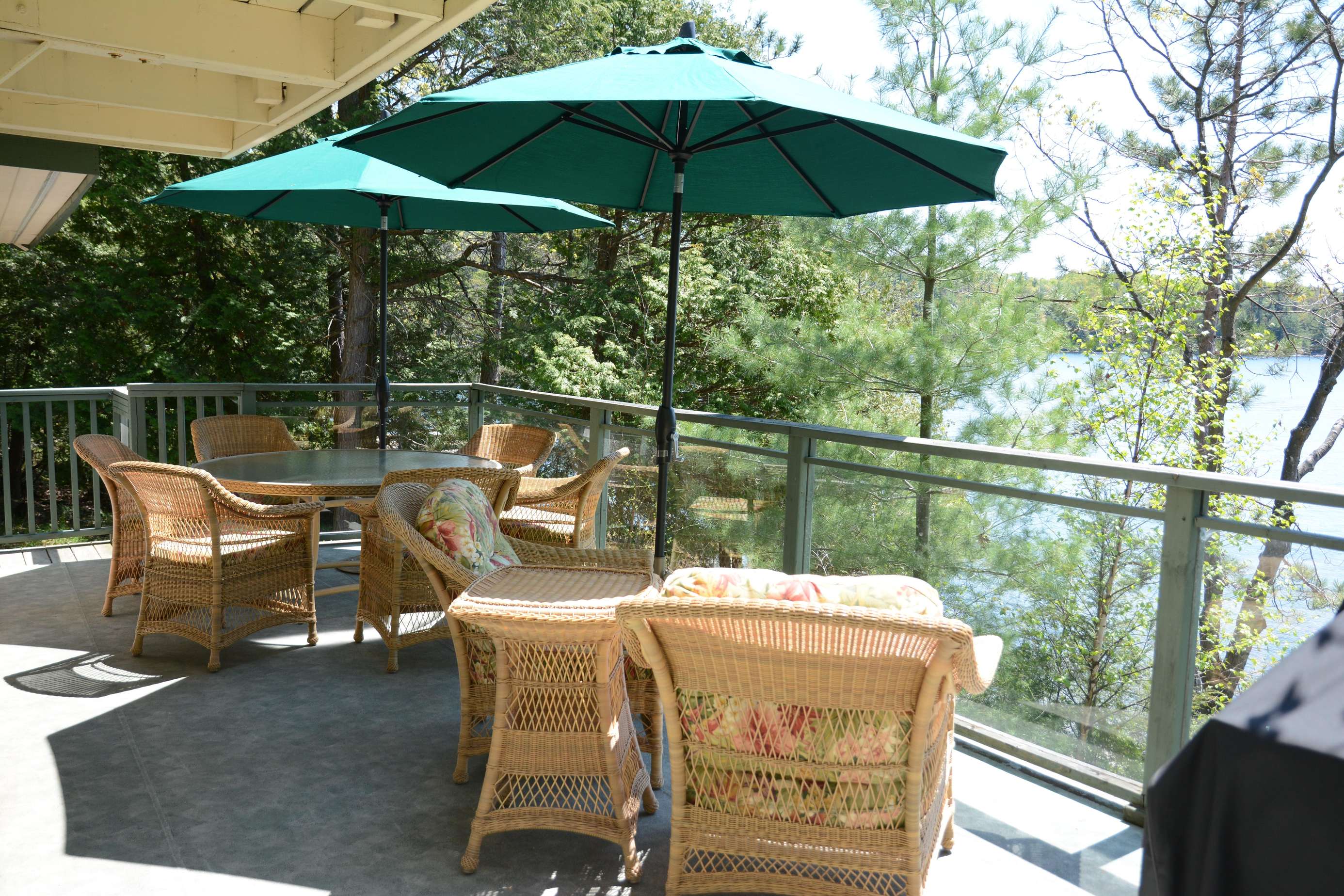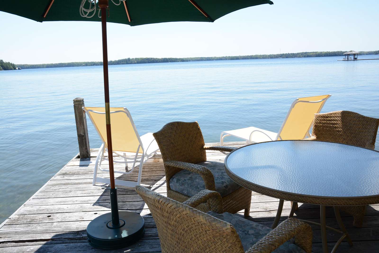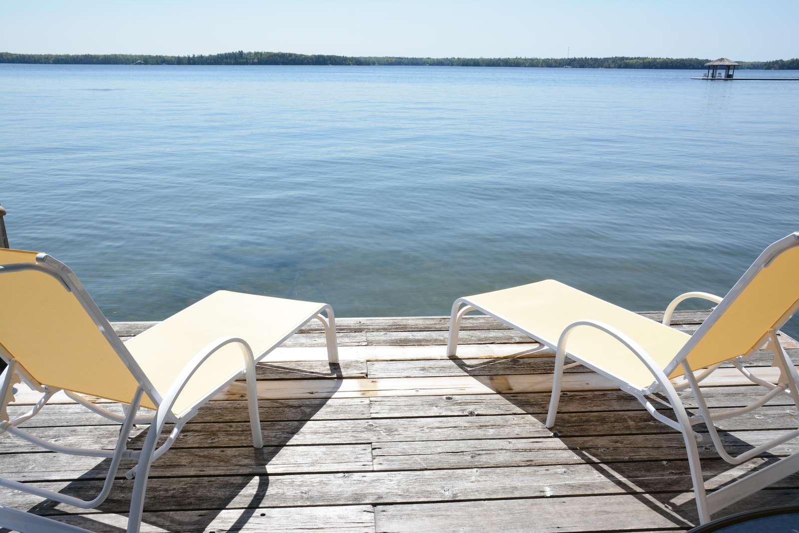 Front deck off Great Room has a large deck with 2 umbrellas (you need them from the all day sun!). The deck has a dining table for 6, a semi-circular sofa for up to 6 and a propane firepit The dock also is a great area to enjoy the view, water and sun! There is a sheltered area under the boathouse rooftop to get away from the sun. Here there is a dining table for 4 and there are 2 lounge chairs on the dock. There is also a separate cozy seating area for 2 on a small stone terrace, above the beach, sheltered from the sun. Depth of water at the end of the dock is about 4', deep enough for boating. There is a sandy beach area to the left of the dock with shallow sandy bottom. Pathway around cottage to lower suite and dock is lit with discreet night time lighting.