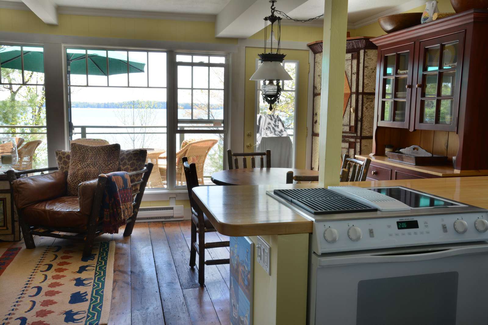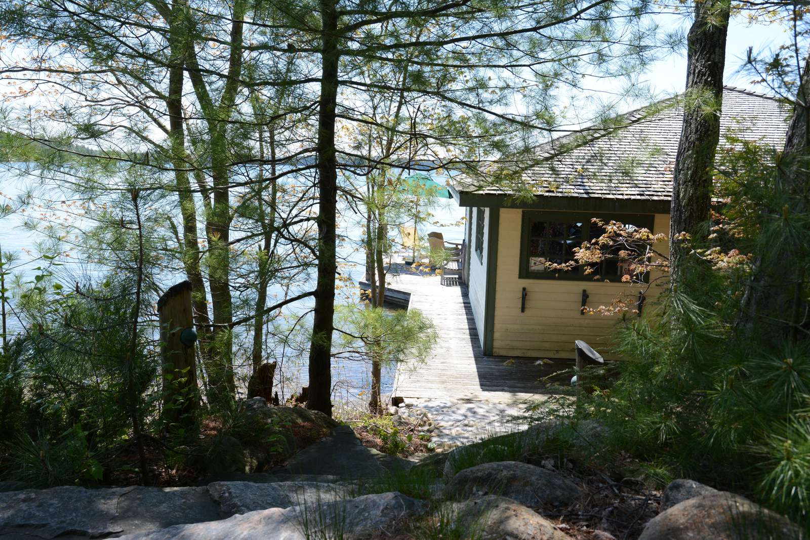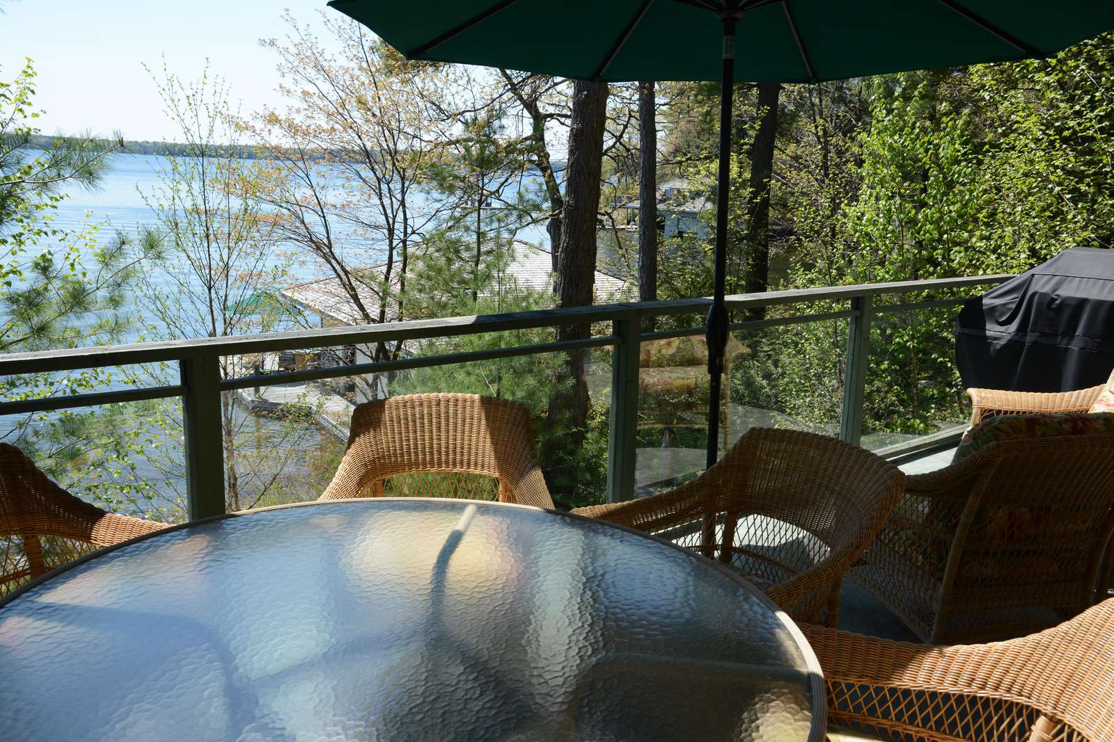 Front deck off Great Room has a large deck with 2 umbrellas (you need them from the all day sun!). The deck has a dining table for 6, a semi-circular sofa for up to 6 and a propane firepit The dock also is a great area to enjoy the view, water and sun! There is a sheltered area under the boathouse rooftop to get away from the sun. Here there is a dining table for 4 and there are 2 lounge chairs on the dock. There is also a separate cozy seating area for 2 on a small stone terrace, above the beach, sheltered from the sun. Depth of water at the end of the dock is about 4', deep enough for boating. There is a sandy beach area to the left of the dock with shallow sandy bottom. Pathway around cottage to lower suite and dock is lit with discreet night time lighting.