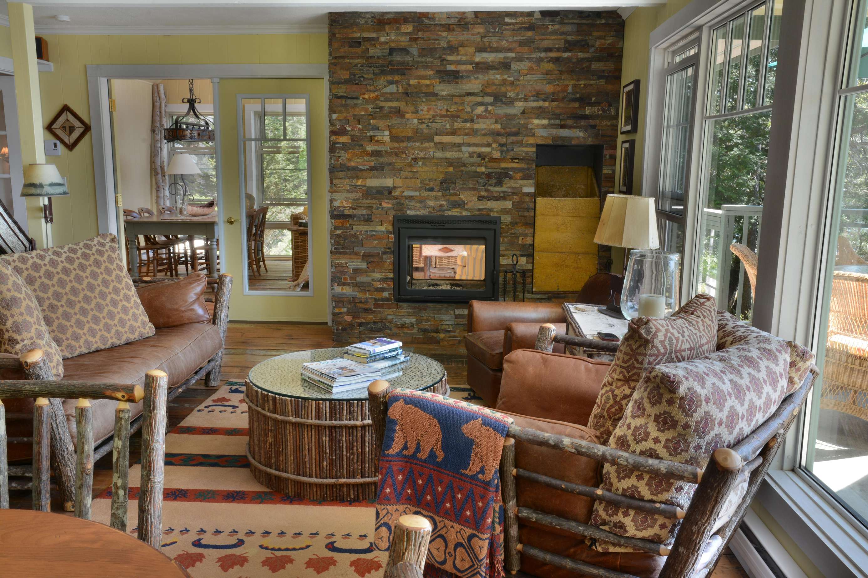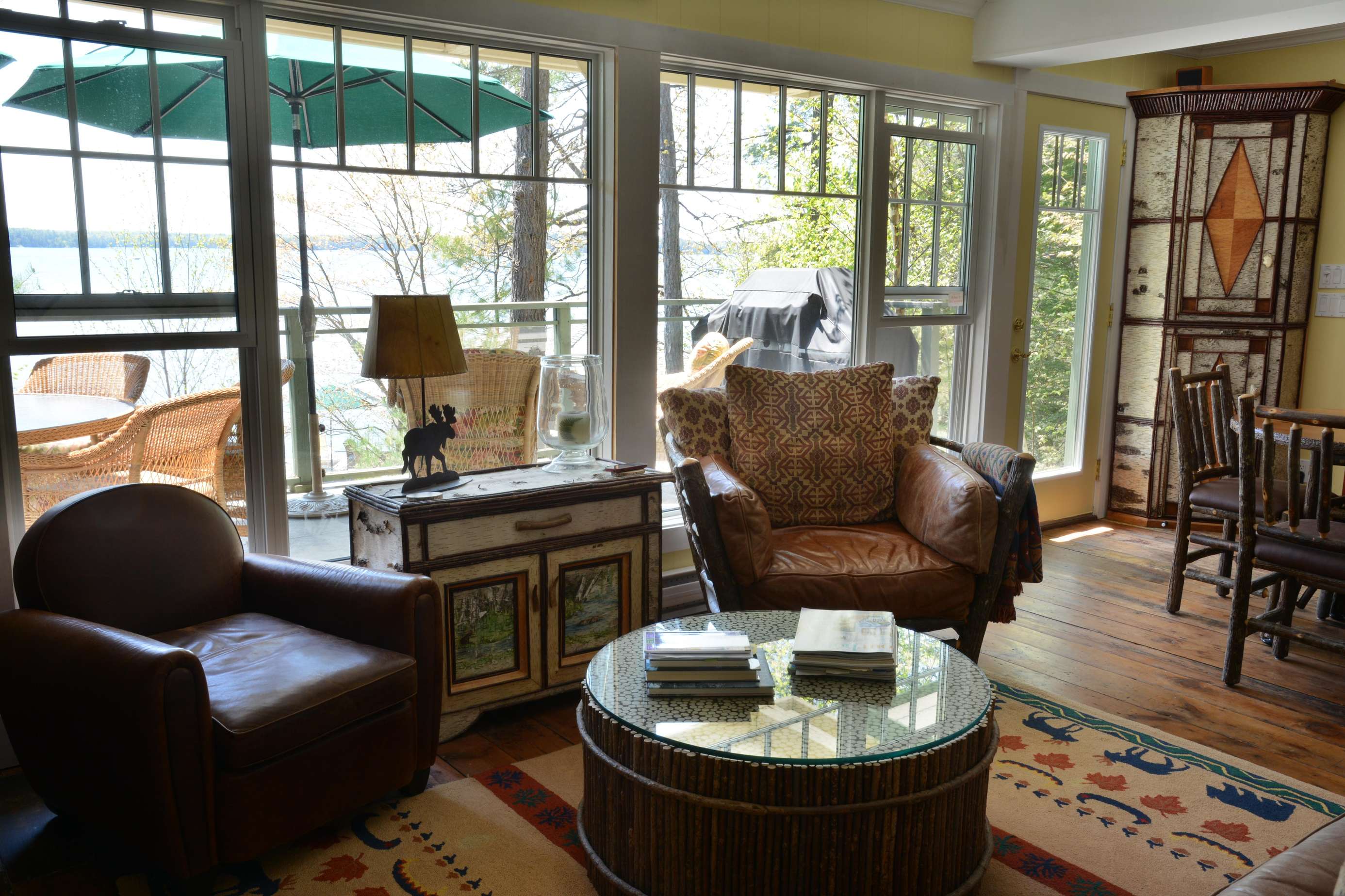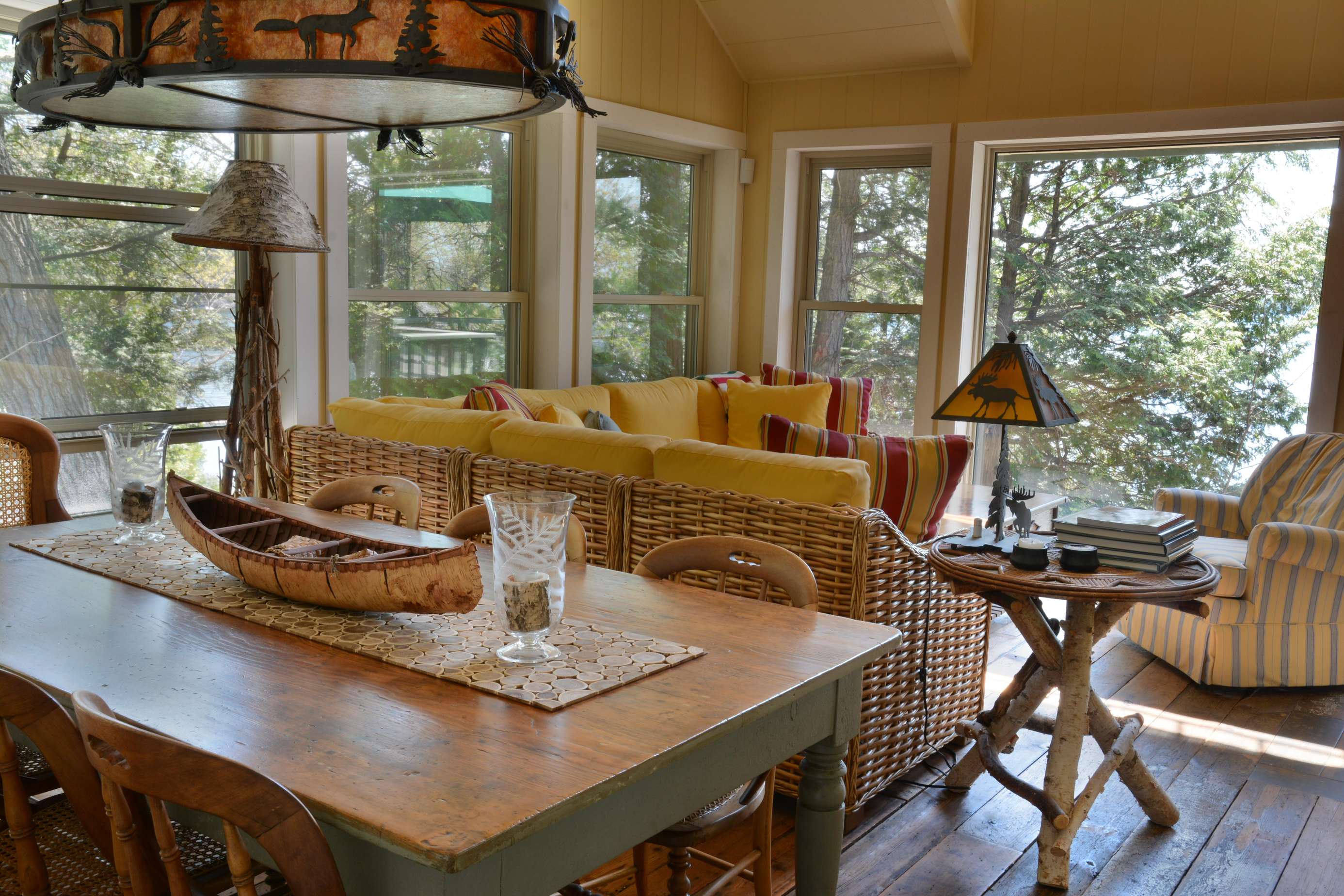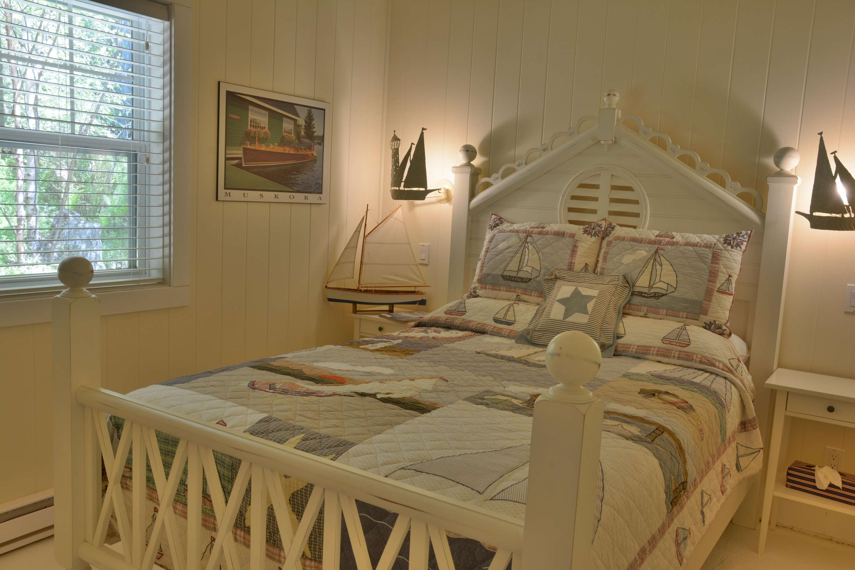 Nice entry leads into open concept Kitchen/Great Room. Light-filled Great Room with beautiful views over the lake. A 2-sided wood-burning fireplace in the Great Room also opens to the Muskoka Room. Great Room has comfortable Adirondack-style seating, Kitchen table has seating for 4. Off the Great Room is a small Media room with sectional sofa and flat screen TV with lots of DVDs. Opening from the Great Room is the Muskoka Room, a beautiful room surrounded on 2 sides by floor-to-ceiling windows with a sectional, flat screen TV above the two-sided fireplace and a French Provence dining table to seat up to 8. There is also a main floor bedroom off the Muskoka Room, bright with lovely nautical-themed bedding on a Queen size bed. The main floor also features a bright bathroom with combination bathtub/shower, large private window and a separate outdoor entrance.