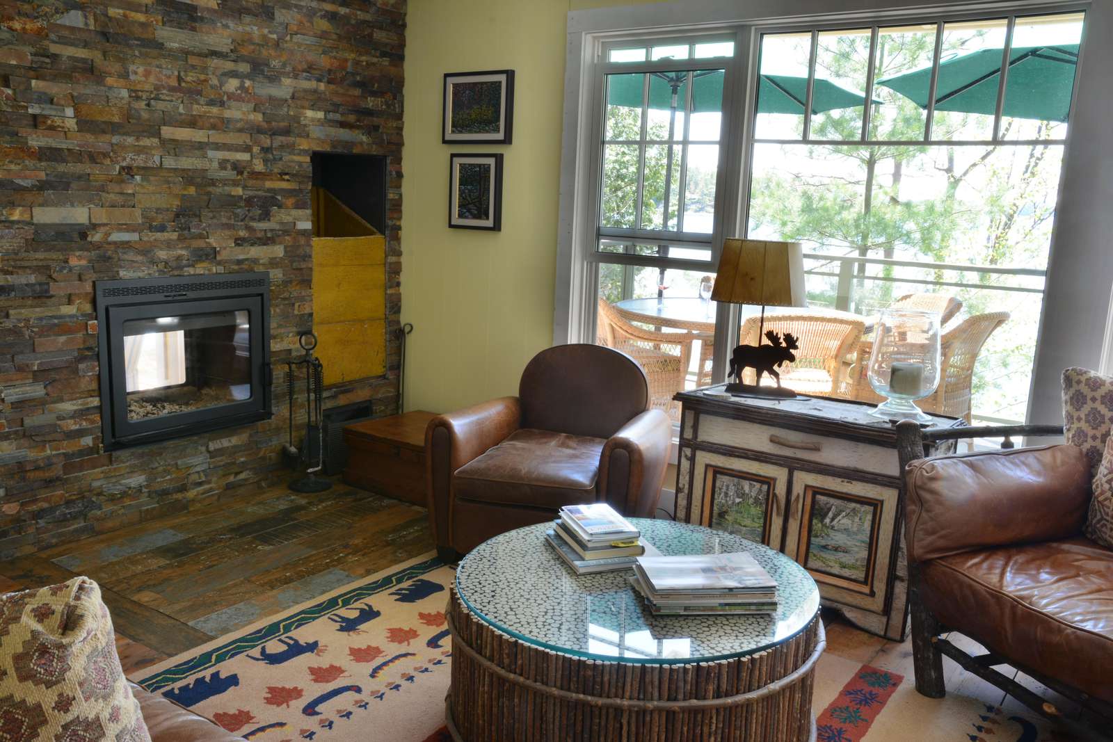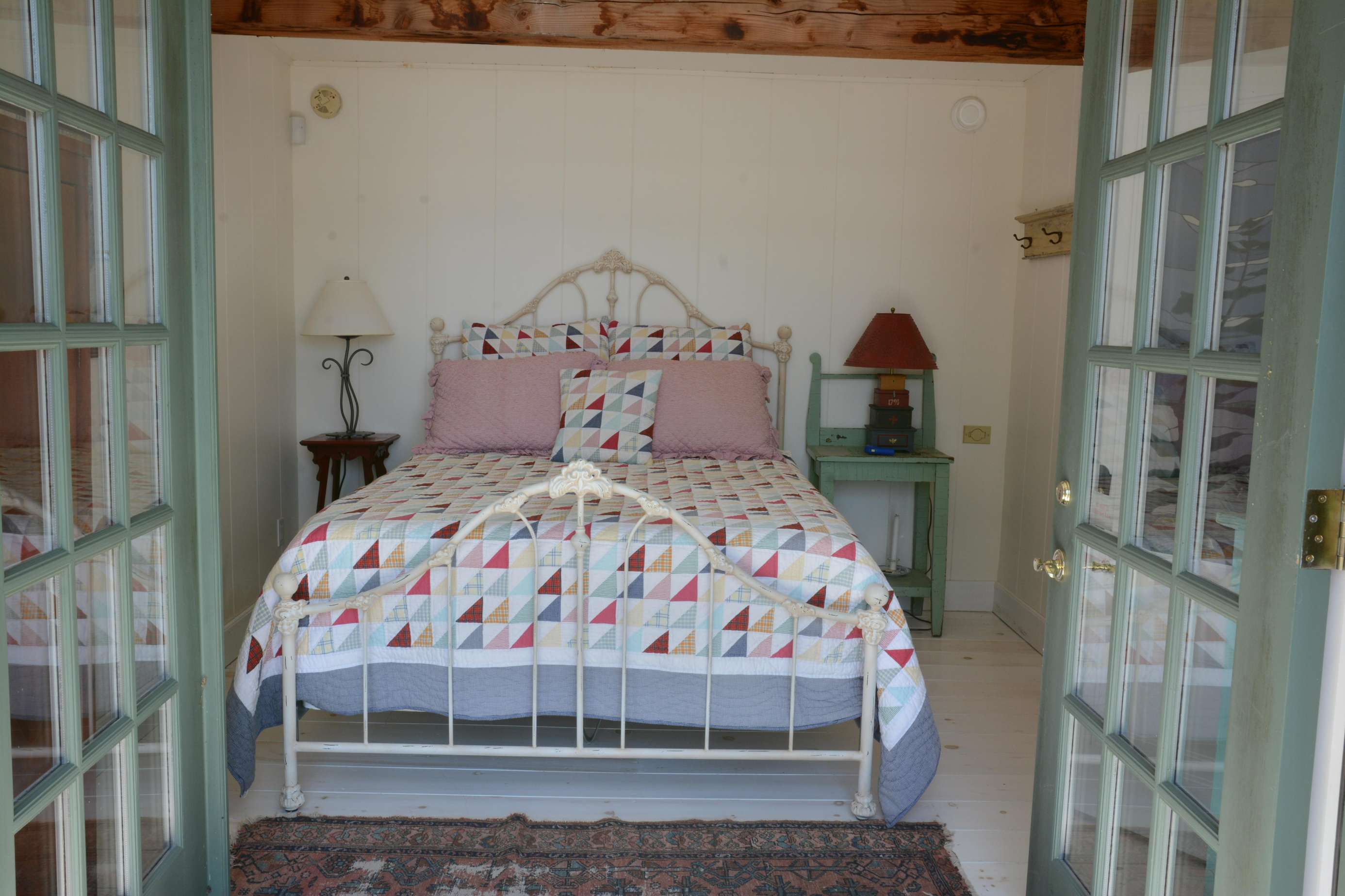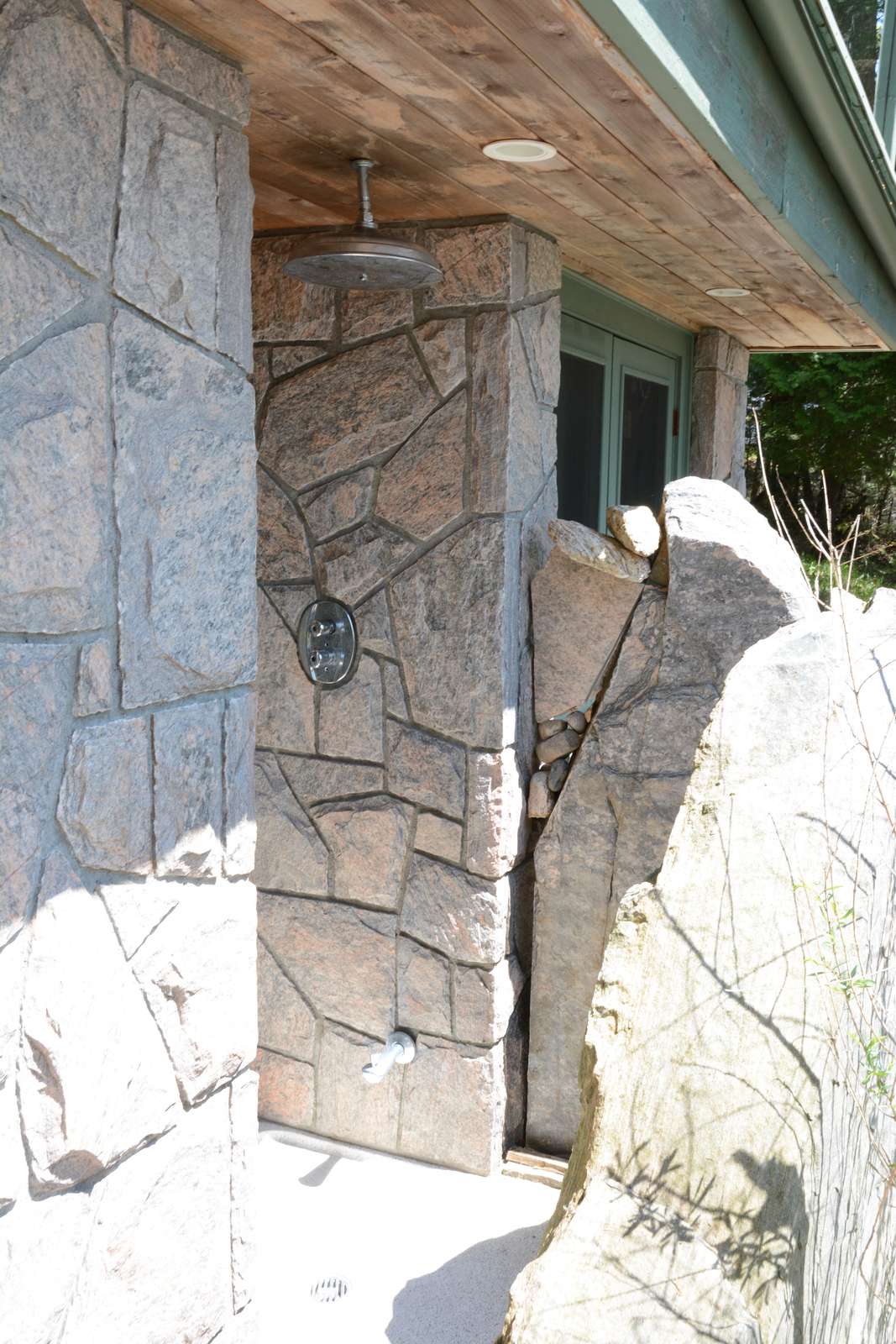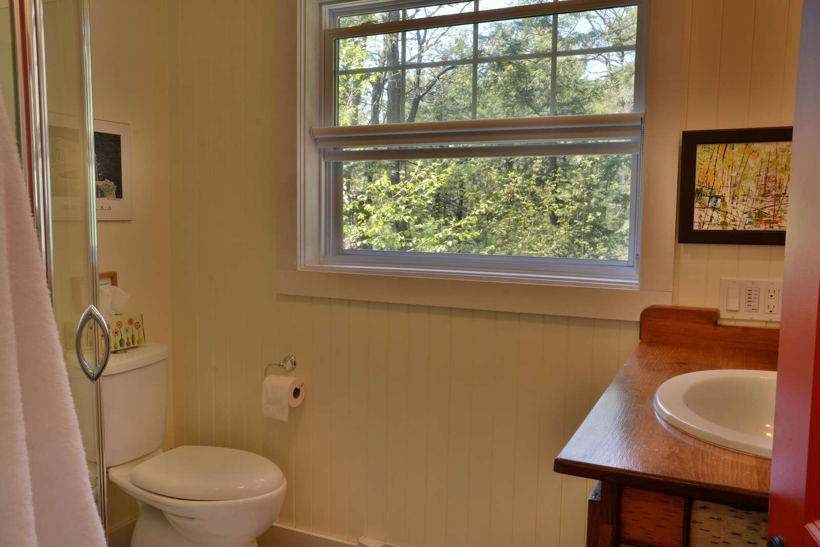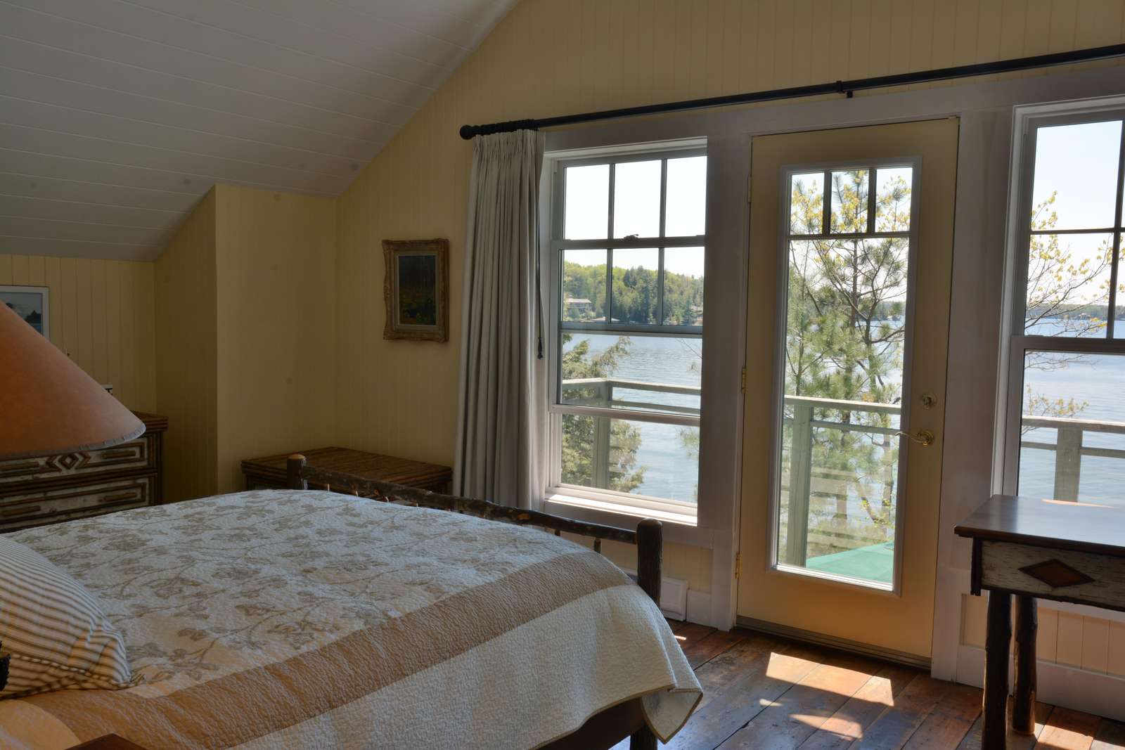 The lower level is the secret jewel of the cottage. Similar to a separate bunkie, it is a separate suite to the cottage. With a stone terrace in front, the suite has its own entry with double French screen doors just above the water's edge. Sleep listening to the sounds of the water gently hitting the shoreline in a beautiful Queen bedroom suite with its private bathroom and outdoor shower, surrounded by large rocks for privacy.