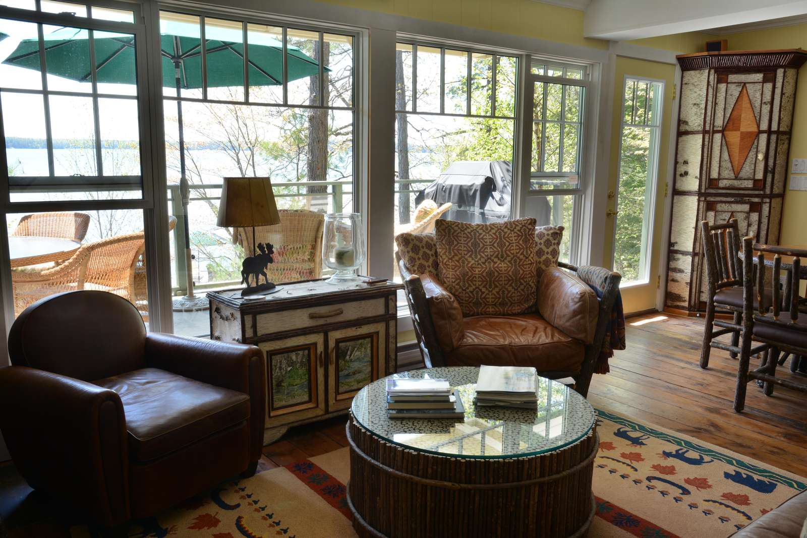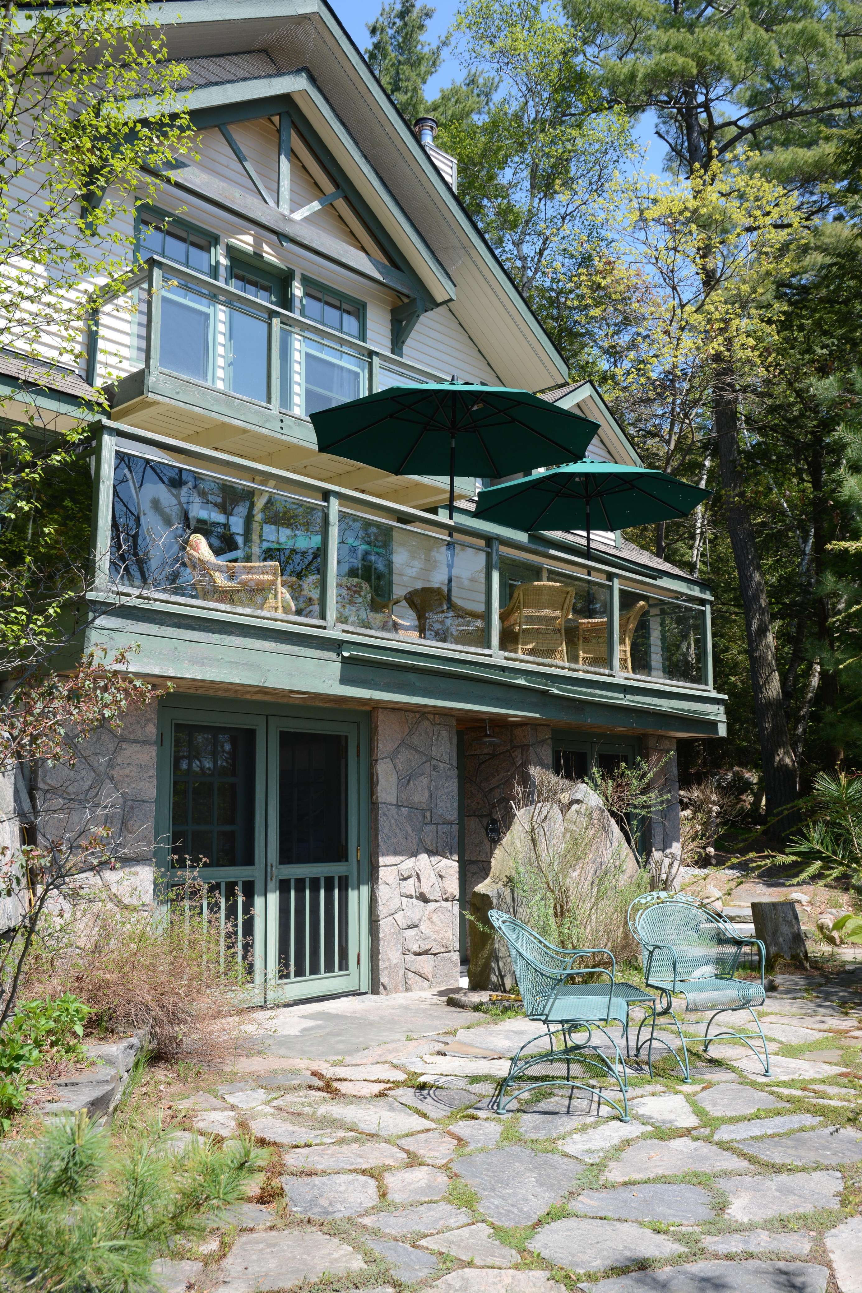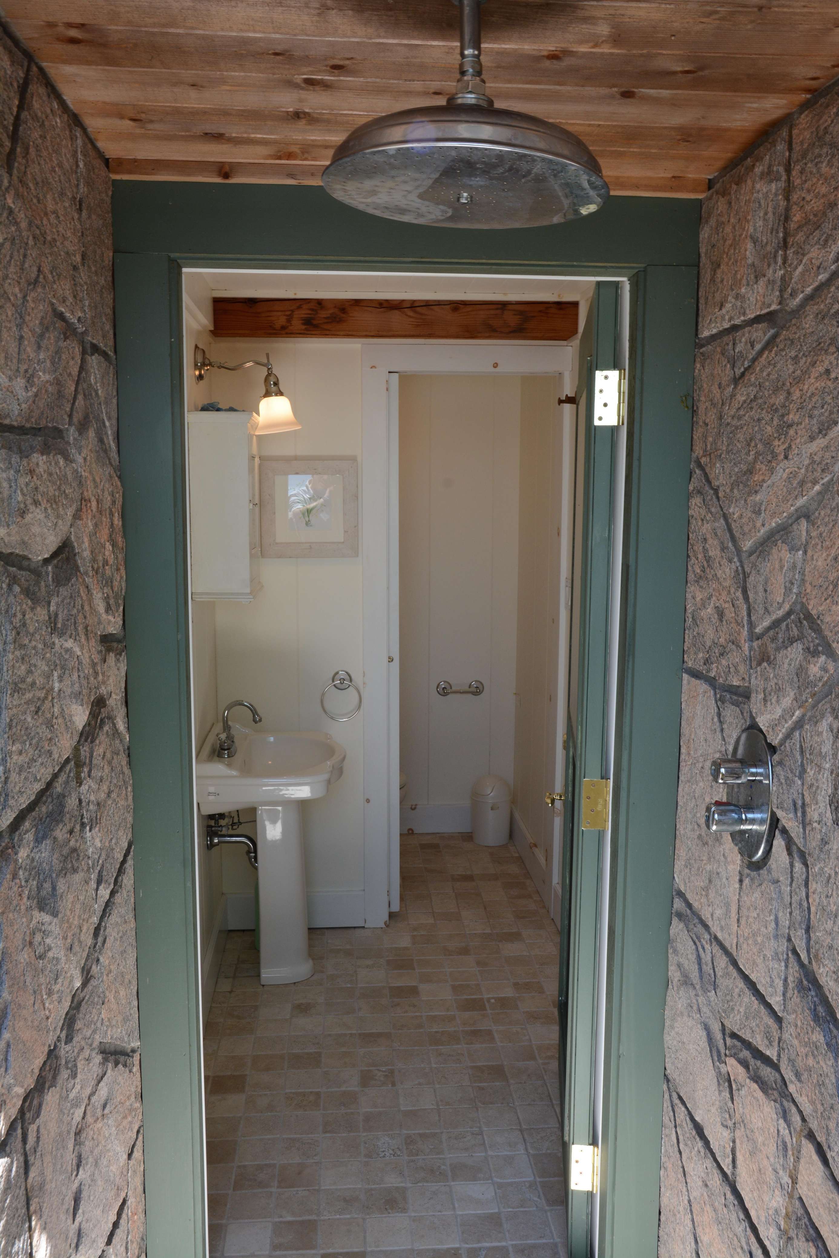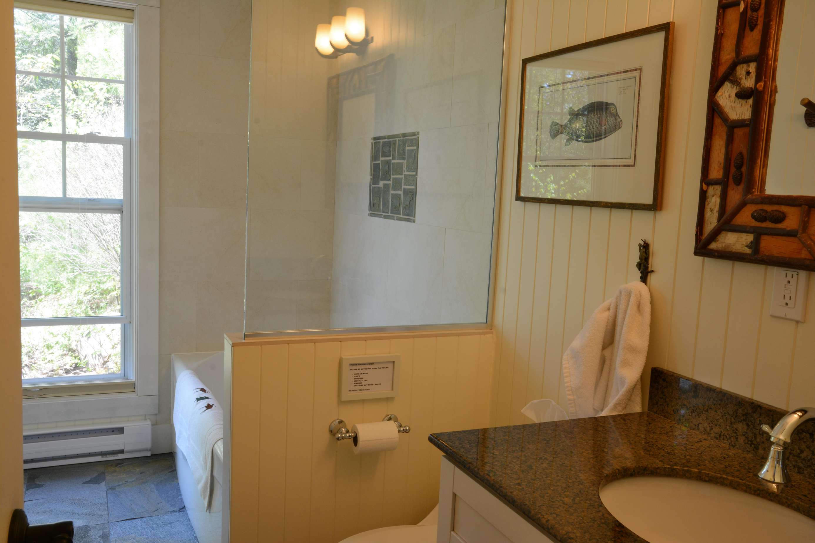 The lower level is the secret jewel of the cottage. Similar to a separate bunkie, it is a separate suite to the cottage. With a stone terrace in front, the suite has its own entry with double French screen doors just above the water's edge. Sleep listening to the sounds of the water gently hitting the shoreline in a beautiful Queen bedroom suite with its private bathroom and outdoor shower, surrounded by large rocks for privacy.