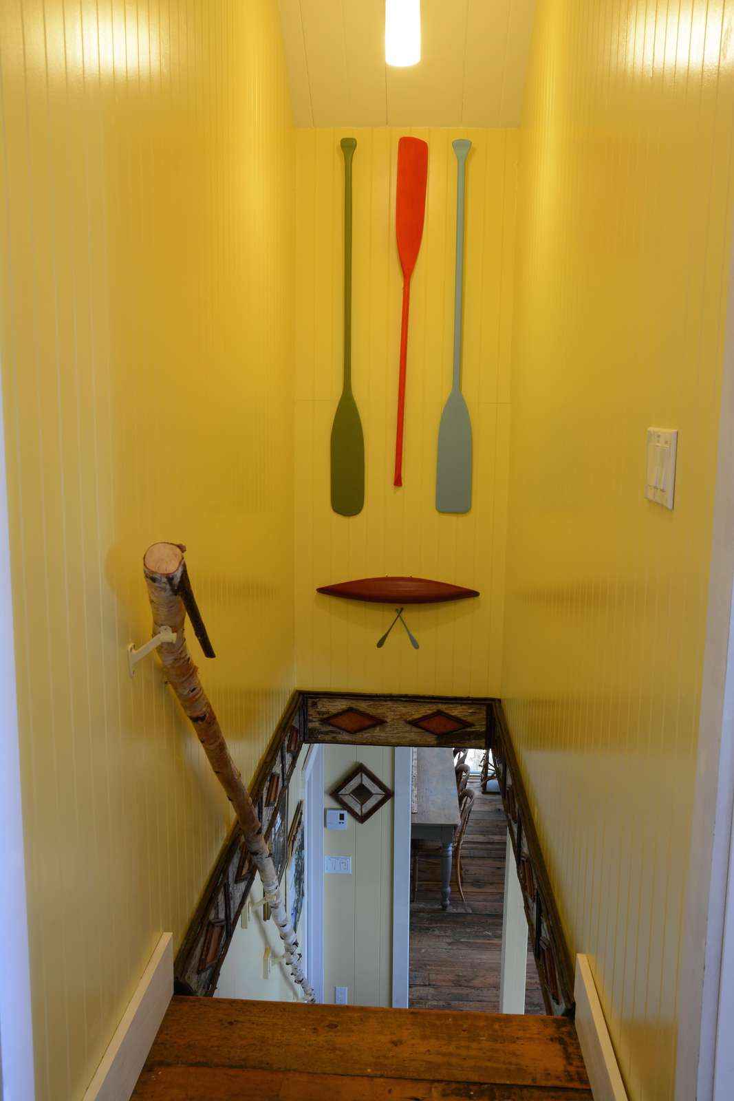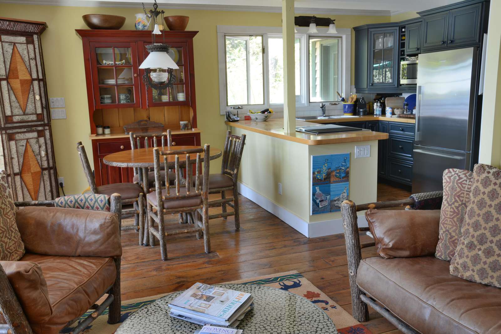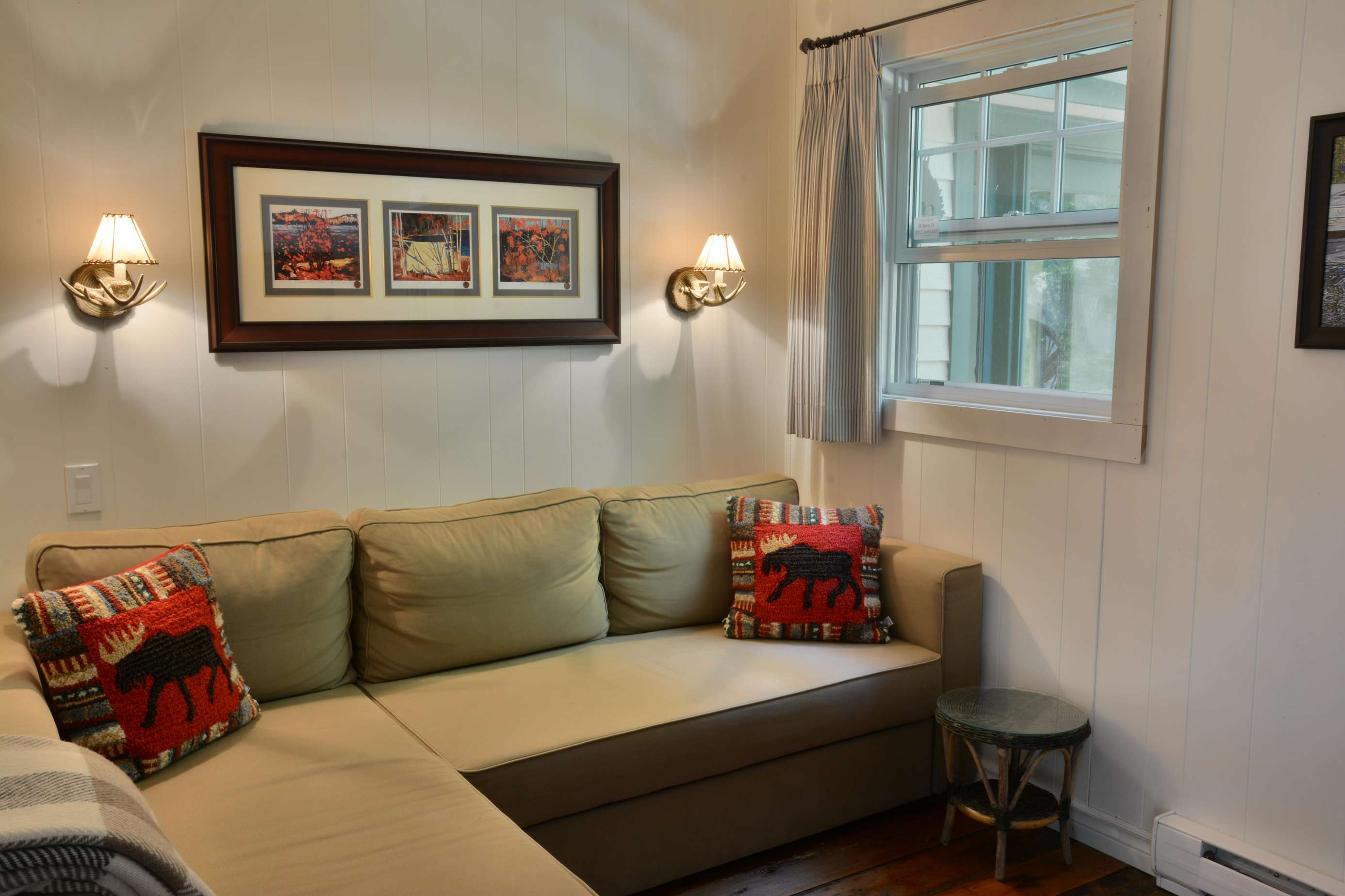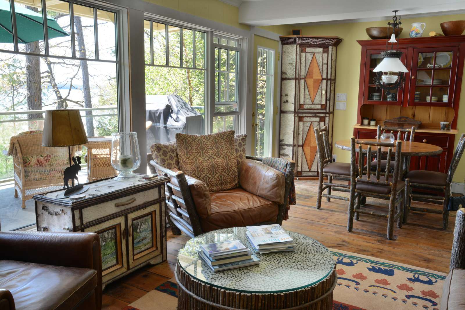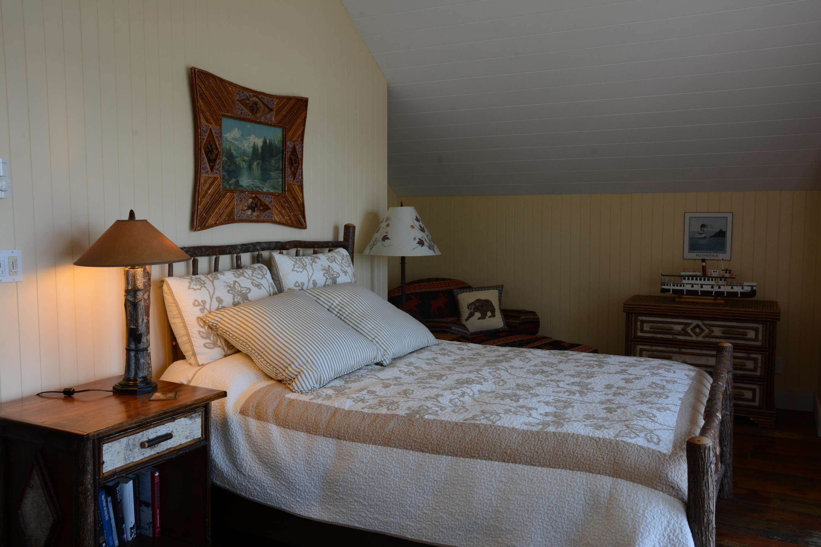 The lower level is the secret jewel of the cottage. Similar to a separate bunkie, it is a separate suite to the cottage. With a stone terrace in front, the suite has its own entry with double French screen doors just above the water's edge. Sleep listening to the sounds of the water gently hitting the shoreline in a beautiful Queen bedroom suite with its private bathroom and outdoor shower, surrounded by large rocks for privacy.