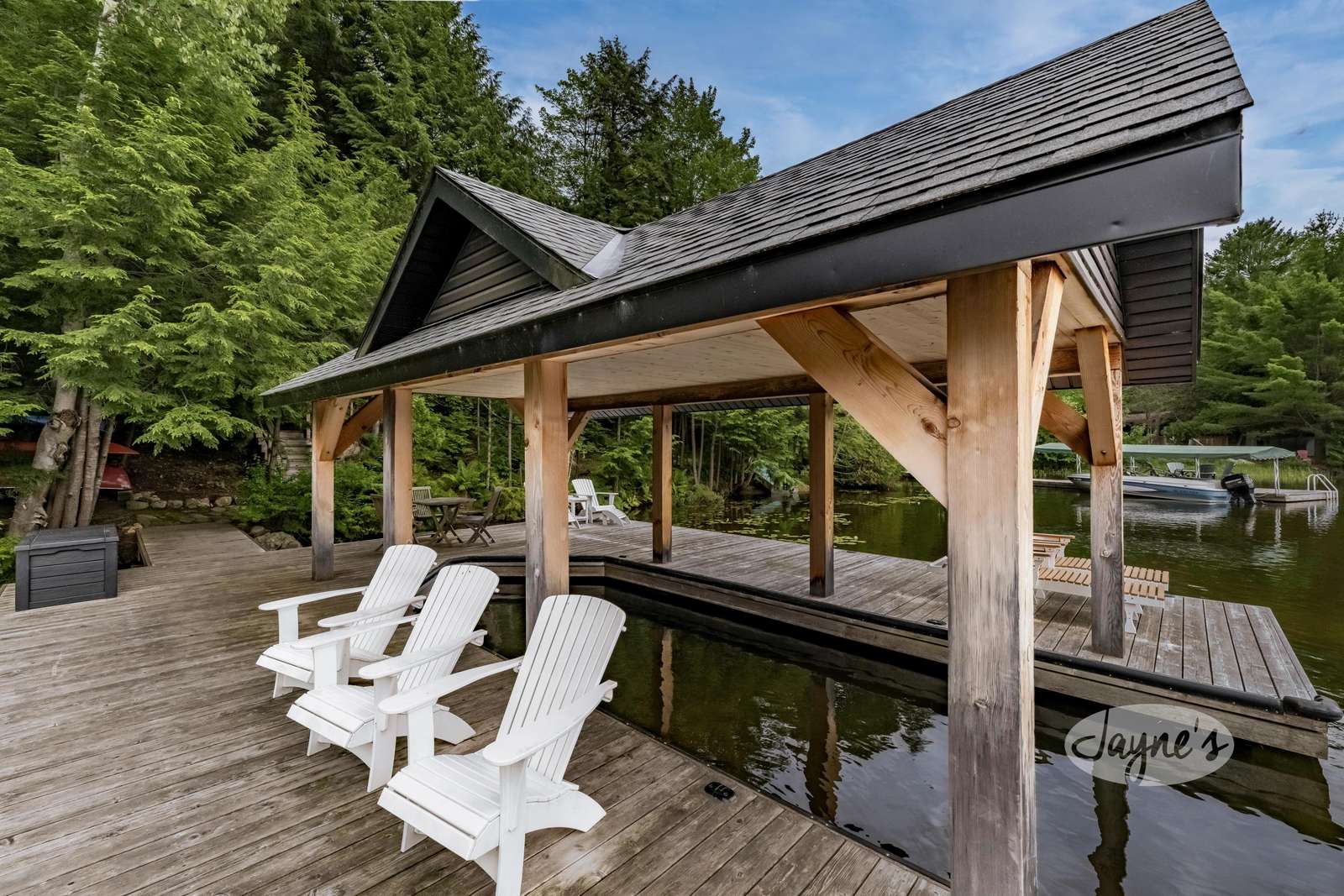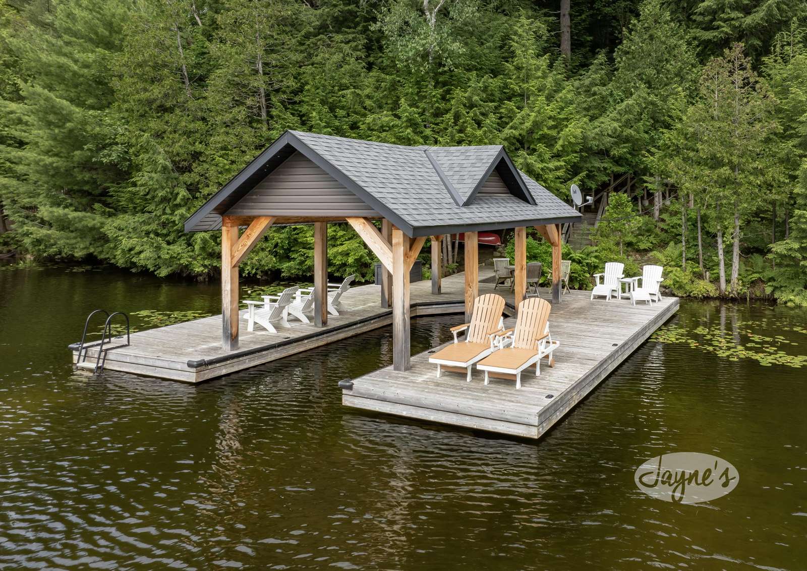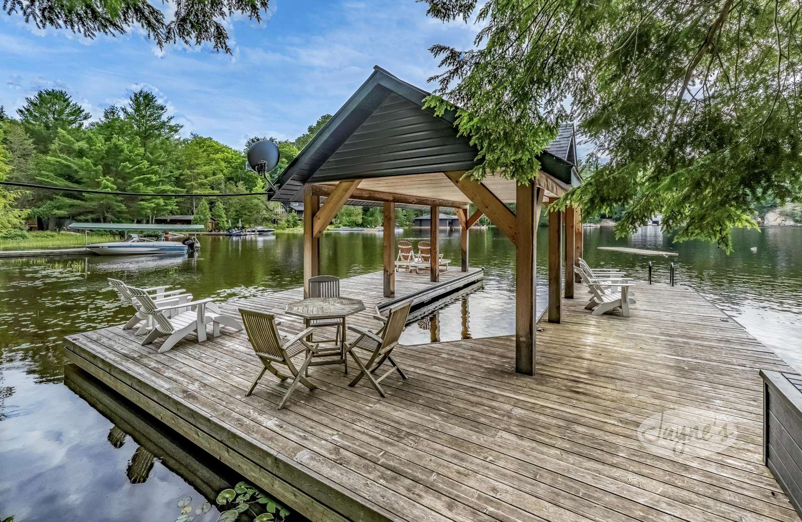 One Slip Boat Port with Large Sundeck + 4 Muskoka Chairs + 2 Loungers + 3 Person Bistro Set