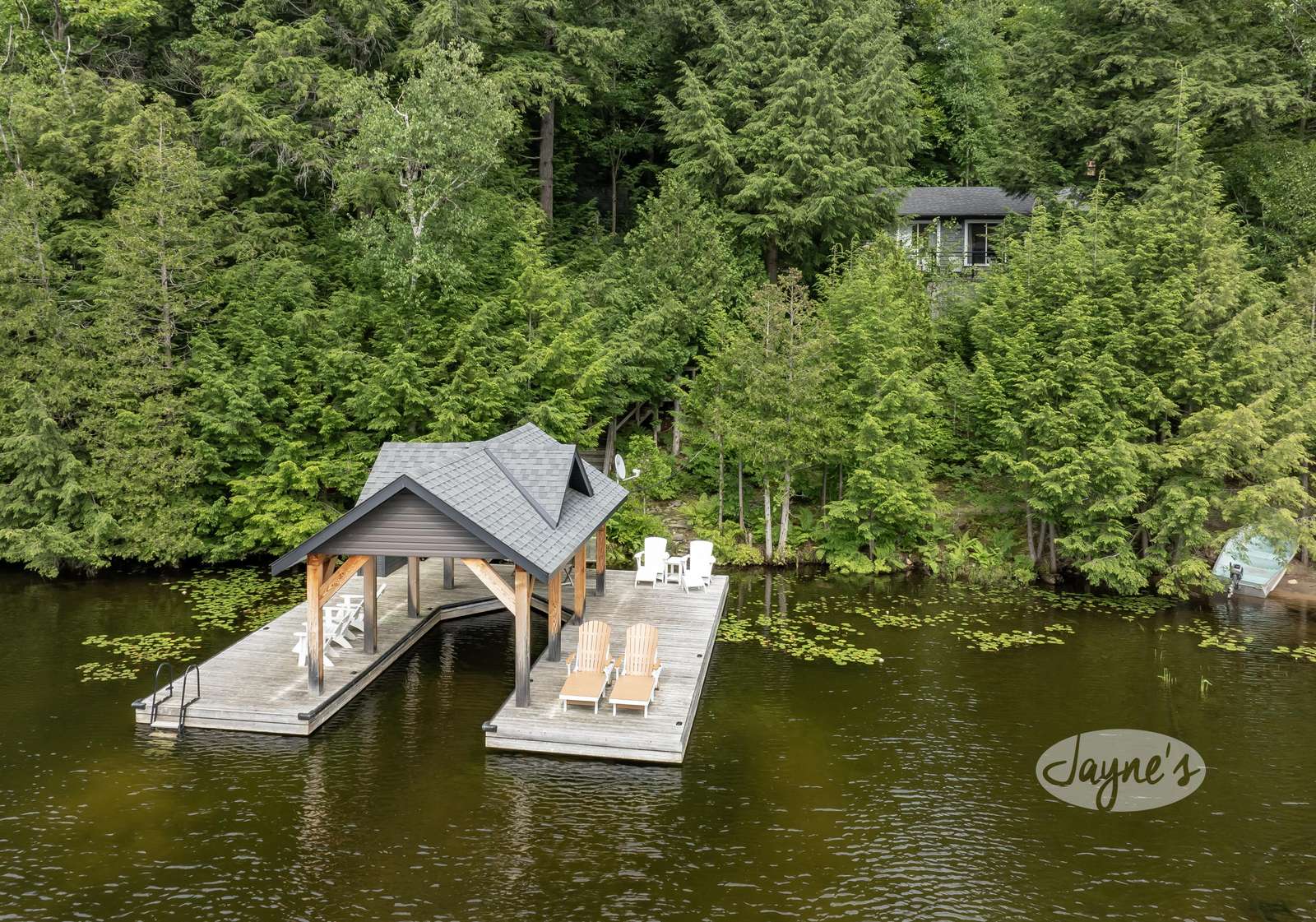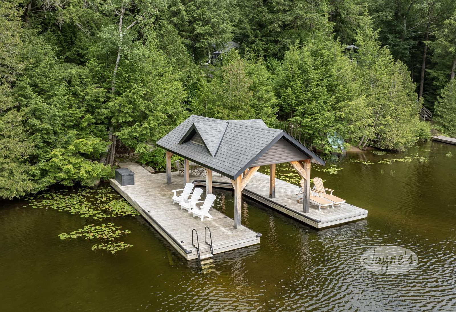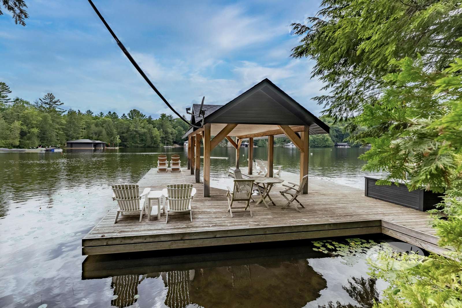 One Slip Boat Port with Large Sundeck + 4 Muskoka Chairs + 2 Loungers + 3 Person Bistro Set