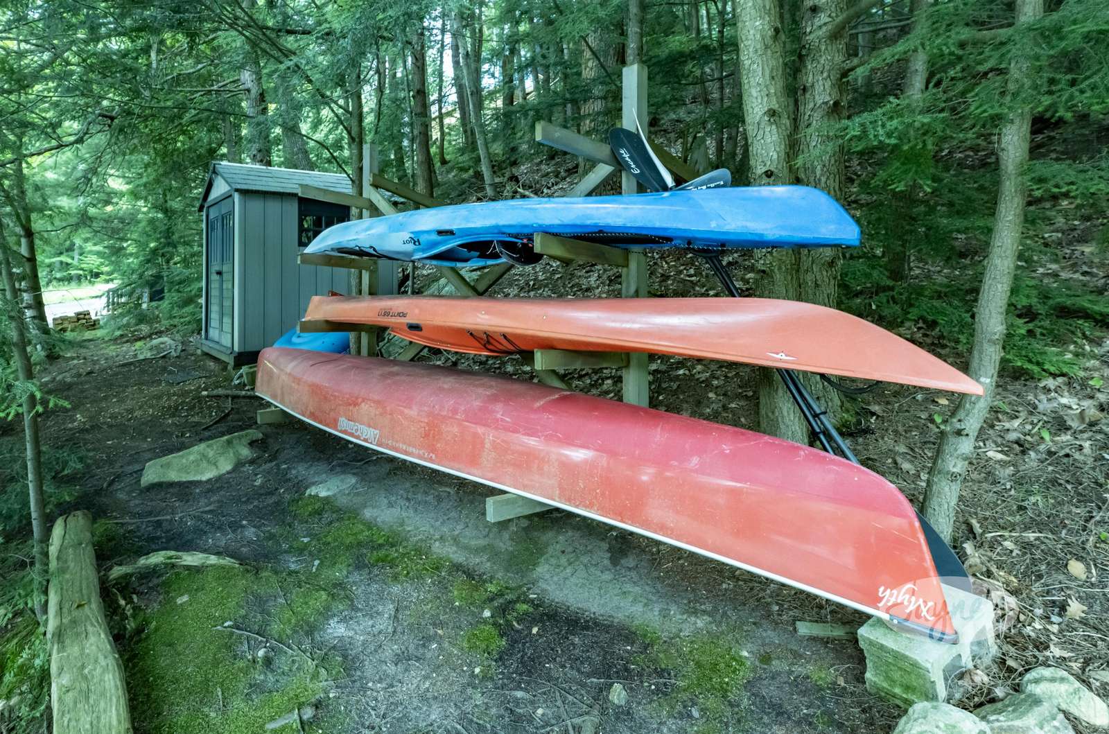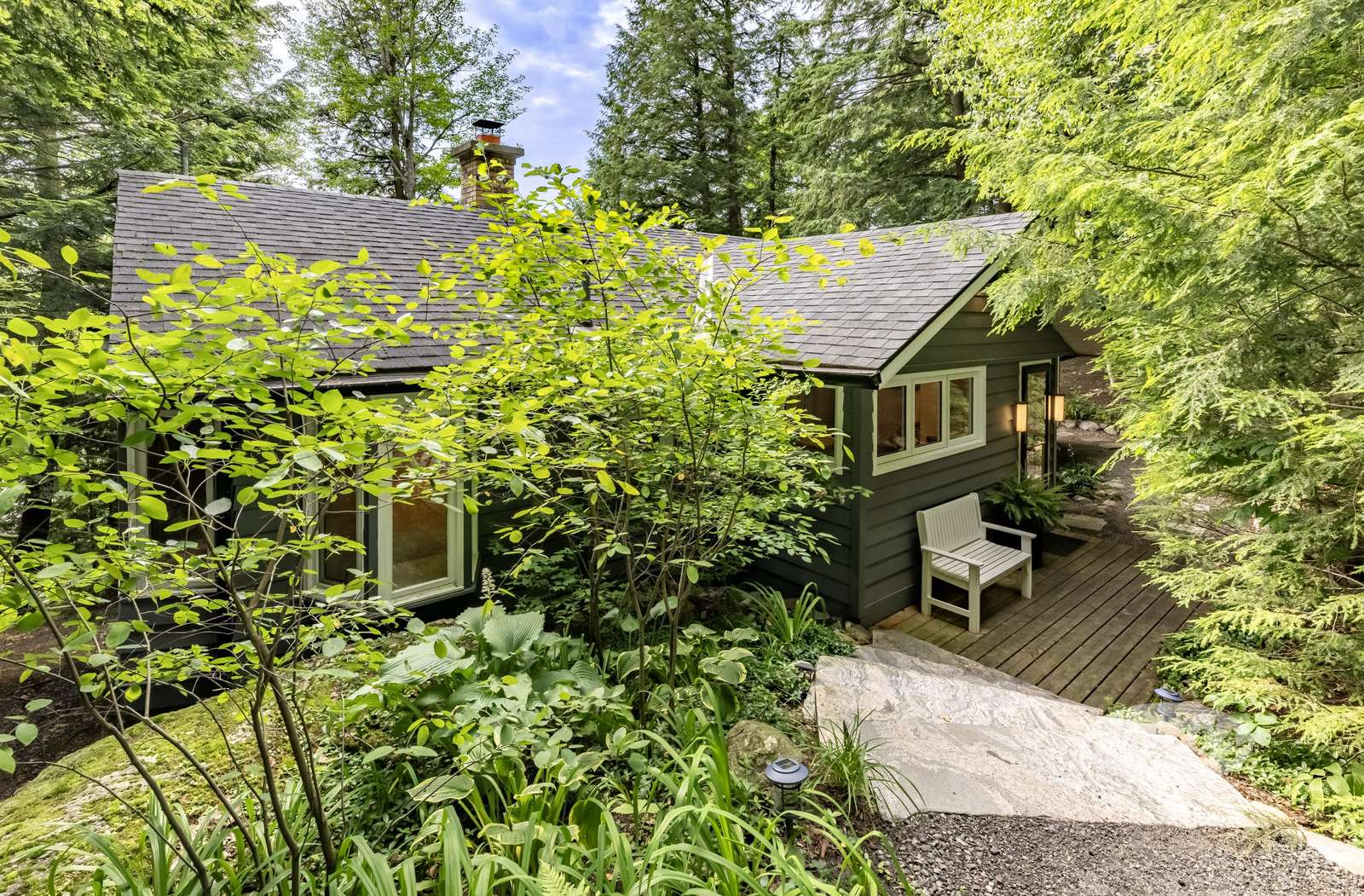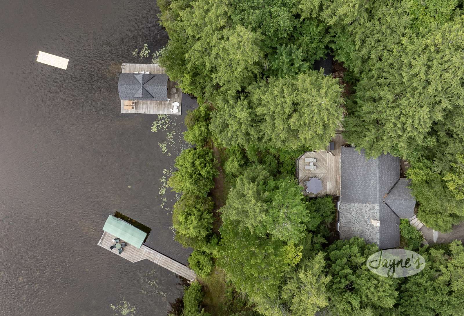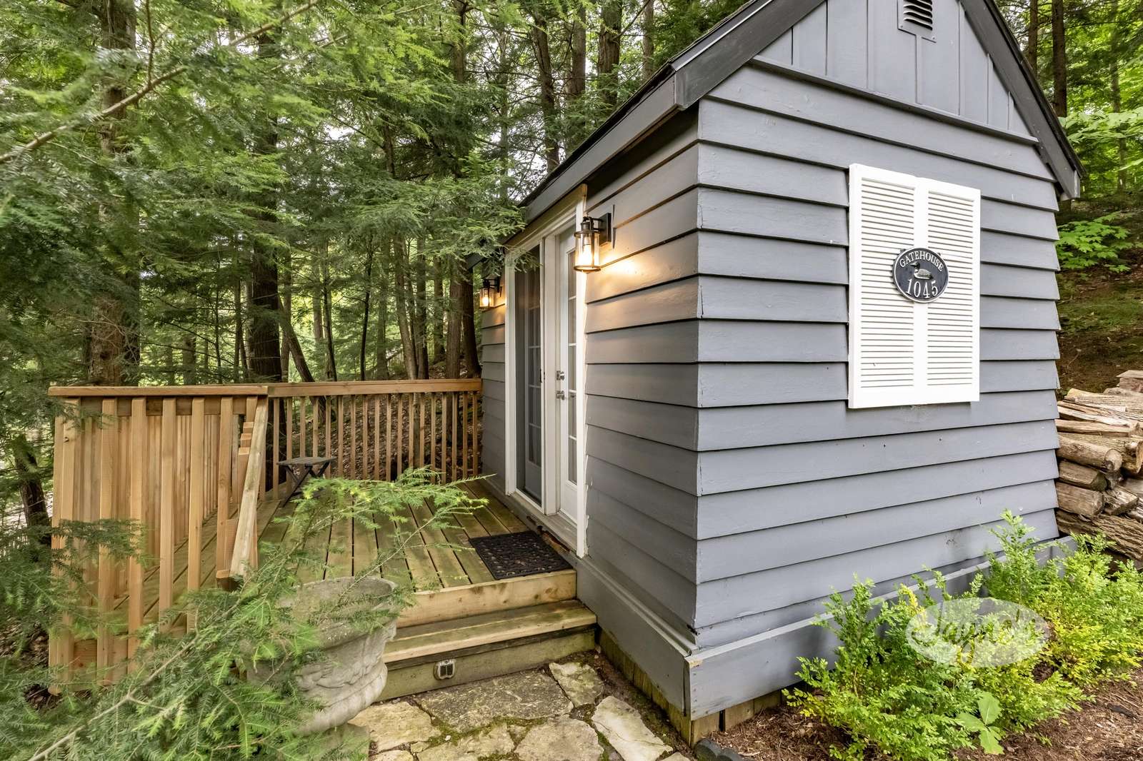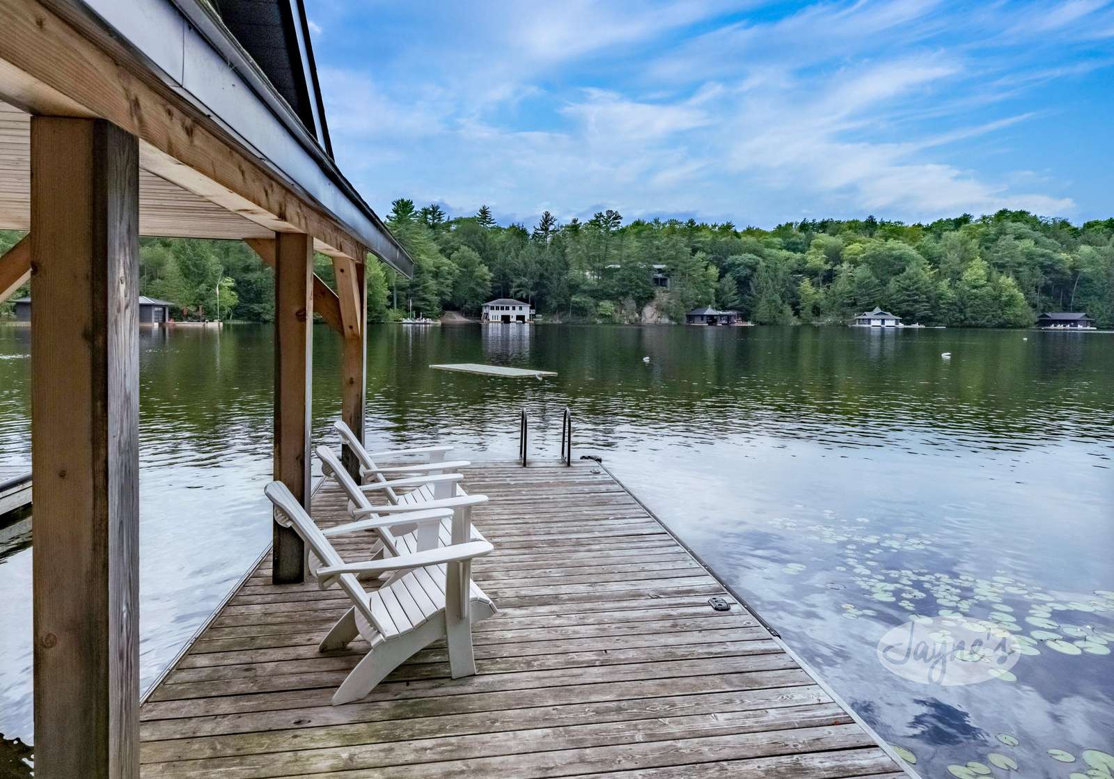 BIRD'S NEST, a sloped pebbled walkway leads guests to Bird's Nest. Nestled amongst mature trees, this beautiful cottage experiences south-west exposure and all day sun. Inspired by its namesake, the large circular deck off the dining room is a guest favourite when it comes to summertime entertaining. Outfitted with glass railings, guests can experience elevated unfettered views of Lake Joe while enjoying their morning coffee. Furnished with a 6 person outdoor dining room table and large sun umbrella, this outdoor space does not disappoint! A stone staircase from the cottage deck leads you along a stone pathway to the south facing waterfront. Perfect for guests with young children, the shoreline boasts a shallow sand bottom beach area. The waterfront is also home to a one slip boat port and large deck. Equipped with four Muskoka chairs, two lounges, and a small 3 person bistro set, the sundeck provides a secondary entertaining space for days spent near the water. Located slightly above the shoreline, a small traditional bunkie can be seen not far from the cottage just off the deck.