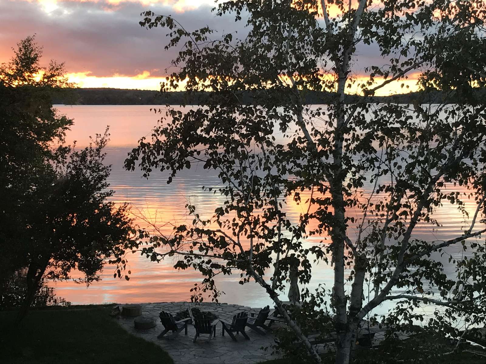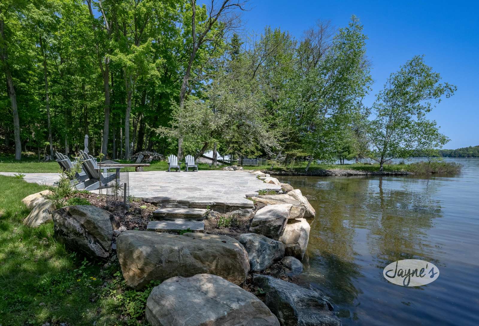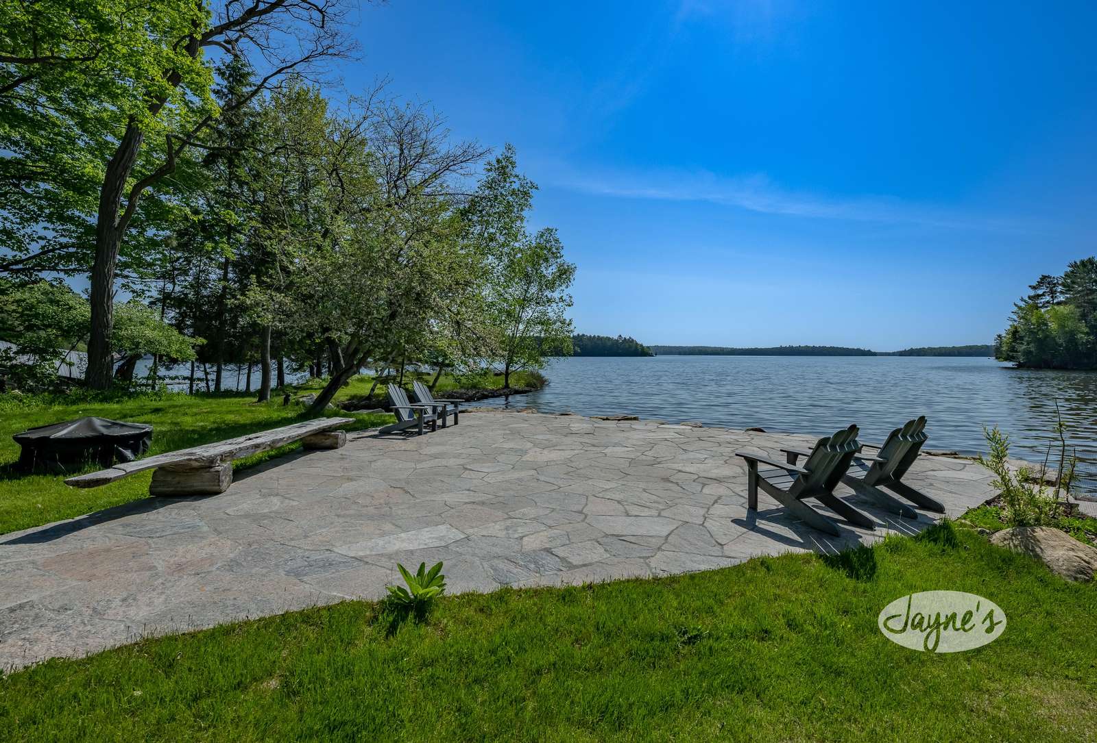 Stone patio by the waterfront with firepit, 4 Muskoka chairs, and picnic table and umbrella