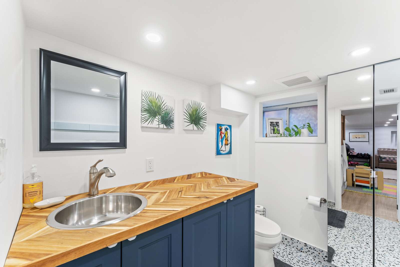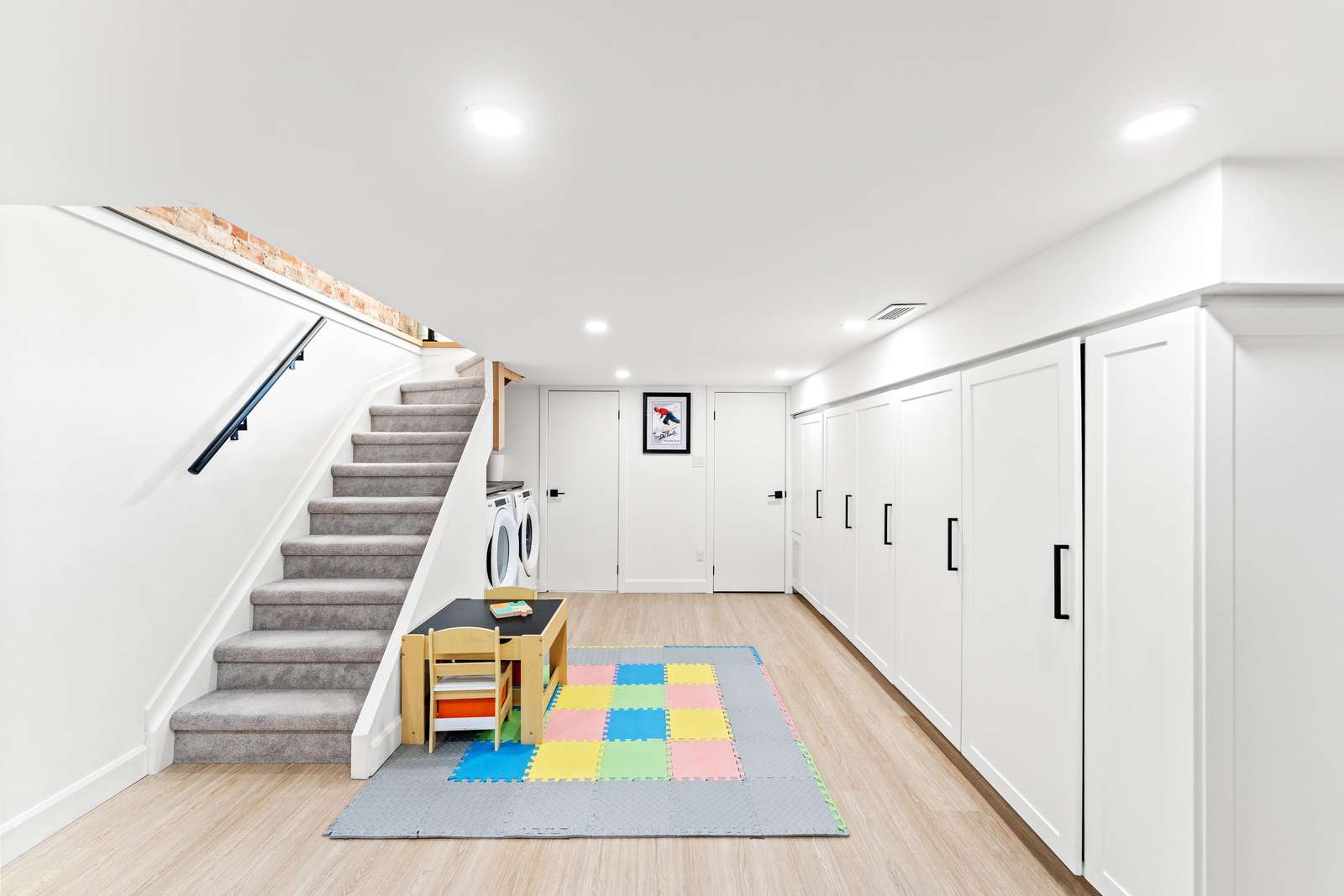 Spacious room with laundry, play area for children, large sofa and TV, free weights for your workouts