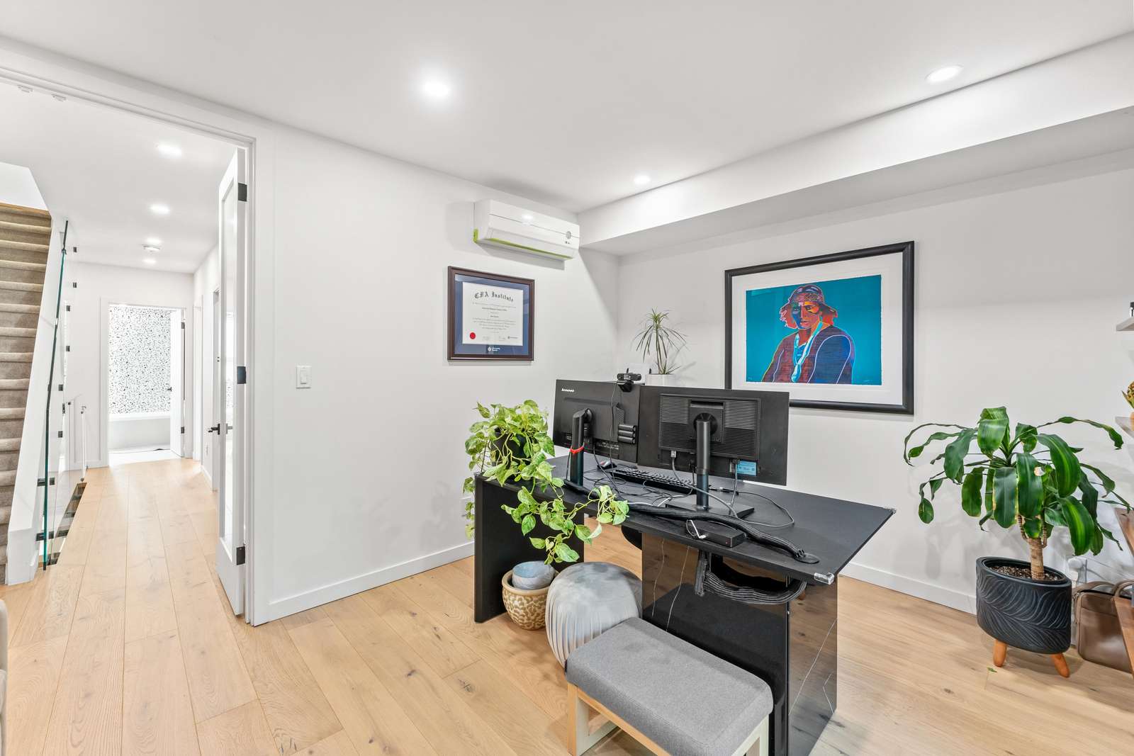 Beautifully designed work space with desk, Pull out queen sofa and walkout to balcony