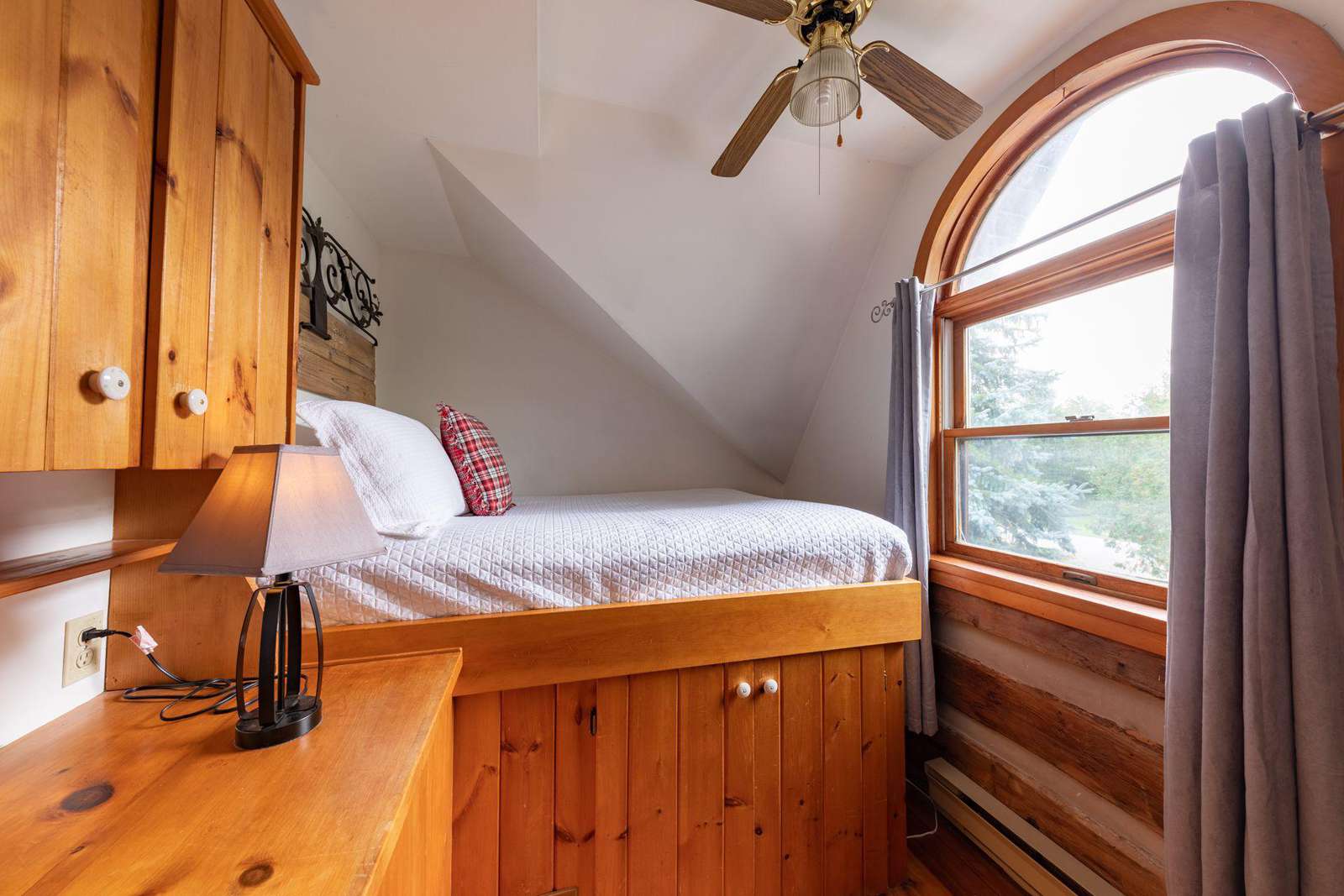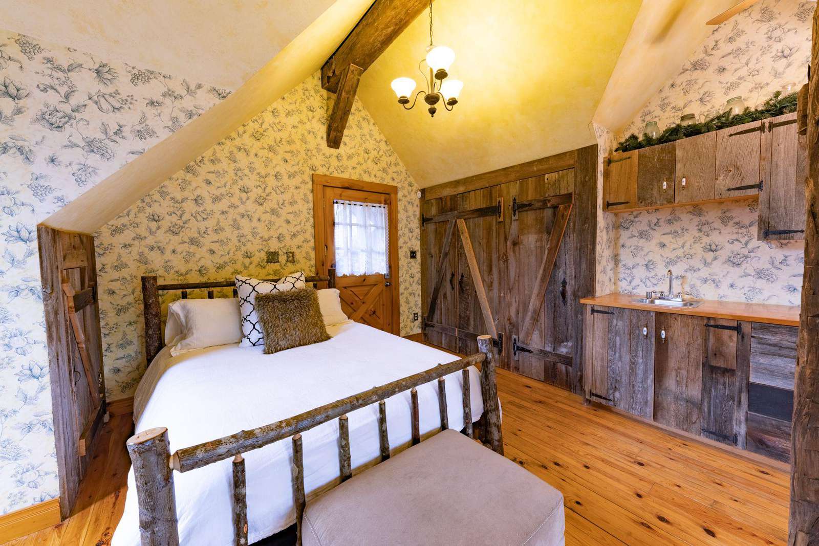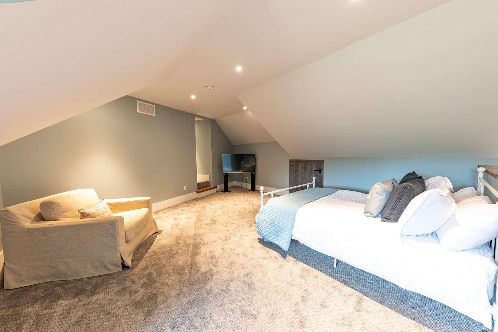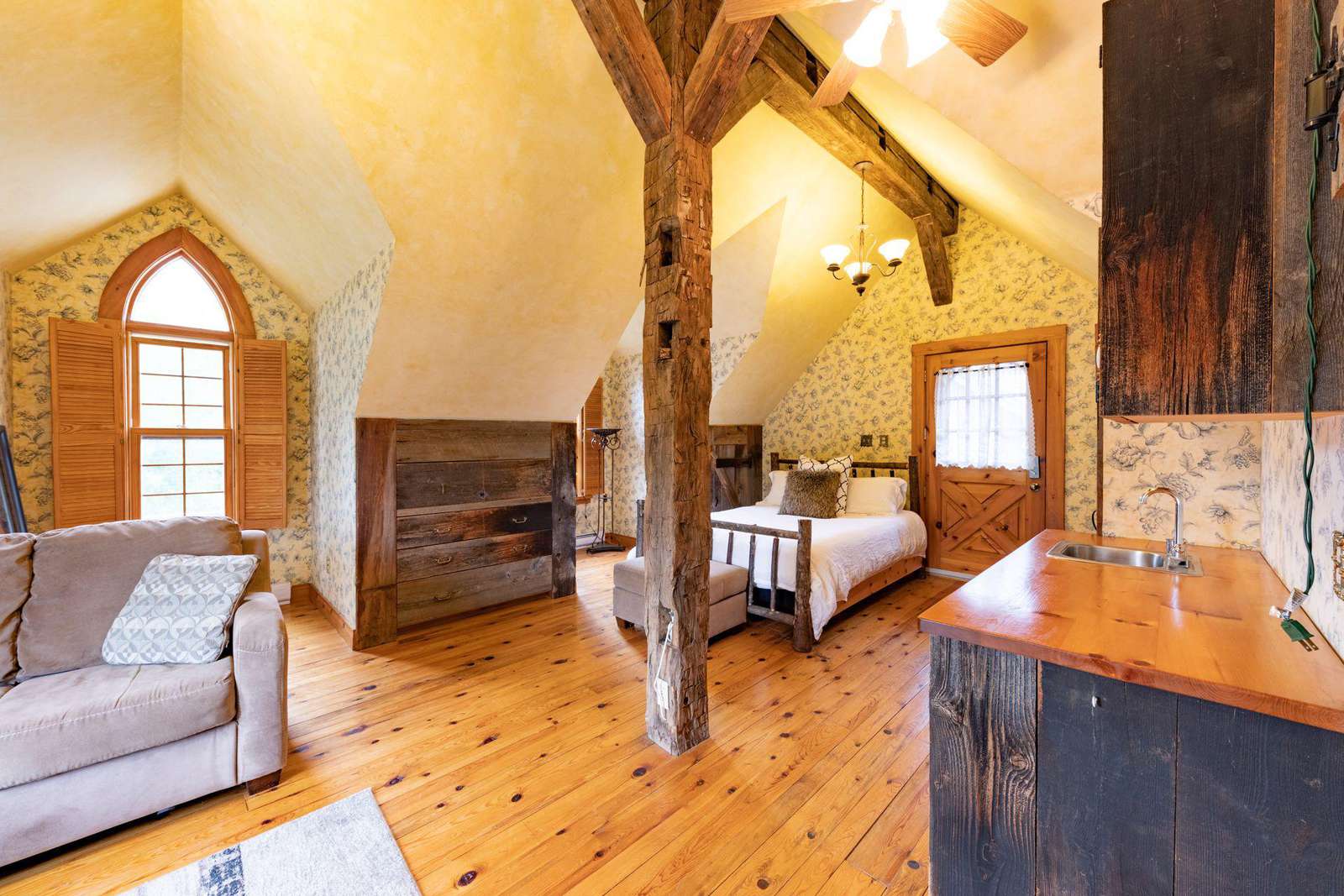Overlooking the backyard, the cozy loft provides an open concept living area with L-shaped sofa and kitchenette, transitioning into the bedroom and bathroom.