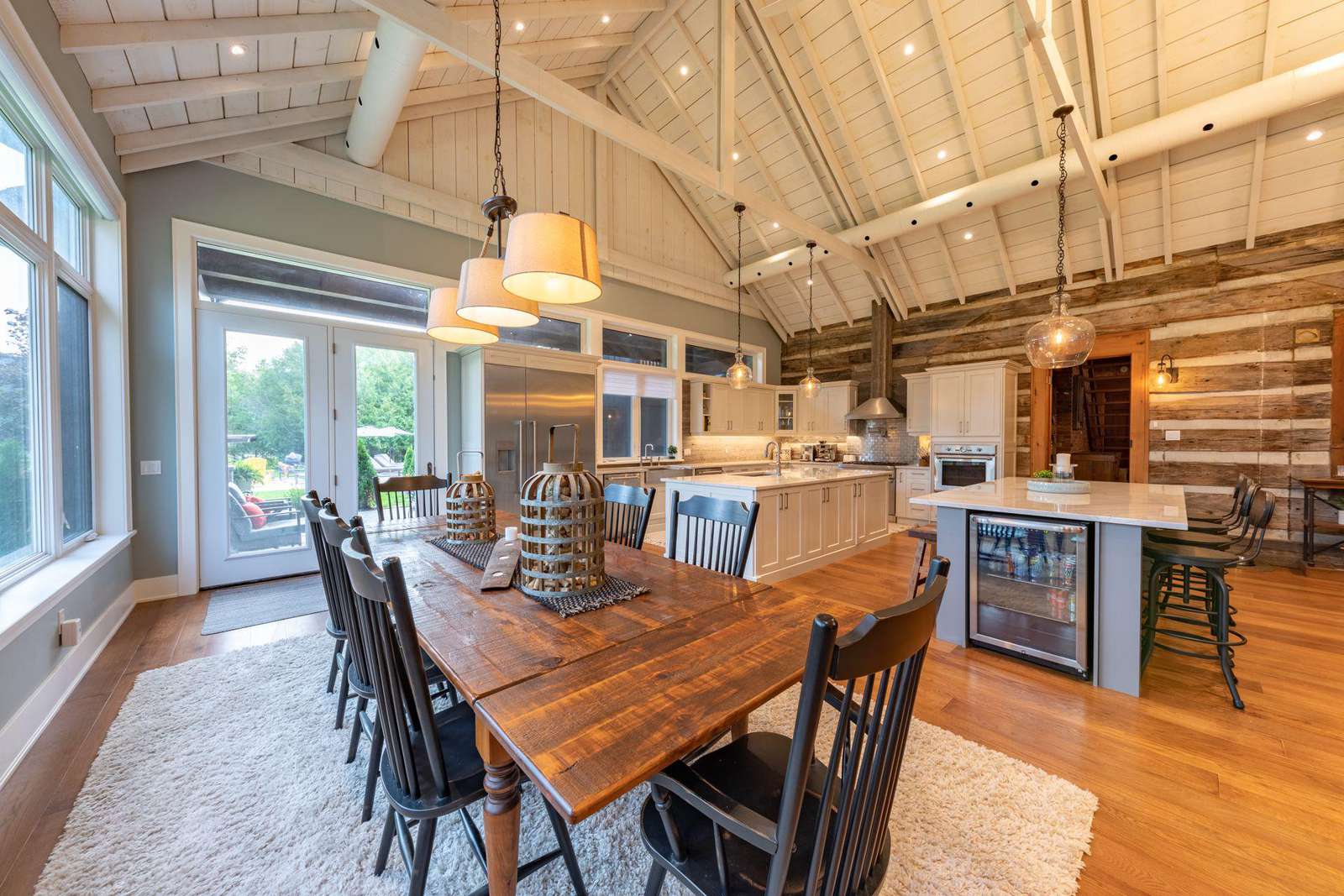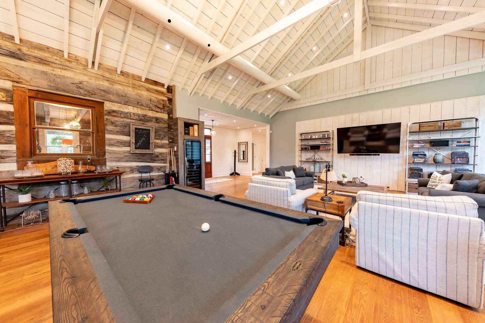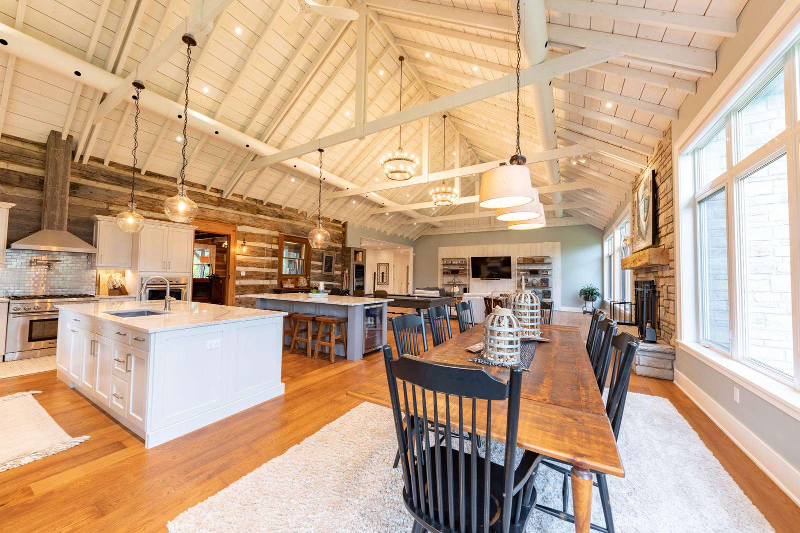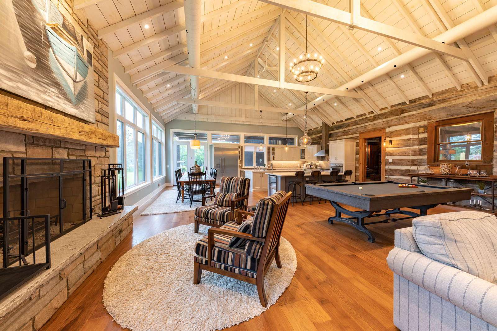 Vaulted cathedral ceilings with circular chandeliers, floor-to-ceiling windows and ample seating. Towering stone wood burning fireplace, pool table and large TV.
