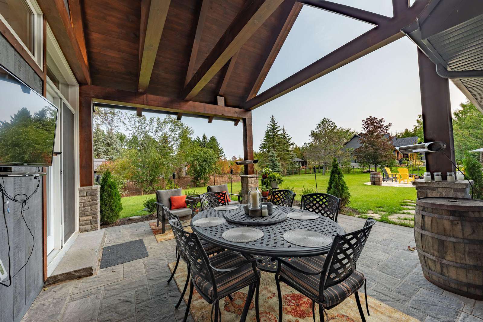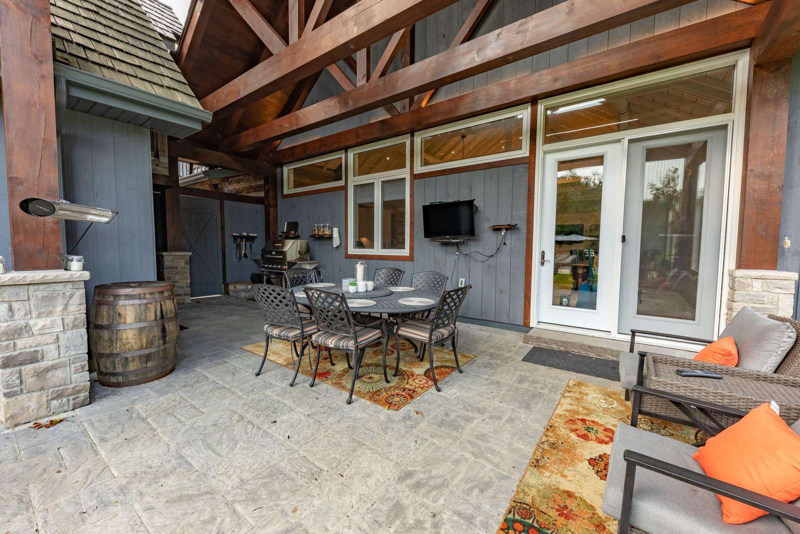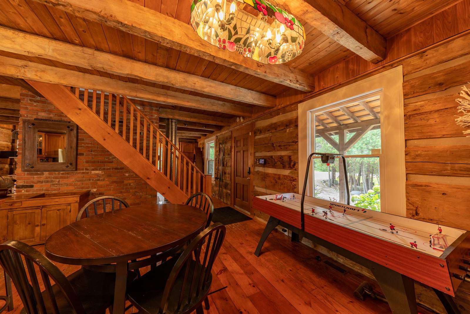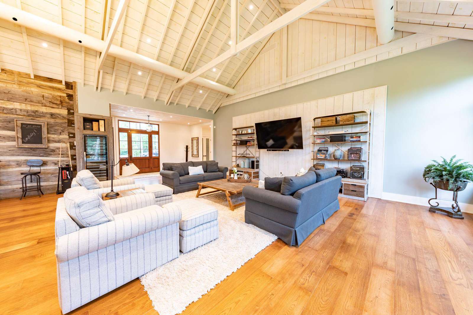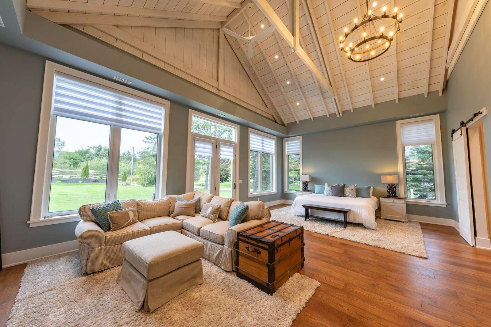 Vaulted cathedral ceilings with circular chandeliers, floor-to-ceiling windows and ample seating. Towering stone wood burning fireplace, pool table and large TV.
