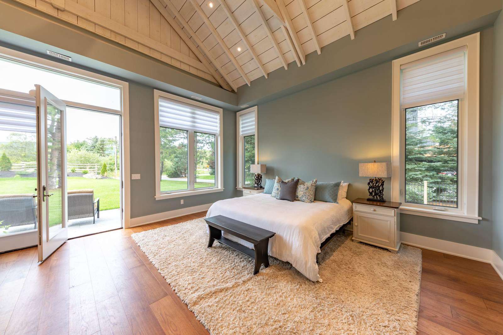 Bedroom 1 - King (Primary) with ensuite, sitting area with TV, and walkout to patio