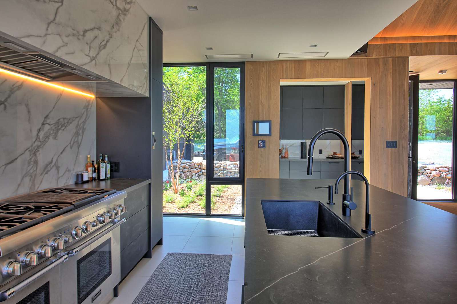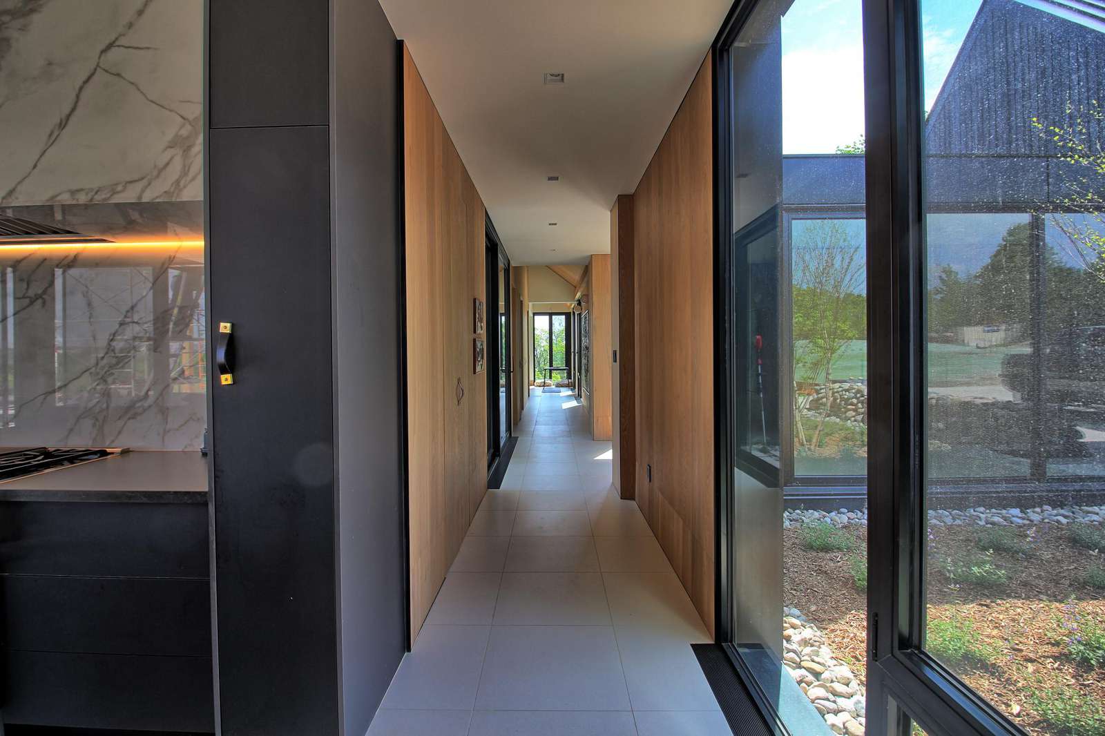The open-concept main barn features a stunningly modern kitchen with high-end appliances, a spacious island and a separate pantry with plus a dry bar and an additional fridge.
