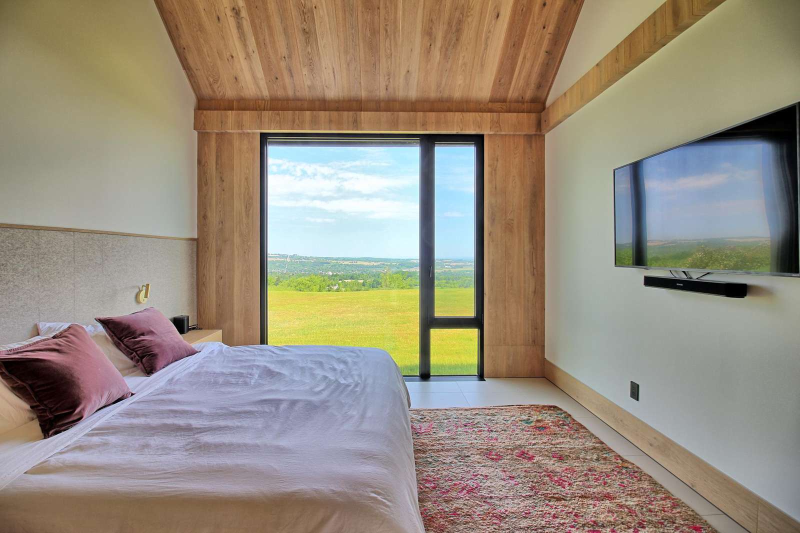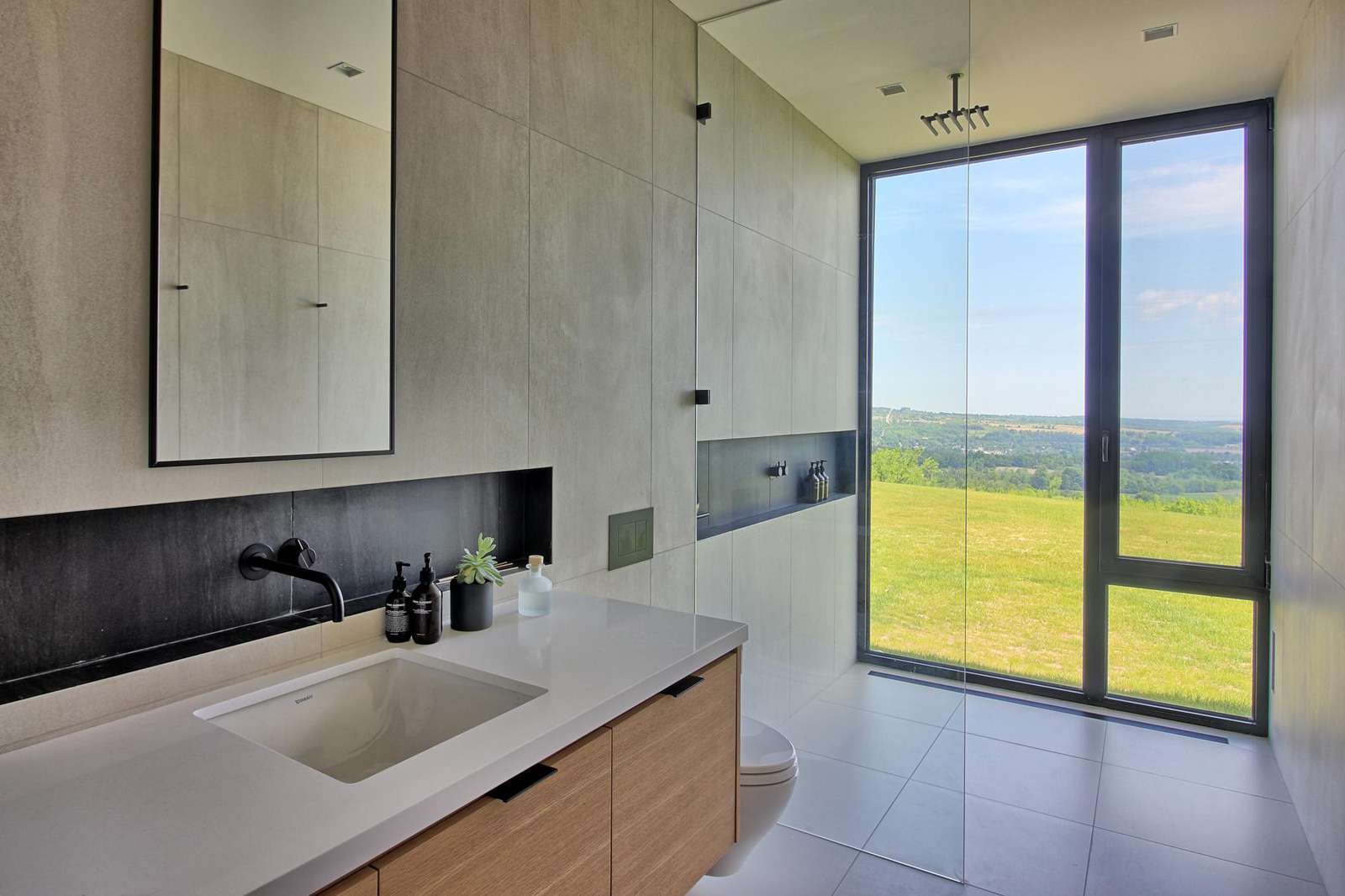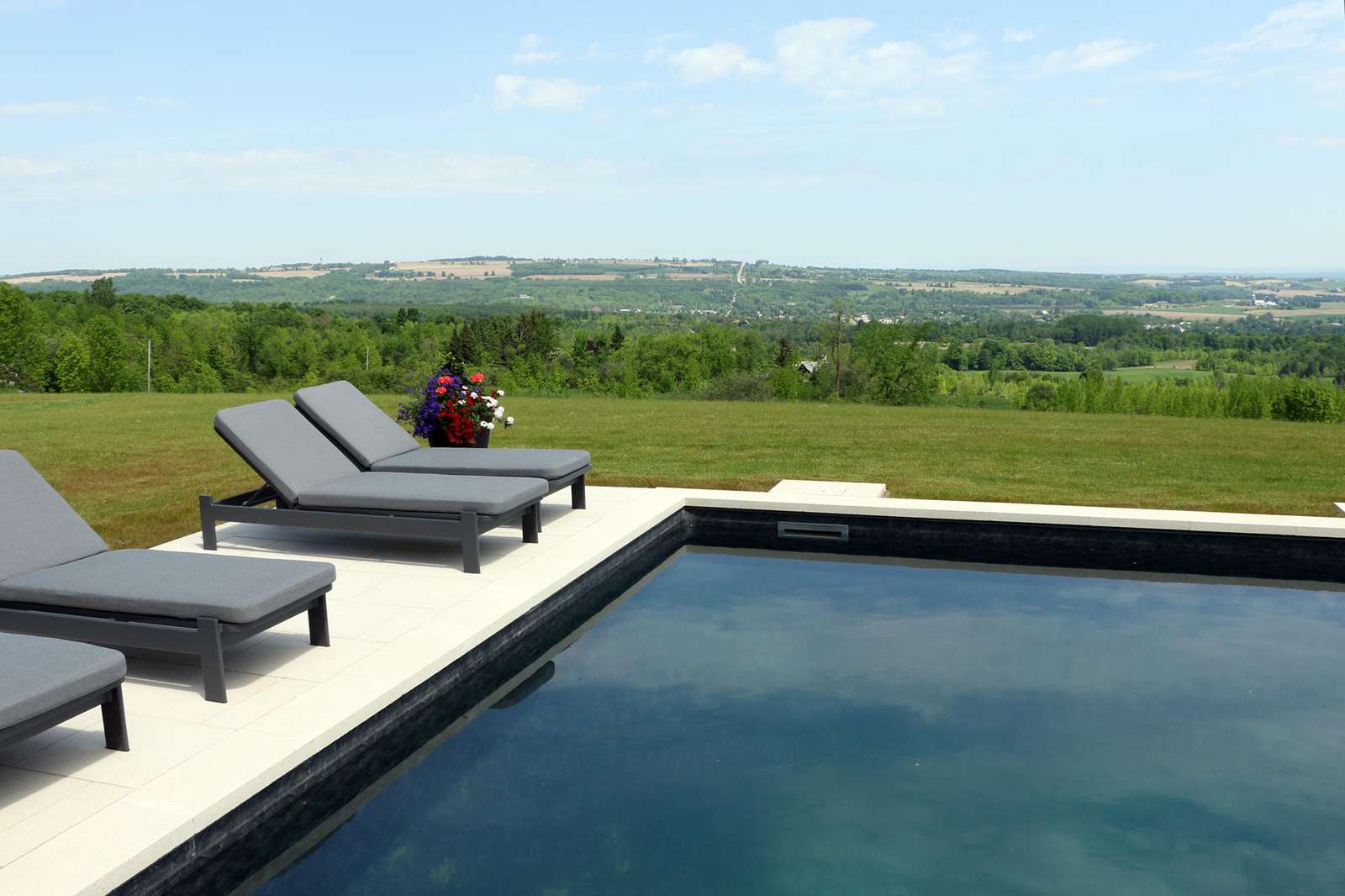 Itβs actually three separate buildings, or barns, connected by glass walkways. The main barn offers multiple walkouts to the grassy level land, an outdoor dining table and the stunning pool! The pool features 4 lounge chairs for relaxing in the sun and taking in the long views of the peaceful surrounding area. The outdoor dining table sits underneath a pergola and can sit up to 10 people. The property also boasts an outdoor shower for cleaning off after a swim or a session under the basketball net!