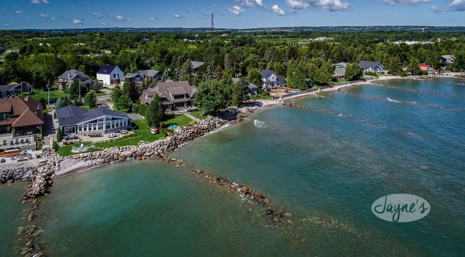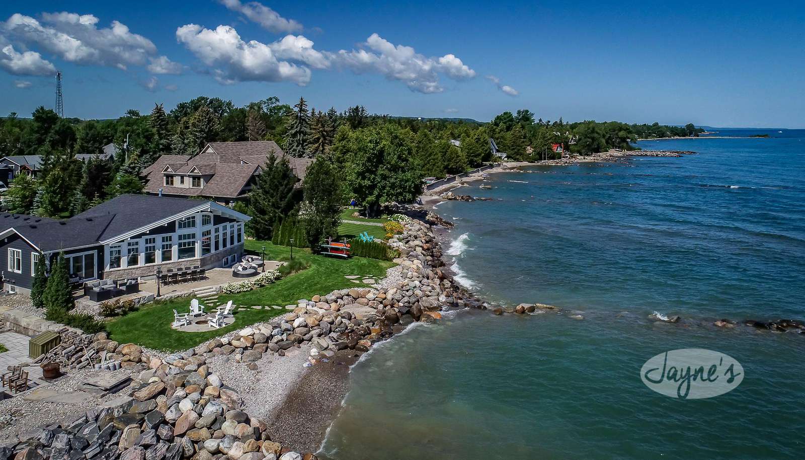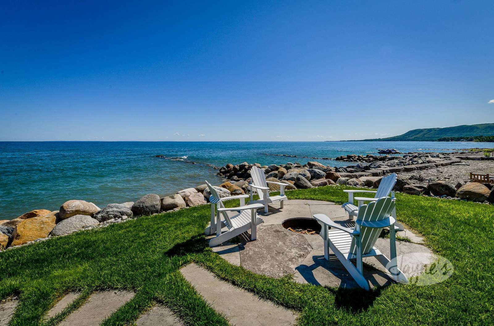 BY THE BAY - This beach house bungalow begins with absolutely stunning views over Georgian Bay with a magical Blue Mountain ski hill view off to the right. This flat, beautifully landscaped property has granite steps down to a shoal beach which will lead you to a walk in area at the water. Entry to the water has appointed flat natural stones. Also on this property you will enjoy an evening of roasting marshmallows under the stars at the firepit surrounded by Muskoka chairs. A stone deck with lovely patio furniture invites you to comfortably enjoy the view.