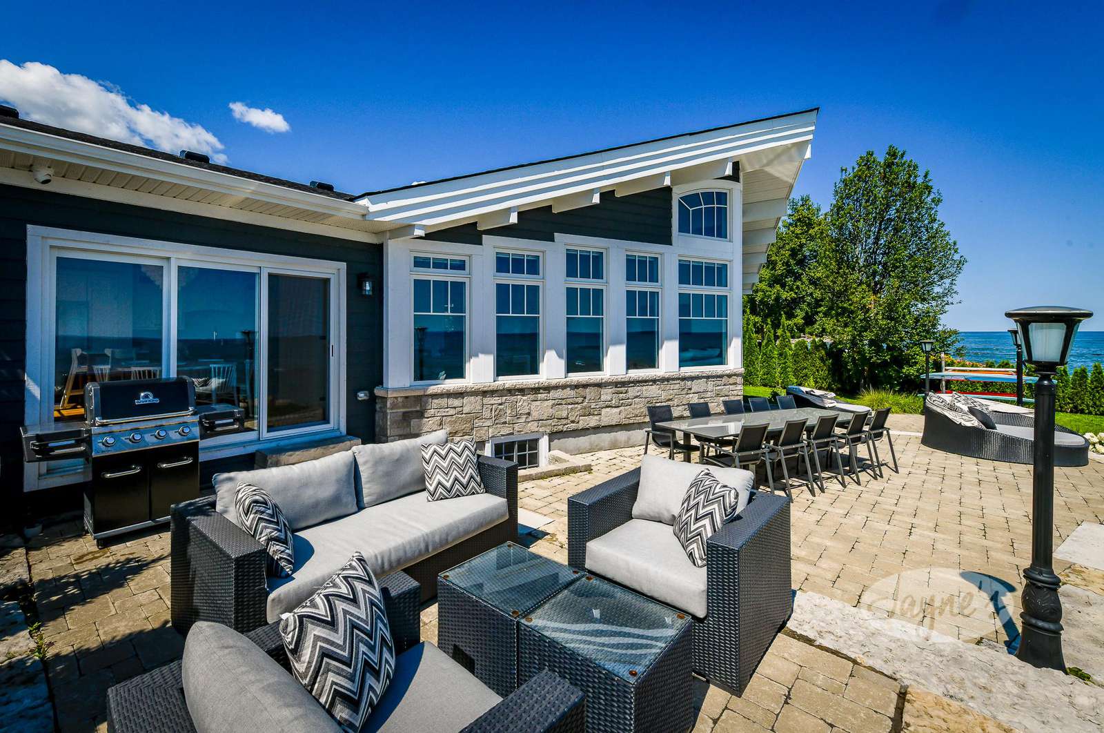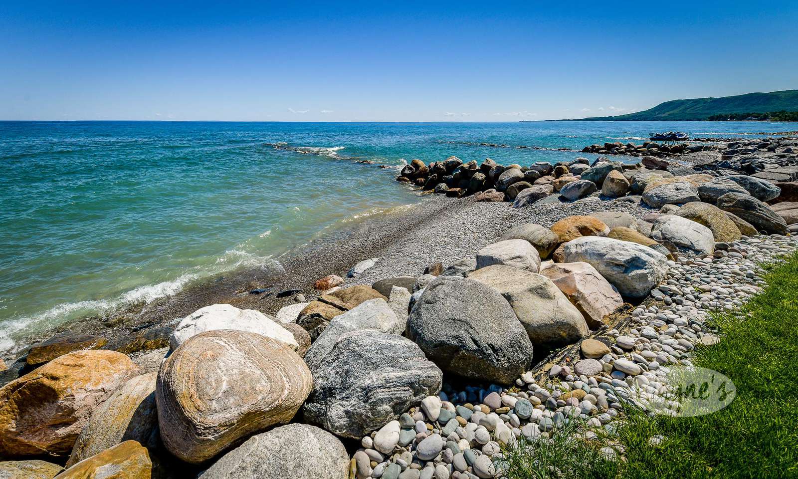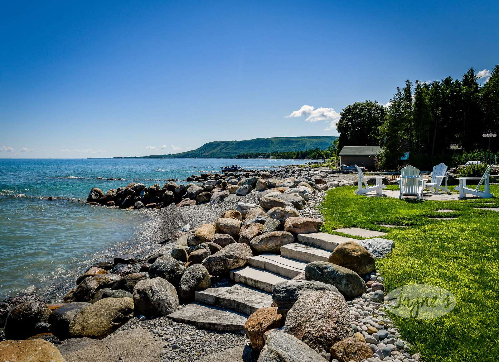 BY THE BAY - This beach house bungalow begins with absolutely stunning views over Georgian Bay with a magical Blue Mountain ski hill view off to the right. This flat, beautifully landscaped property has granite steps down to a shoal beach which will lead you to a walk in area at the water. Entry to the water has appointed flat natural stones. Also on this property you will enjoy an evening of roasting marshmallows under the stars at the firepit surrounded by Muskoka chairs. A stone deck with lovely patio furniture invites you to comfortably enjoy the view.
