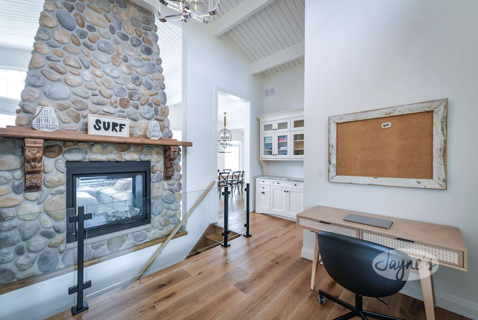 This lovely open concept living room boasts a floor to ceiling double sided stone gas fireplace, TV and comfortable sectional couch.