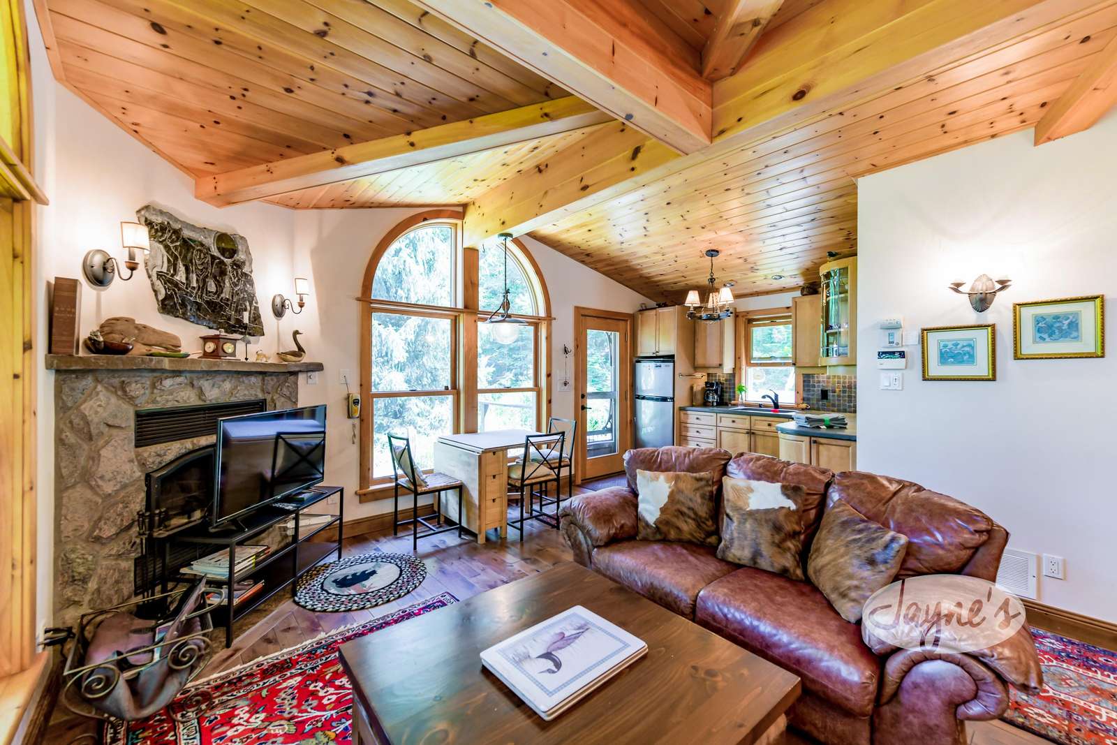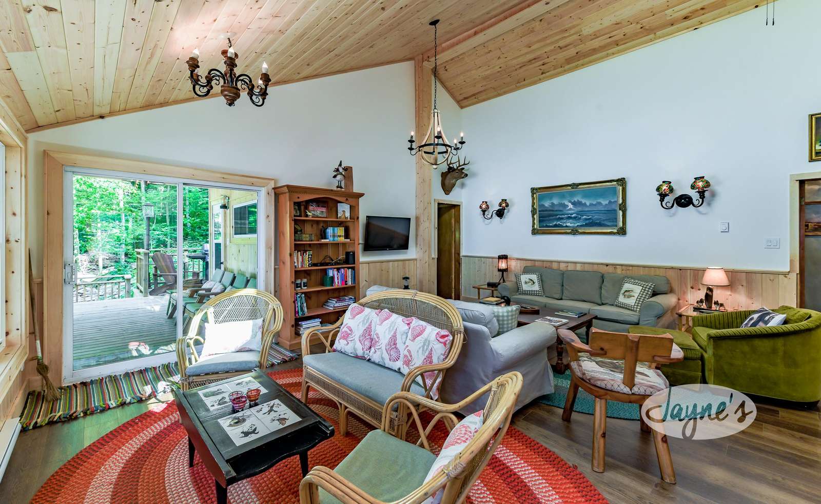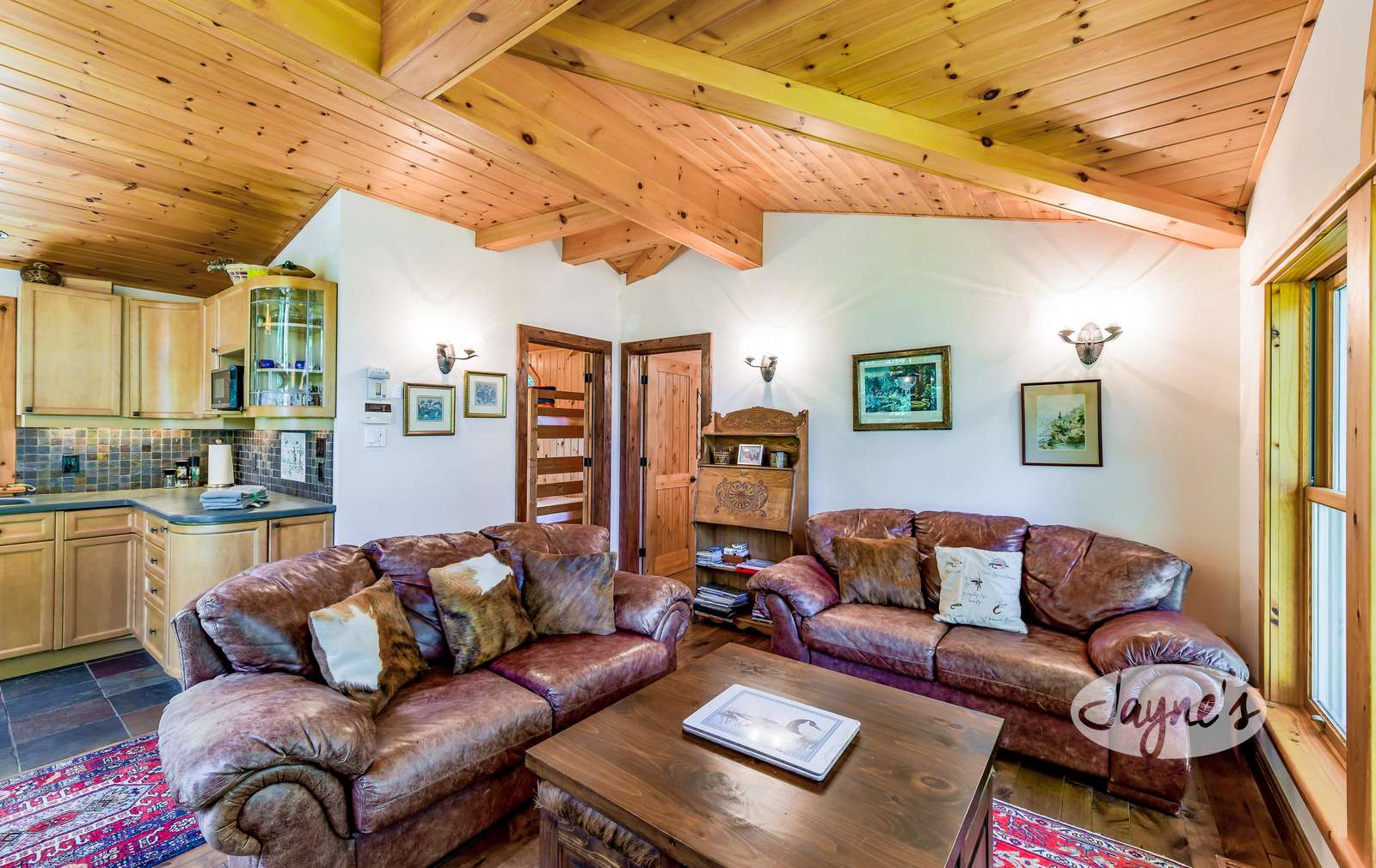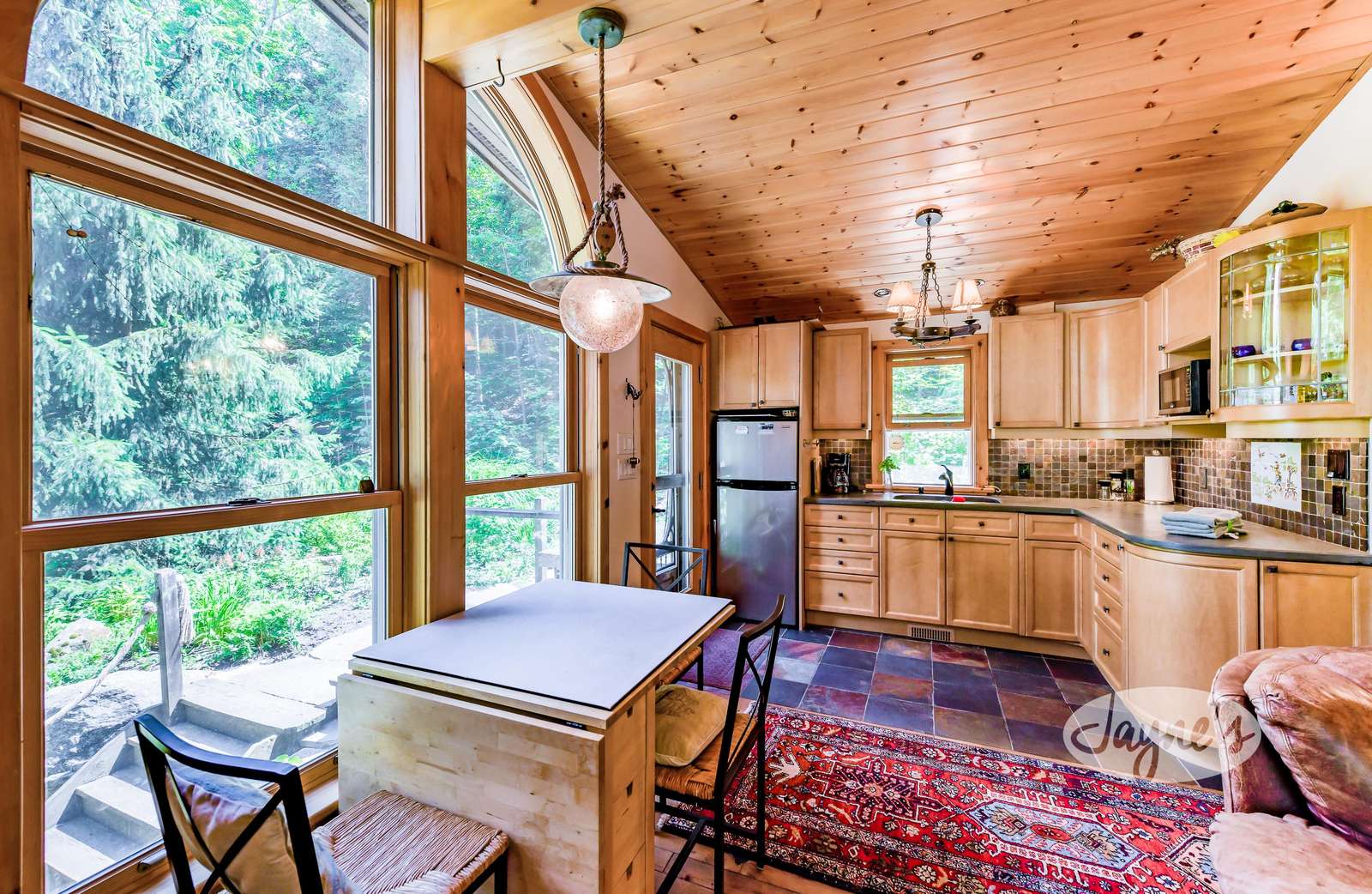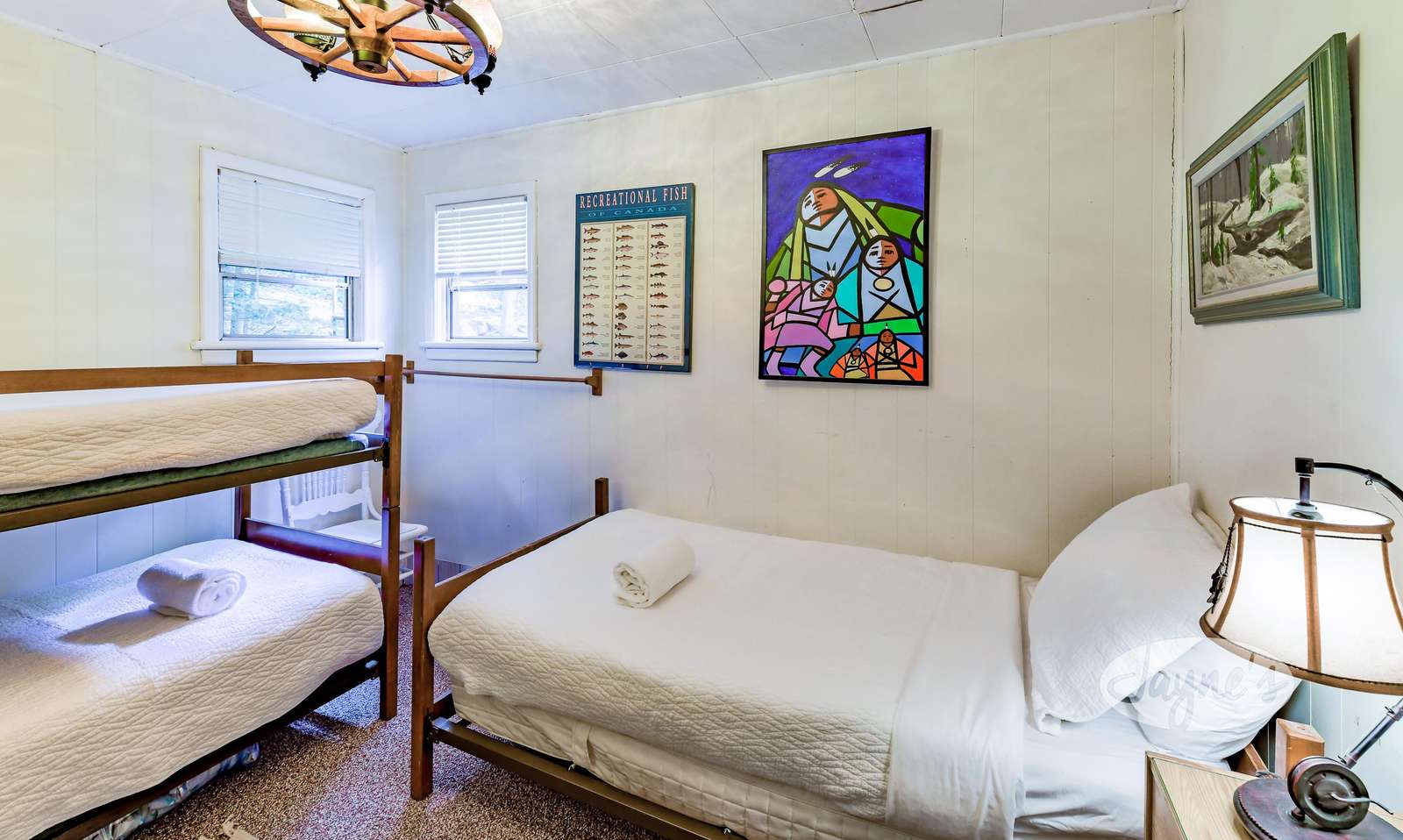A nice sitting area with leather couches rests on the lower level of the guest cottage, as well as a walkout to the deck through glass doors. A large bedroom with two twin beds and a 3-piece bath with shower rounds out the lower level. Here you will find the washer and dryer. The upper level consists of a lovely living area with large windows, fireplace, TV and a small dining table. Adjacent to the living area is a kitchen with a fridge, sink, microwave, fridge, and plenty of counter space. Off of the kitchen are a Queen bedroom, a room with 2 twin bunk bedsdouble bunk-beds, and a 3-piece bathroom with a shower.