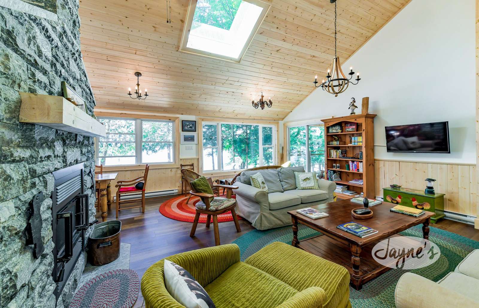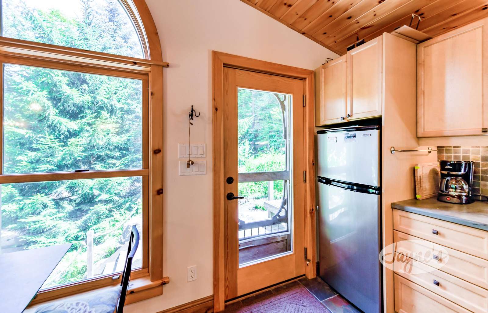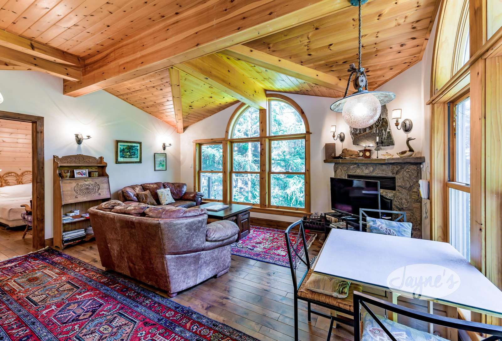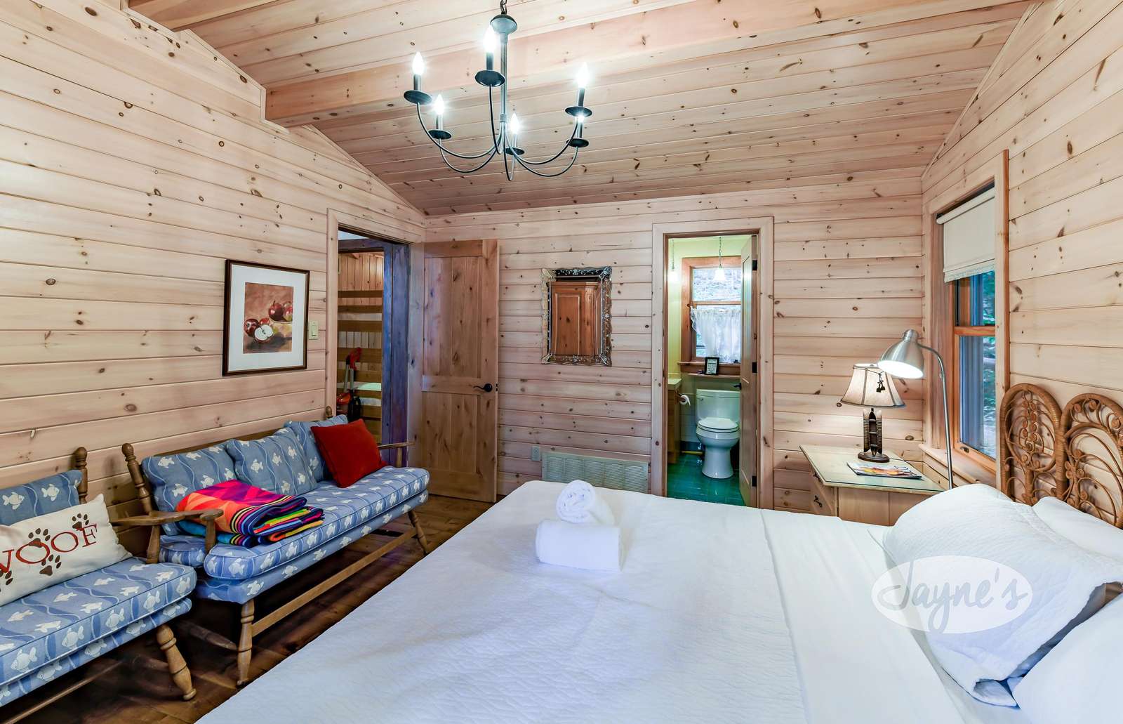 A nice sitting area with leather couches rests on the lower level of the guest cottage, as well as a walkout to the deck through glass doors. A large bedroom with two twin beds and a 3-piece bath with shower rounds out the lower level. Here you will find the washer and dryer. The upper level consists of a lovely living area with large windows, fireplace, TV and a small dining table. Adjacent to the living area is a kitchen with a fridge, sink, microwave, fridge, and plenty of counter space. Off of the kitchen are a Queen bedroom, a room with 2 twin bunk bedsdouble bunk-beds, and a 3-piece bathroom with a shower.