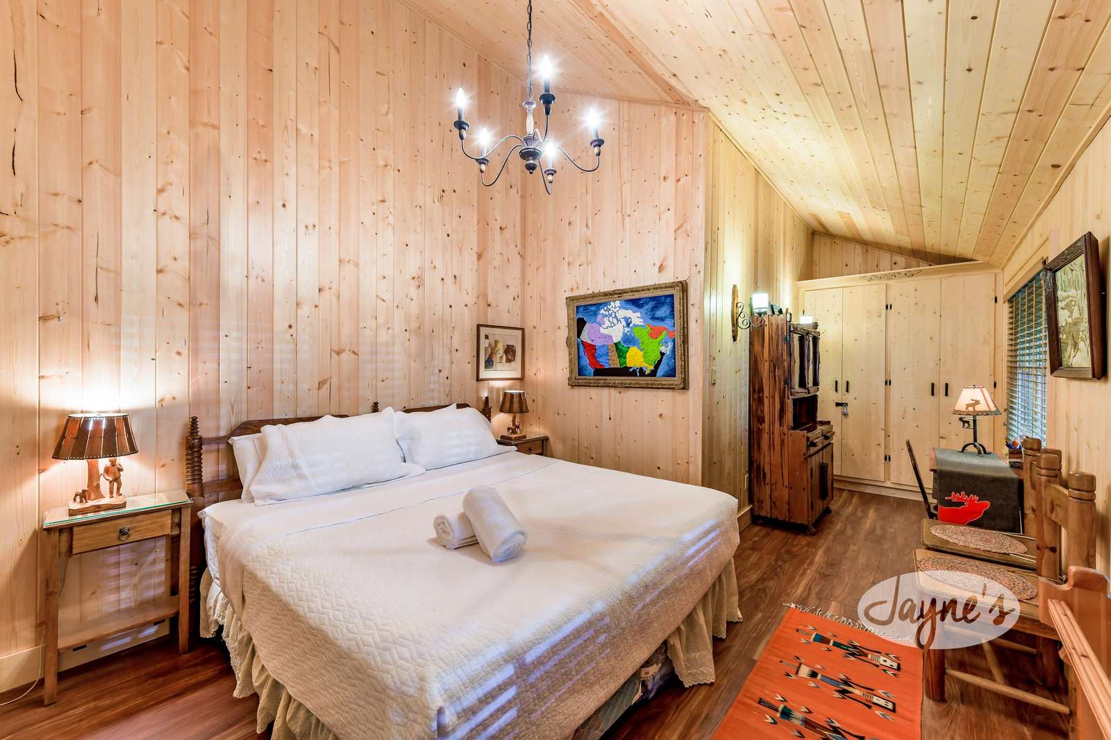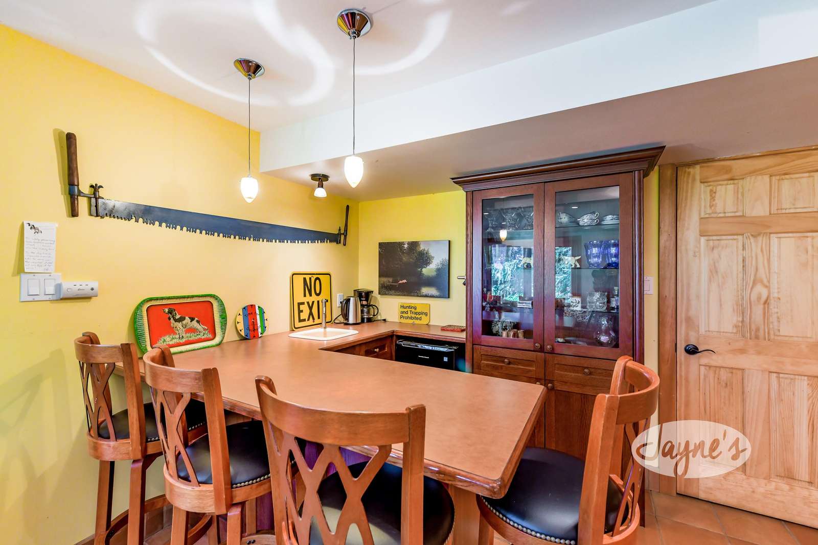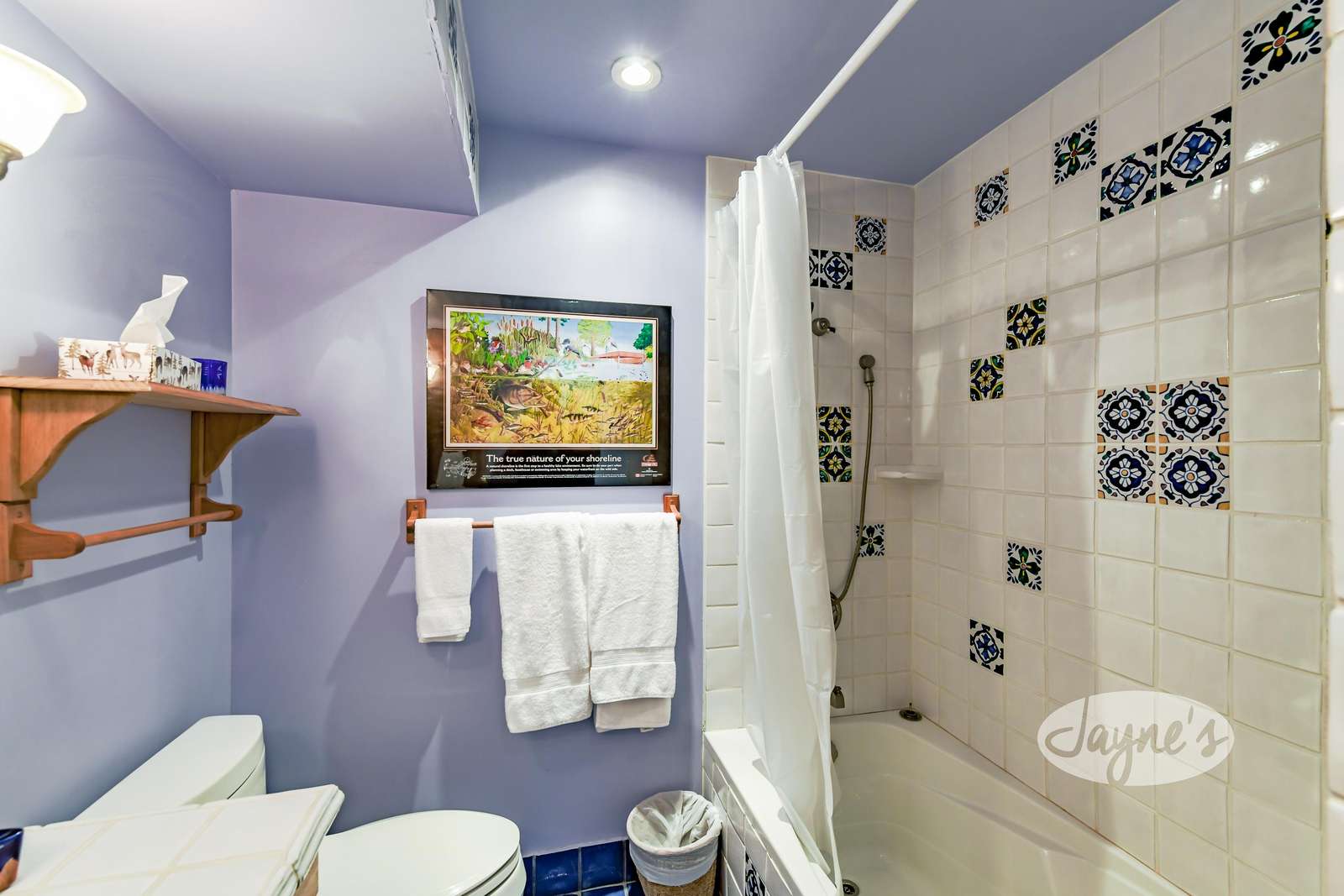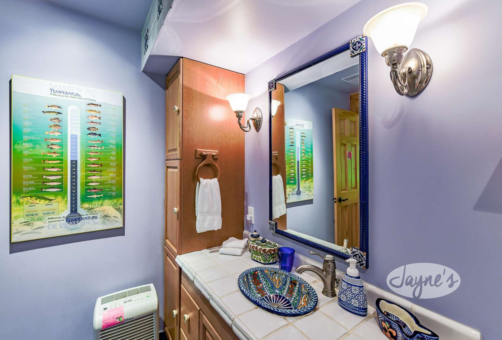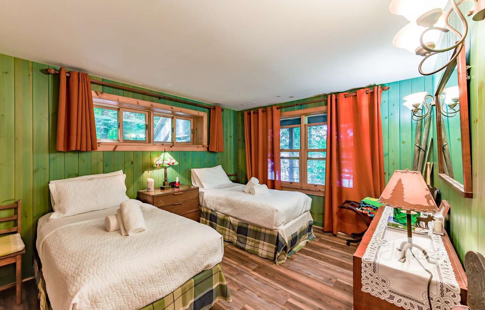 A nice sitting area with leather couches rests on the lower level of the guest cottage, as well as a walkout to the deck through glass doors. A large bedroom with two twin beds and a 3-piece bath with shower rounds out the lower level. Here you will find the washer and dryer. The upper level consists of a lovely living area with large windows, fireplace, TV and a small dining table. Adjacent to the living area is a kitchen with a fridge, sink, microwave, fridge, and plenty of counter space. Off of the kitchen are a Queen bedroom, a room with 2 twin bunk bedsdouble bunk-beds, and a 3-piece bathroom with a shower.