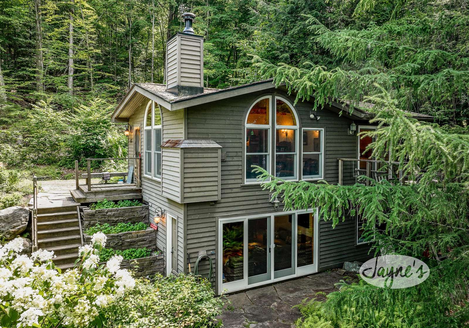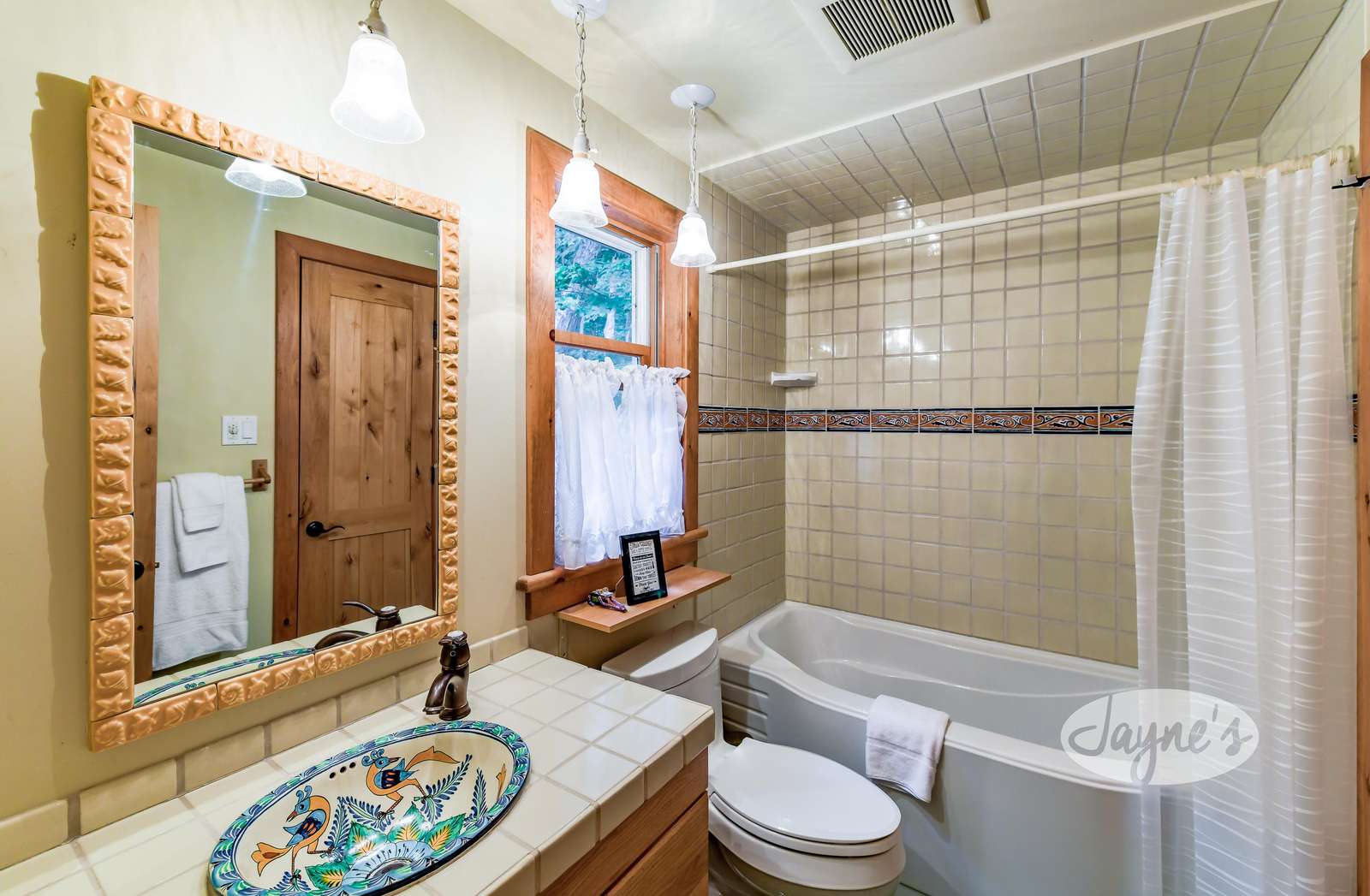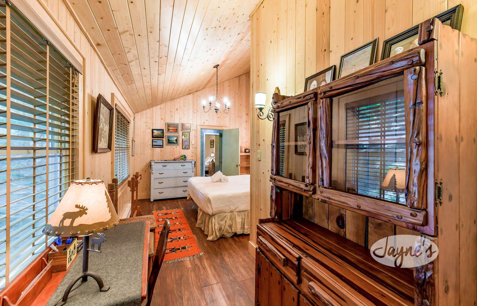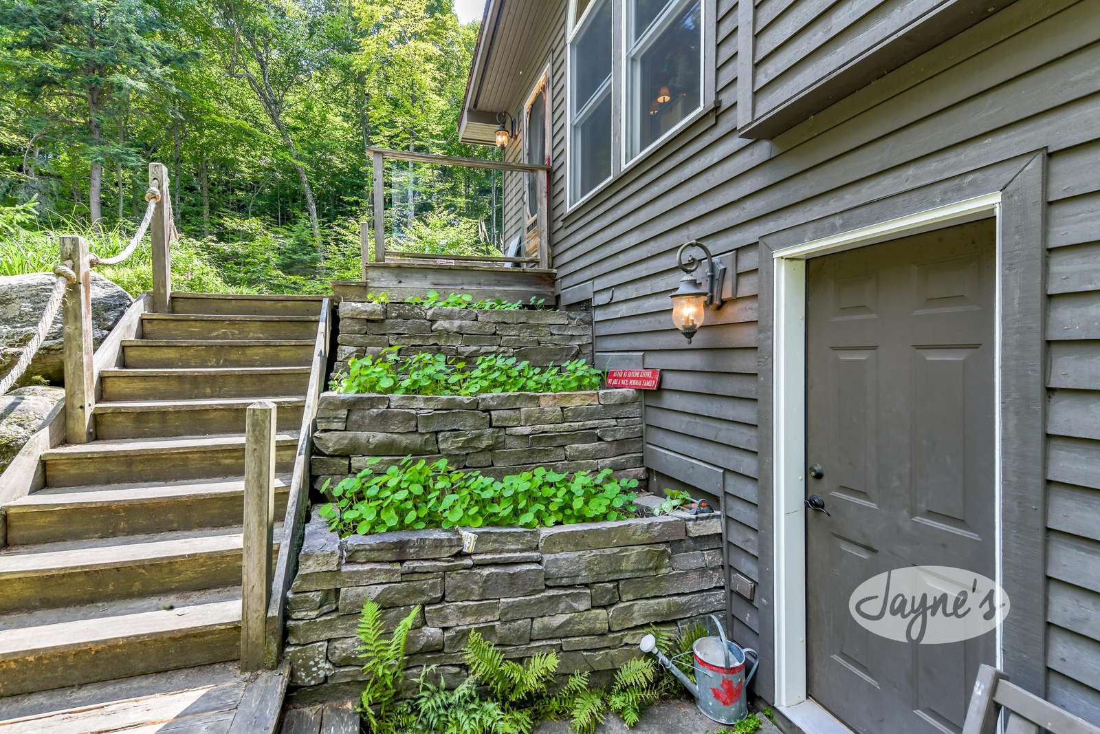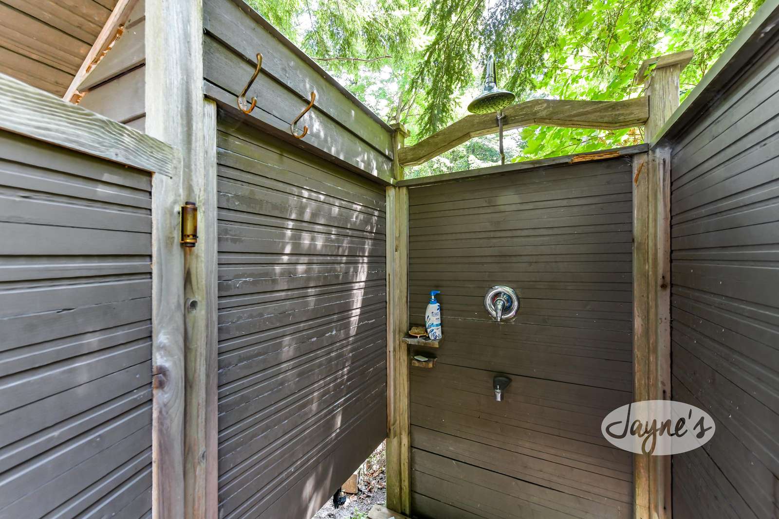 A nice sitting area with leather couches rests on the lower level of the guest cottage, as well as a walkout to the deck through glass doors. A large bedroom with two twin beds and a 3-piece bath with shower rounds out the lower level. Here you will find the washer and dryer. The upper level consists of a lovely living area with large windows, fireplace, TV and a small dining table. Adjacent to the living area is a kitchen with a fridge, sink, microwave, fridge, and plenty of counter space. Off of the kitchen are a Queen bedroom, a room with 2 twin bunk bedsdouble bunk-beds, and a 3-piece bathroom with a shower.