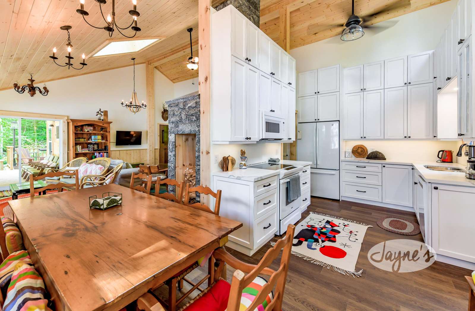 The kitchen is nice and bright with all white appliances. The dining room table seats eight but has room for more. The living room is a very cozy room that offers a wood-burning fireplace as well as a TV.