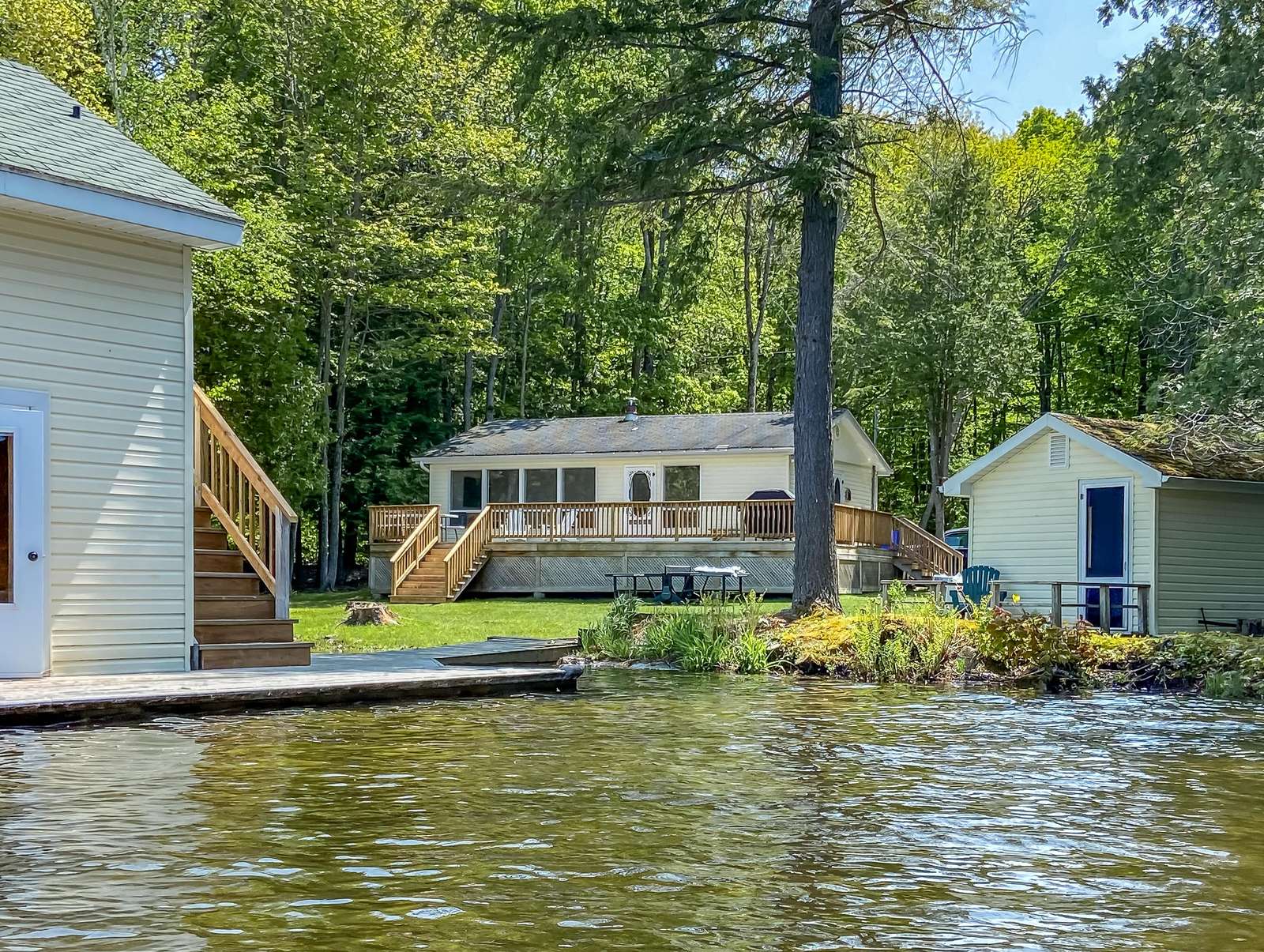 CASTAWAY - Drive right up to this picture-perfect Waterfront cottage just off Brackenrig Road. The level grassy land is great for kids to play and easy water access for all ages. The lovely decking at the front of the cottage provides lots of area to sit and read a book or use the new Weber BBQ and dine outside at one of the tables! Take a few steps across the lawn to the private waterfront with it's sandy, shallow walk-in. Fabulous views of the lake from the Clear Red Cedar Sauna! Off to one side of the waterfront is the Lakeside Bunkie and the single slip Boathouse with upper accommodations. Enjoy swimming, canoeing, peddle boating, paddle boarding, windsurfing, rowing or just floating in the 6 person dinghy!