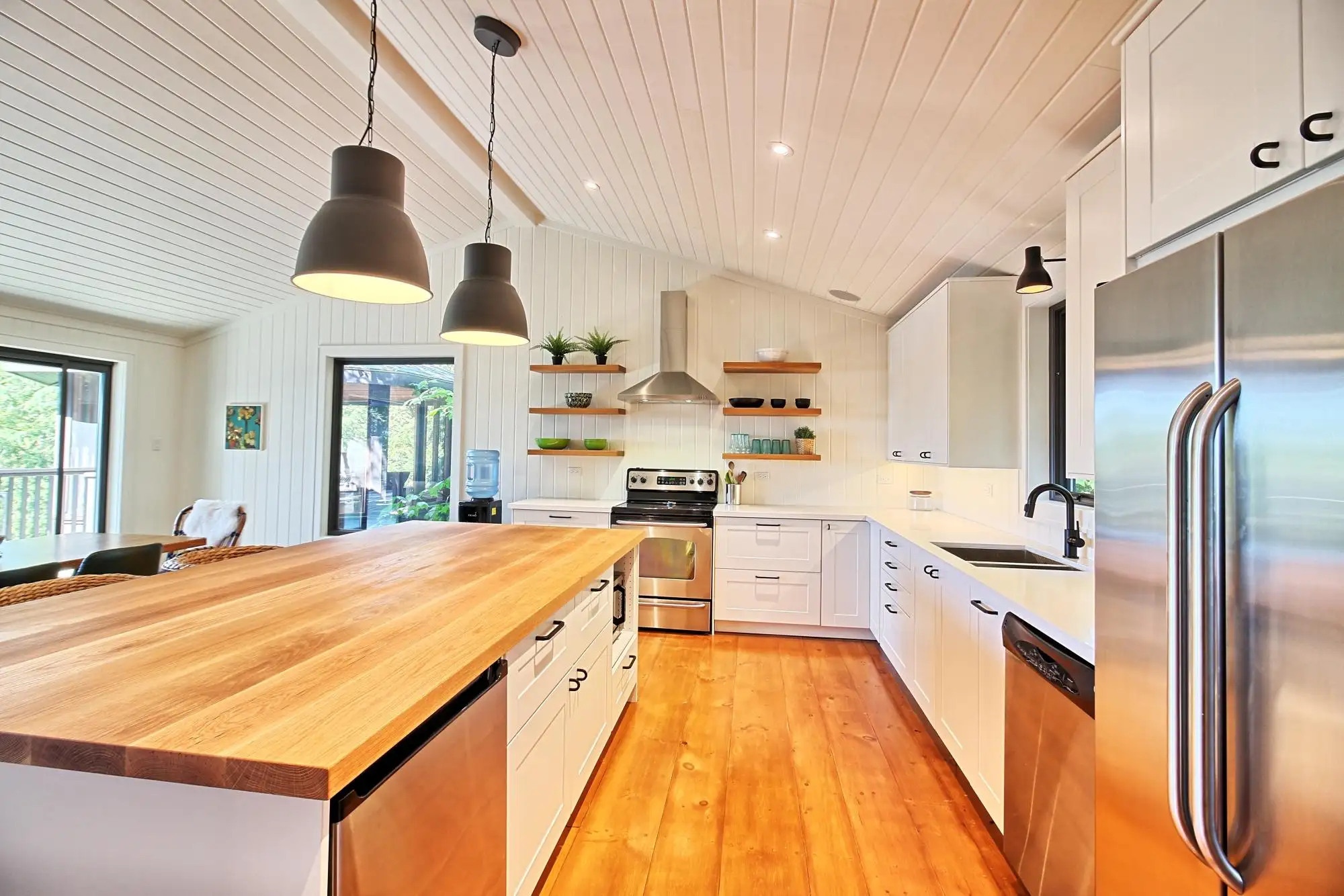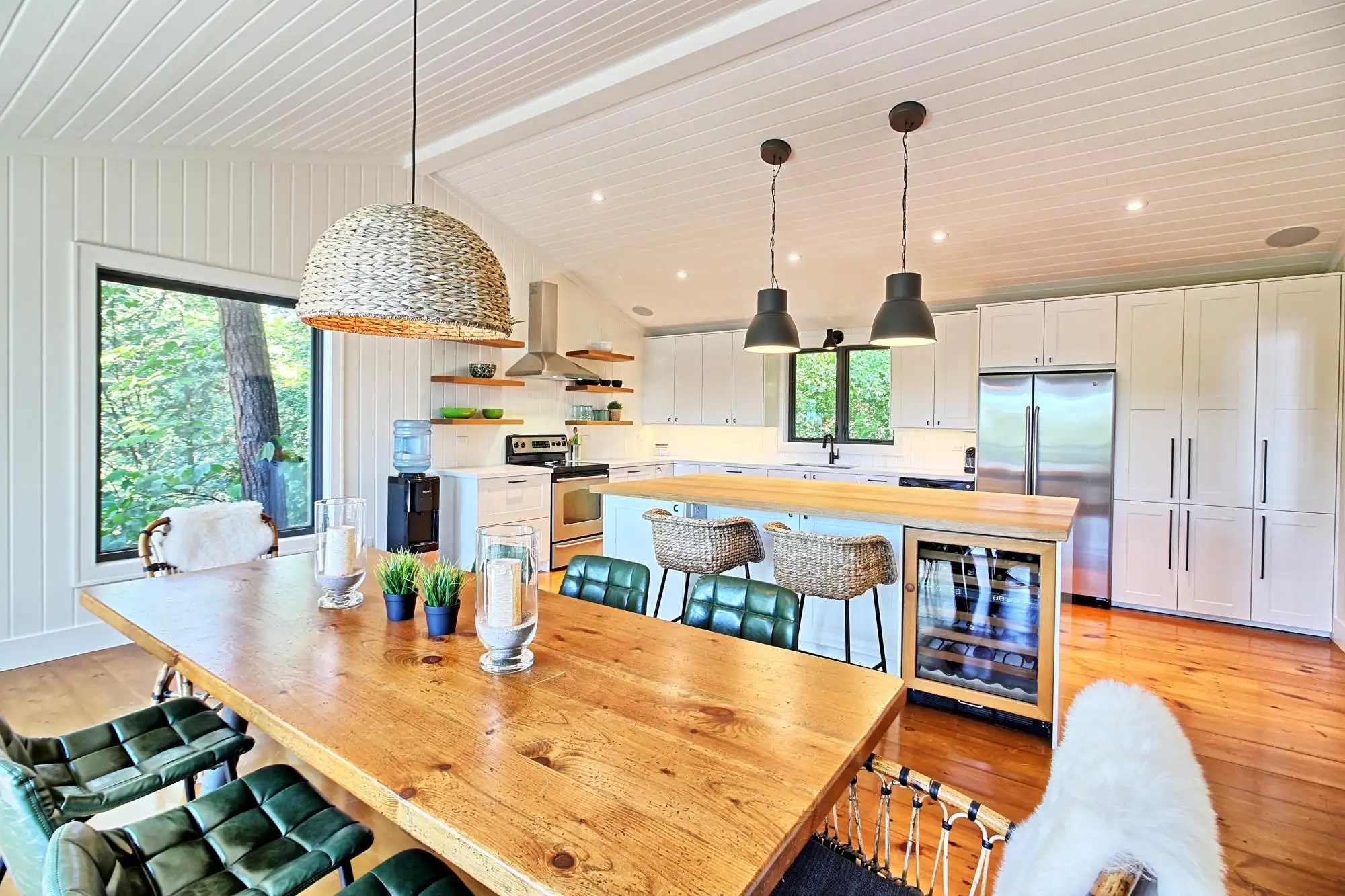 Newly updated chic spacious kitchen with high-end appliances, large island, and 2 bar stools