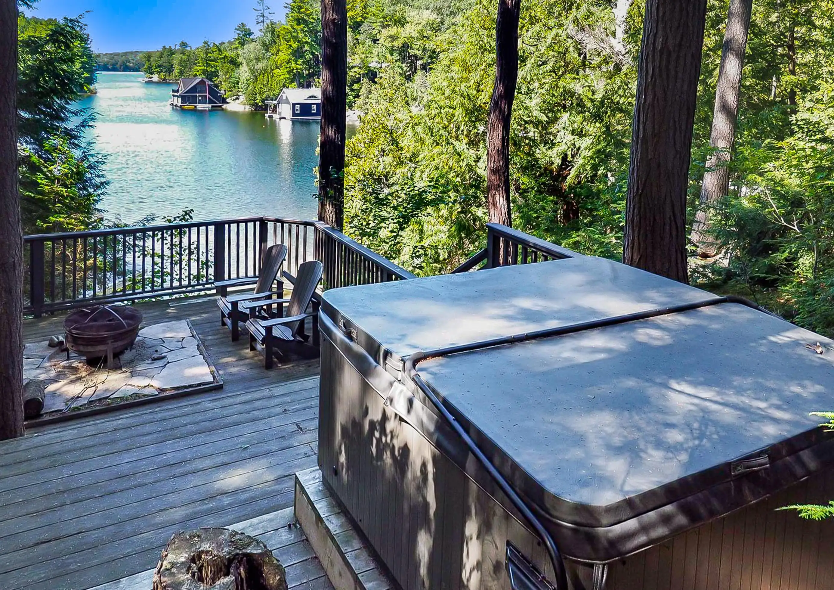 CHARDONNAY CHALET is the perfect place for enjoying the beautiful Muskoka days and the cozy Muskoka nights! There are not shortage of outdoor seating areas, head out from one of many sliding door entrances to the front deck with outdoor dining for 8 as well as 2 loungers. From there, access the screened-in Muskoka room/gazebo or head down to the lower deck with a hot tub or one of 4 Muskoka Chairs surrounding the firepit. At the water, there is a stone patio and a small sand beach as well as 2 lounge chairs and 4 Muskoka chairs on the boathouse dock. In the lower interior of the boathouse, there is a couch, 2 chairs, a coffee table, water cooler, and mini fridge and small serving area - a perfect place to get a quick break from the sun! Swimming for everyone here - shallower area by the sandy beach ideal for kids to play in, or it is 6' off the other side of the boathouse dock for deeper swimming and swimming out to the floating dock!