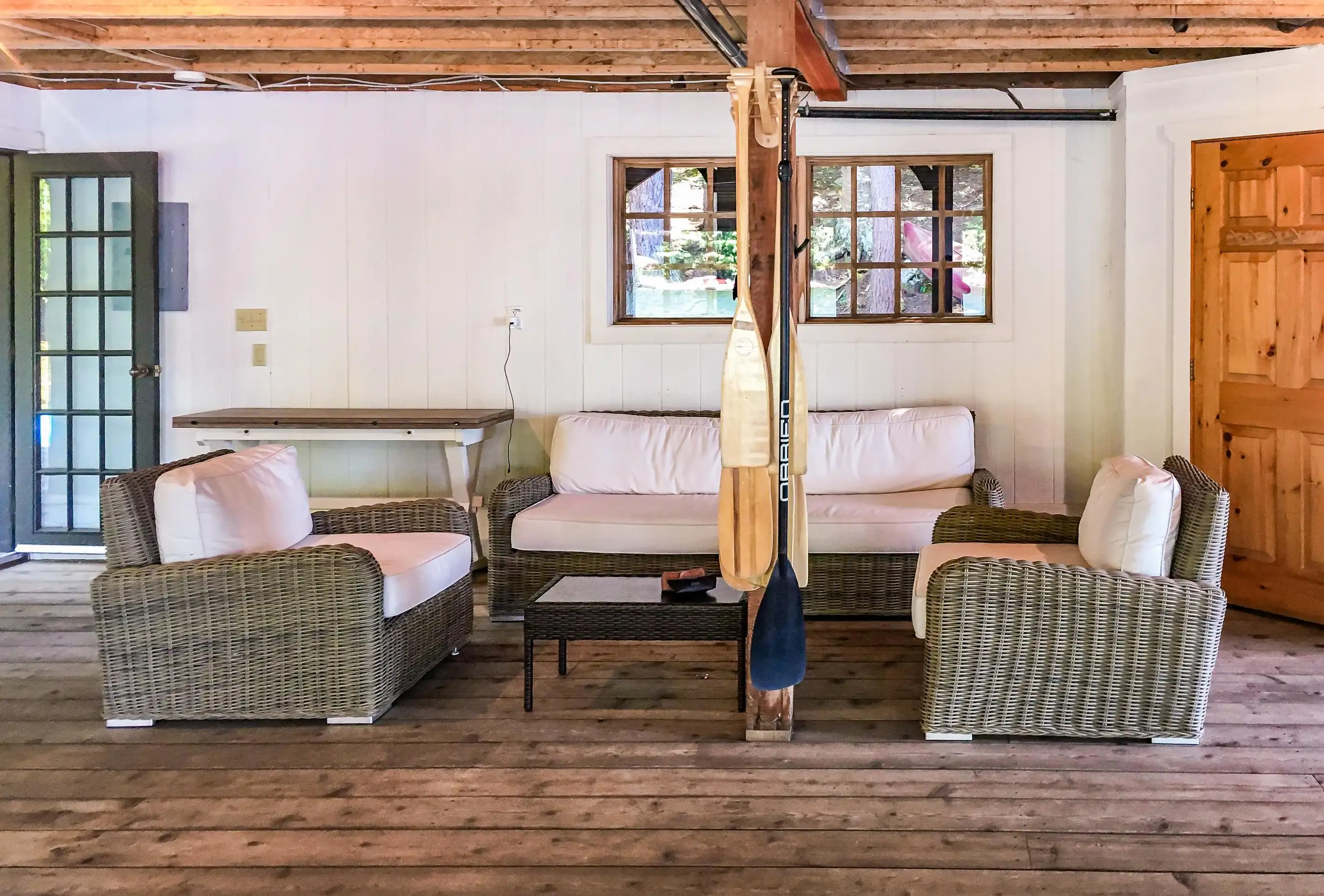 Upper boathouse living area includes a couch, breakfast table, kitchenette with mini-fridge and sink