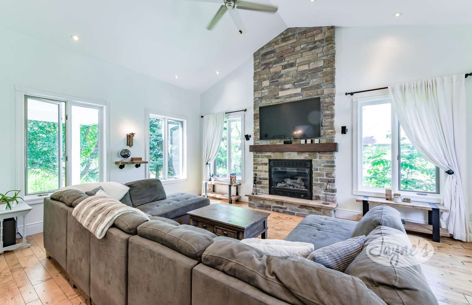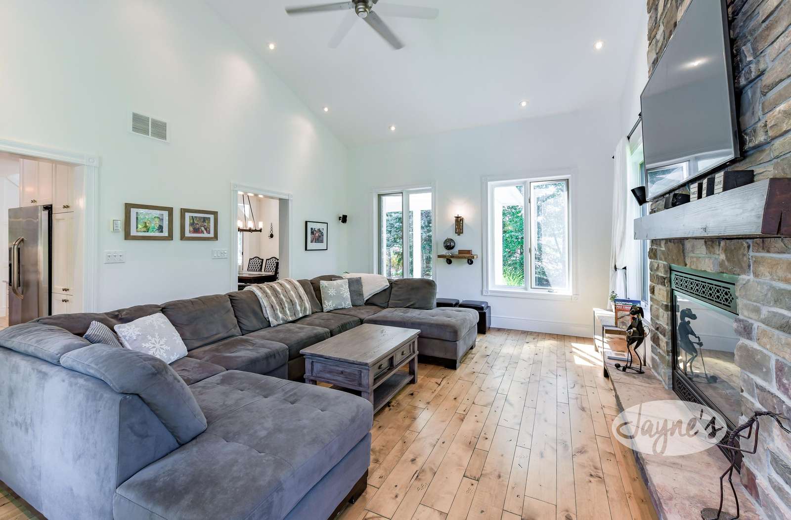 Cozy space to gather with large, comfy sectional sofa that seats 6, surrounding a large TV mounted above a gas fireplace.