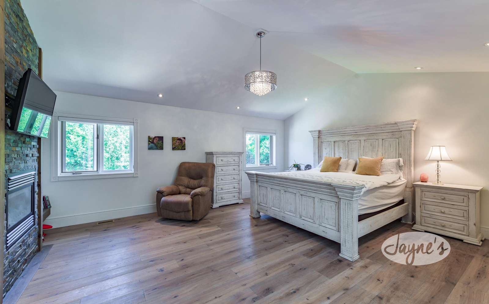 Bedroom 1 - King (Primary) with ensuite, TV, gas fireplace, walk-in closet and seating area