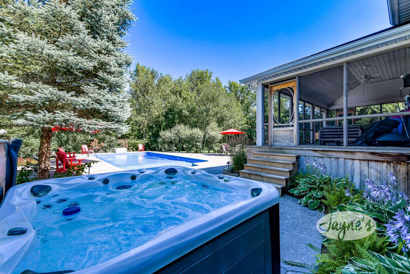 Step down to the hot tub from the 3-sided Muskoka Room wth pretty views out to the pool and back yard.