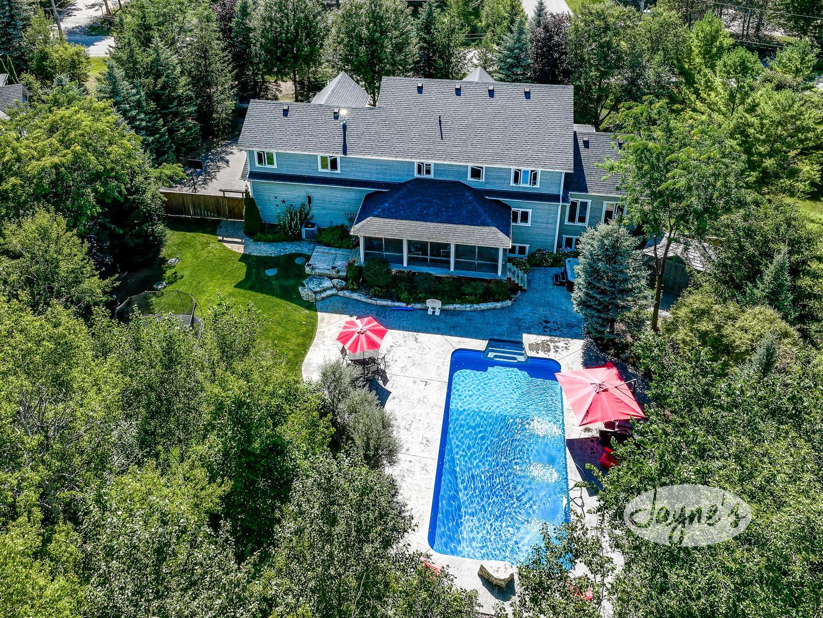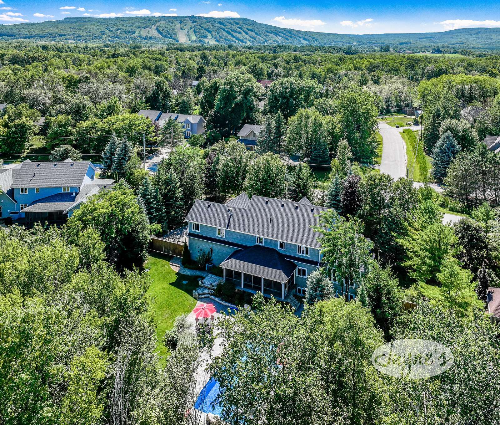COLLINGWOOD HOMESTEAD - Your adventure begins as you pull up to this picturesque home with mature evergreens providing rare privacy on a quiet, dead-end road. An inviting front deck greets you with Muskoka chairs welcoming you to stay a while. The beautifully landscaped back yard offers a perfect play space for kids - big and little - including a hot tub, outdoor dining area, lounge chairs and a sparkling pool for summer visits. The Muskoka Room offers peaceful evenings together and easy access to the hot tub.