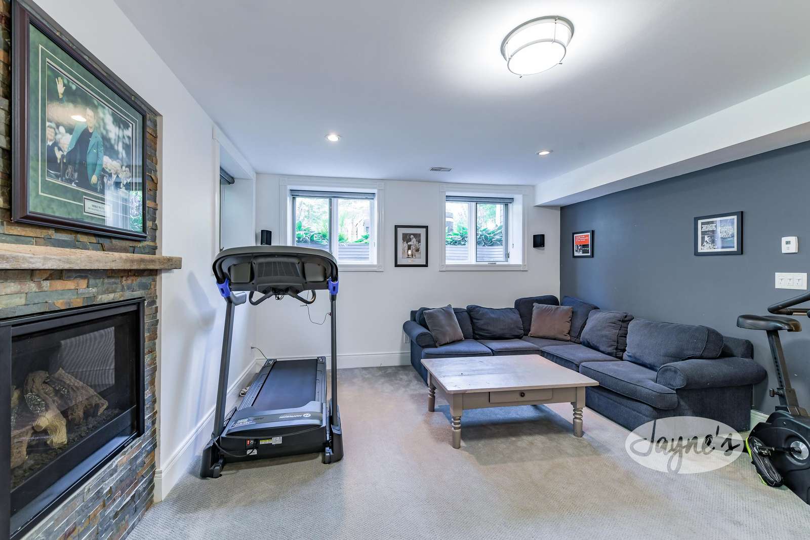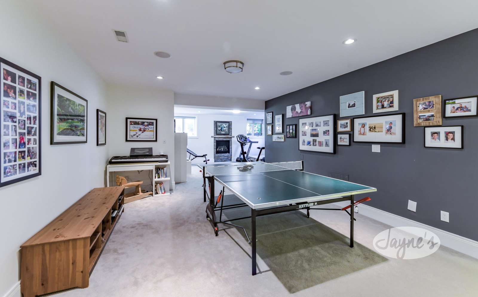 Open and relaxed recreation room with carpeting throughout, a ping pong table and exercise area with stationary bike, and treadmill. The warm gas fireplace and TV are surrounded by a comfortable sectional sofa with seating for 4.