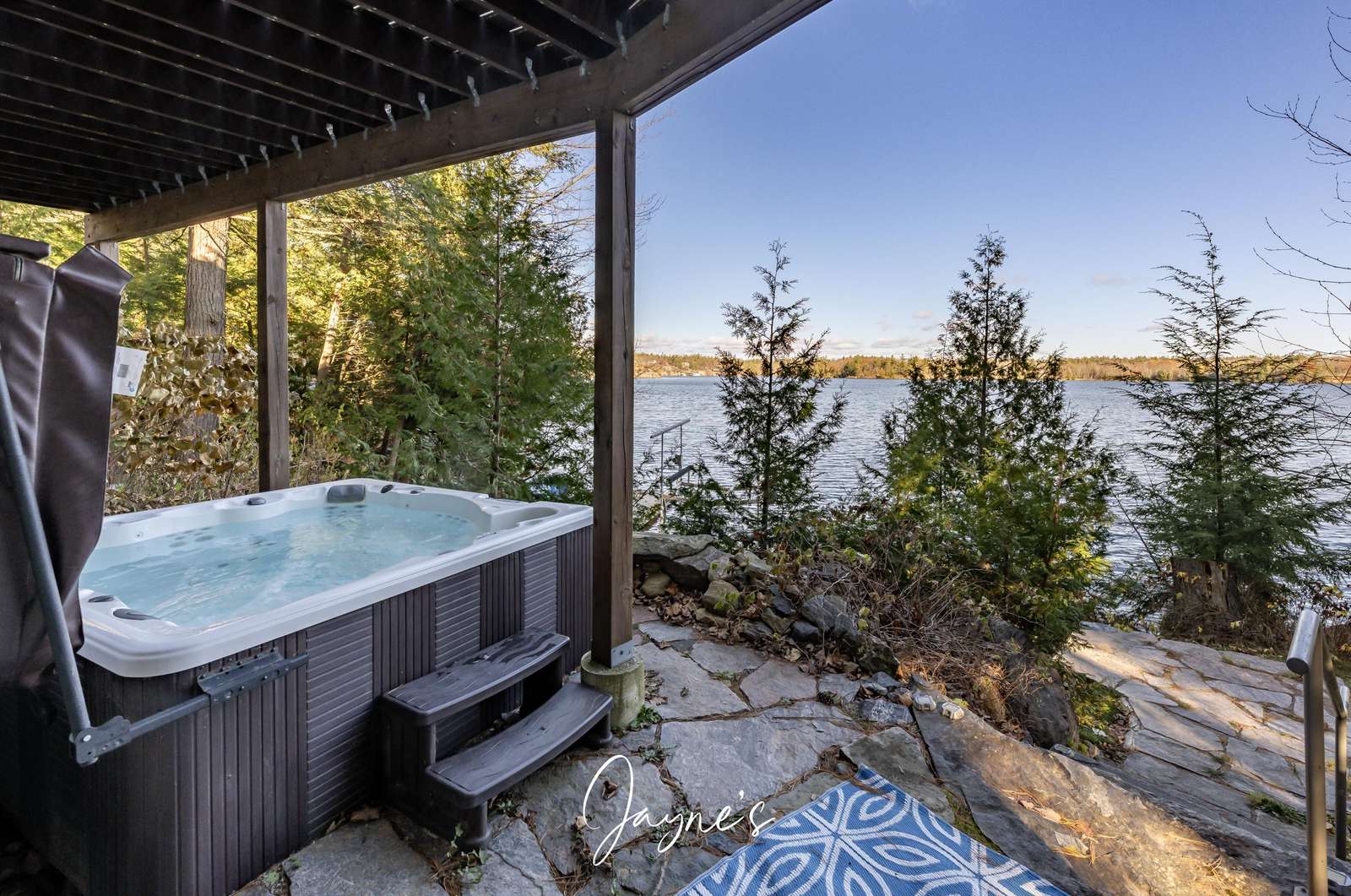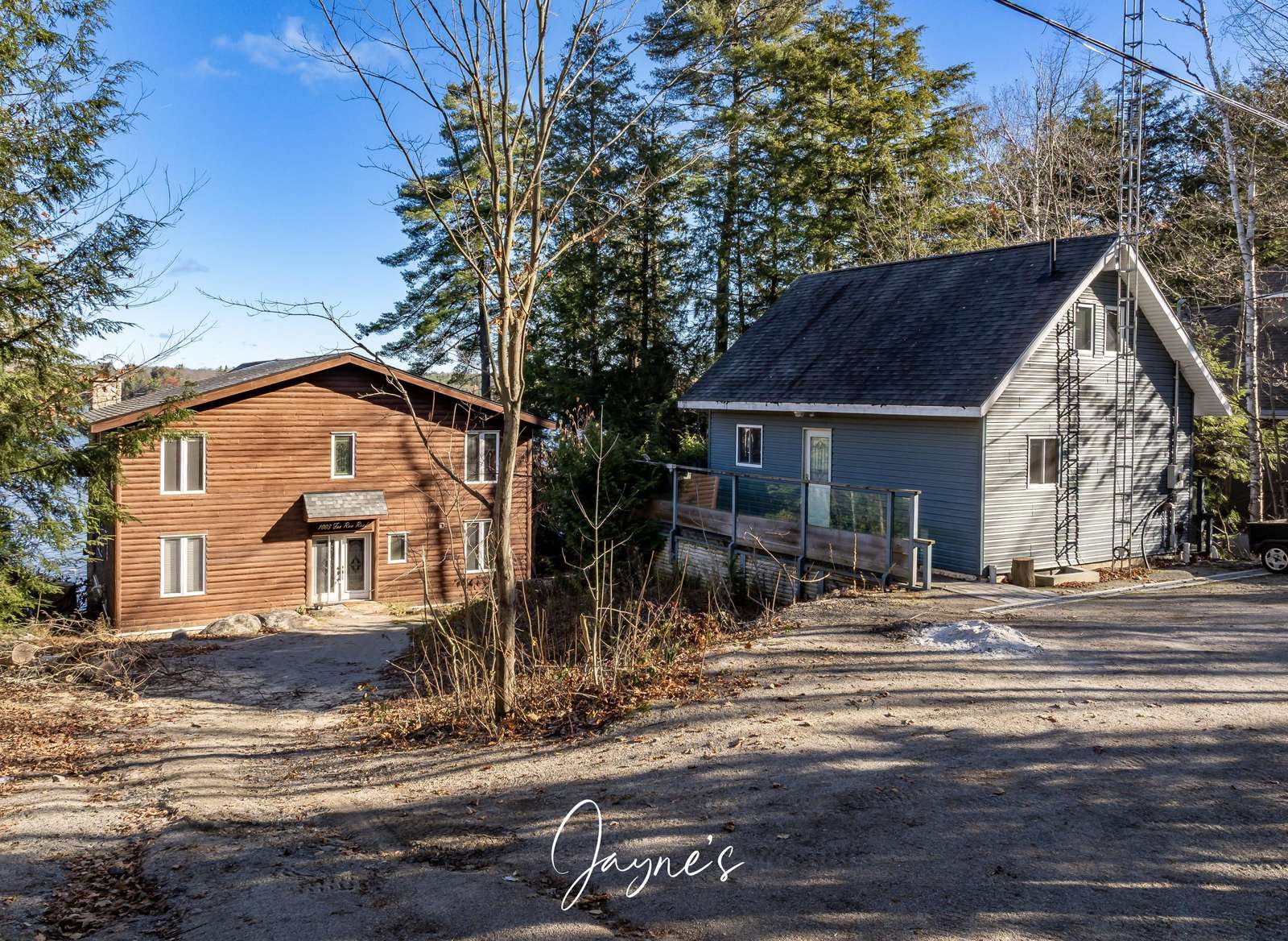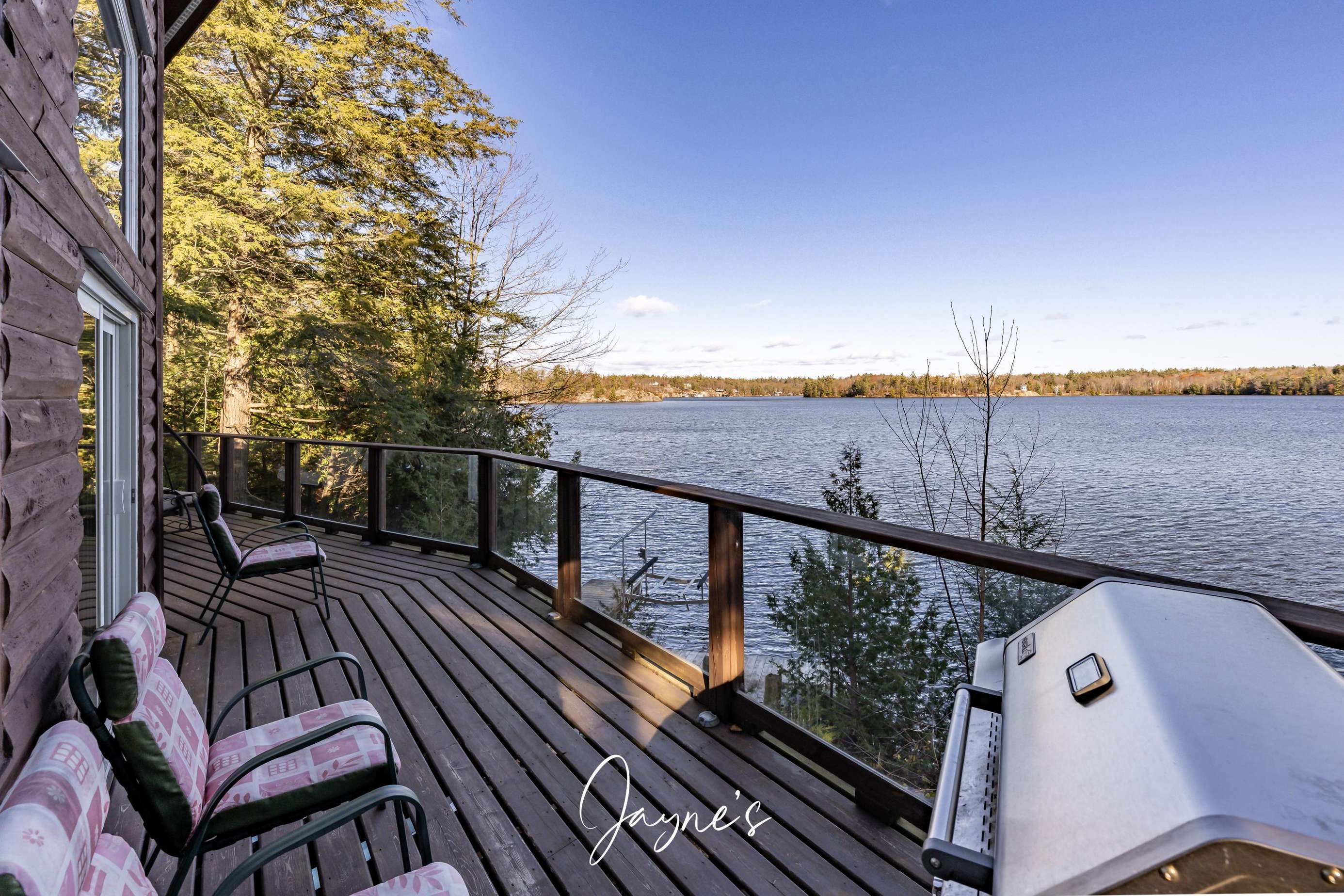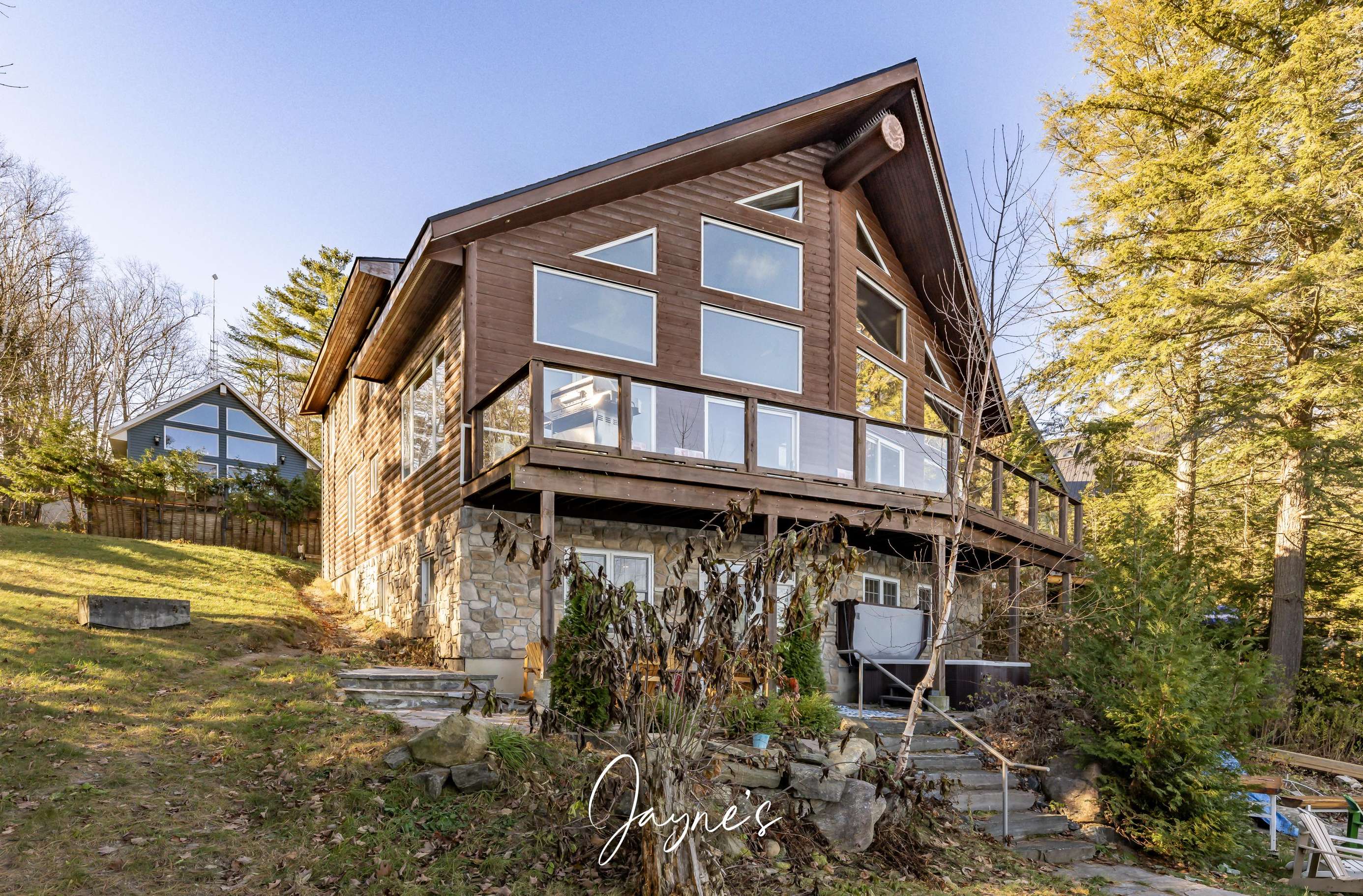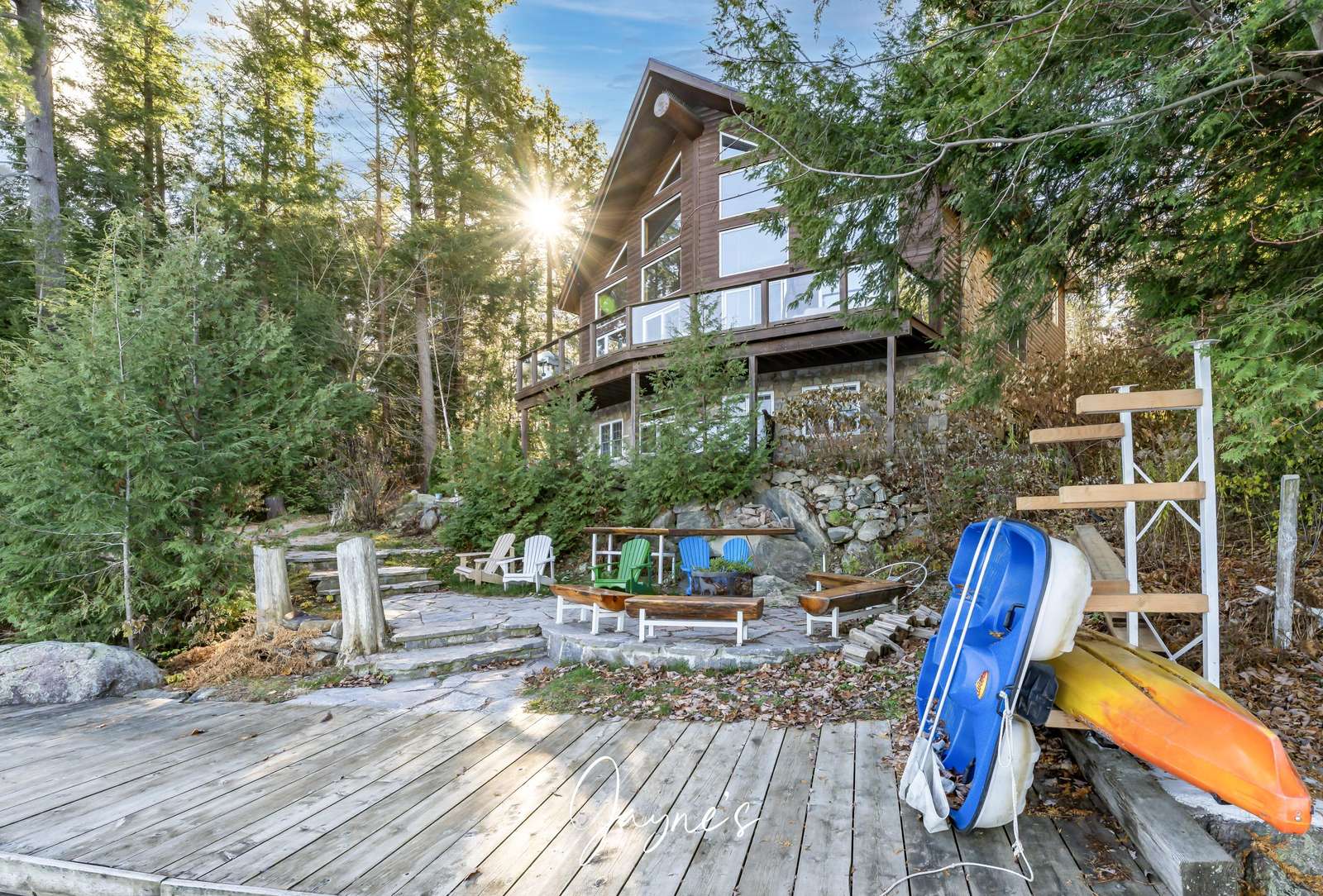 COMFORT ZONE - This exquisite four-bedroom, three-bathroom main cottage features a thoughtfully designed open concept layout that seamlessly integrates living spaces while enhancing the sense of spaciousness. The inviting loft area serves as an ideal retreat for relaxation or recreational activities. An expansive upper deck provides breathtaking views, while the charming patio is complemented by a luxurious hot tub, perfect for unwinding after a day of outdoor adventures. A brief stroll leads to the waterfront, where residents can indulge in various water sports and utilize the convenient boat lift for docking. Additionally, the two-storey bunkie offers a multifunctional space, complete with a kitchenette, a cozy living area equipped with a fireplace, a bedroom, and a loft area, making it an excellent accommodation for guests. For further enjoyment, a well-appointed rec room resides below, ensuring ample opportunities for entertainment and leisure.